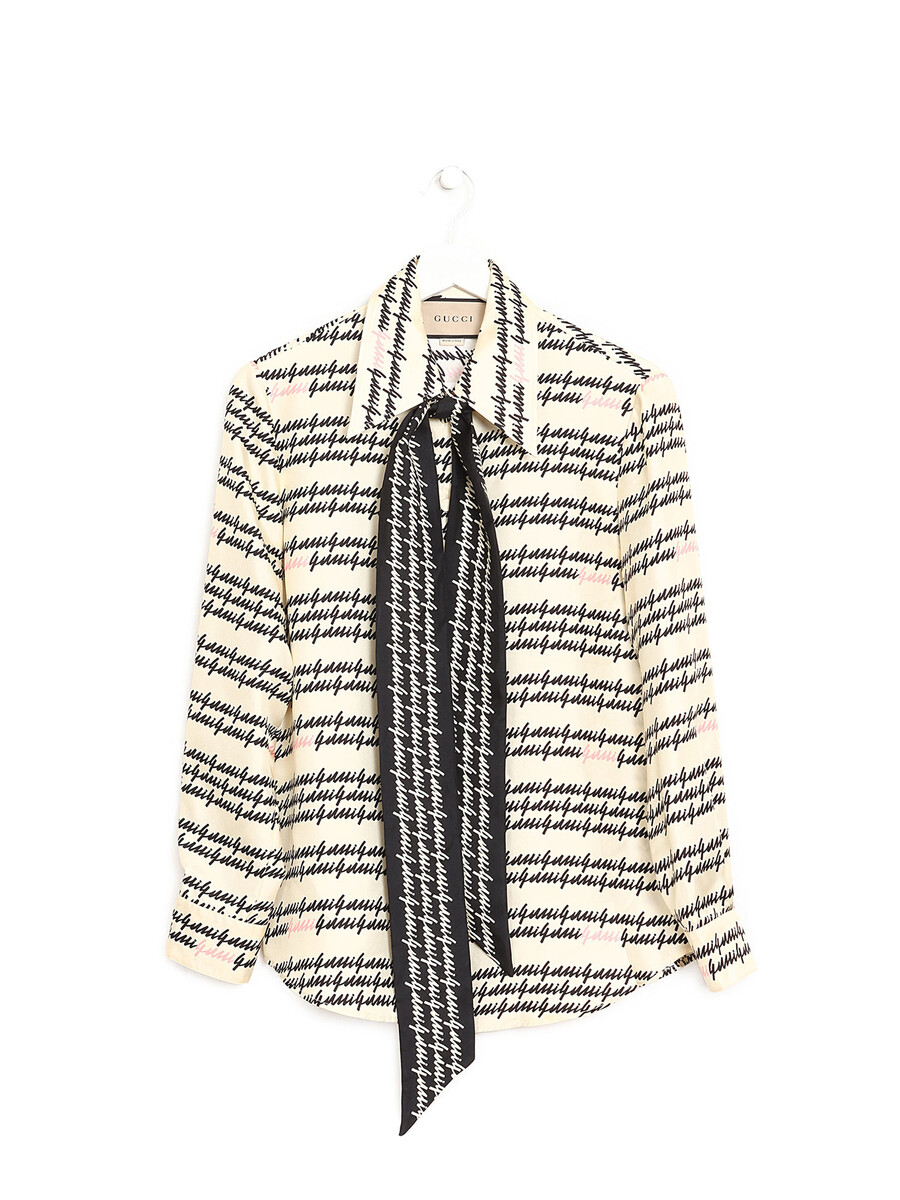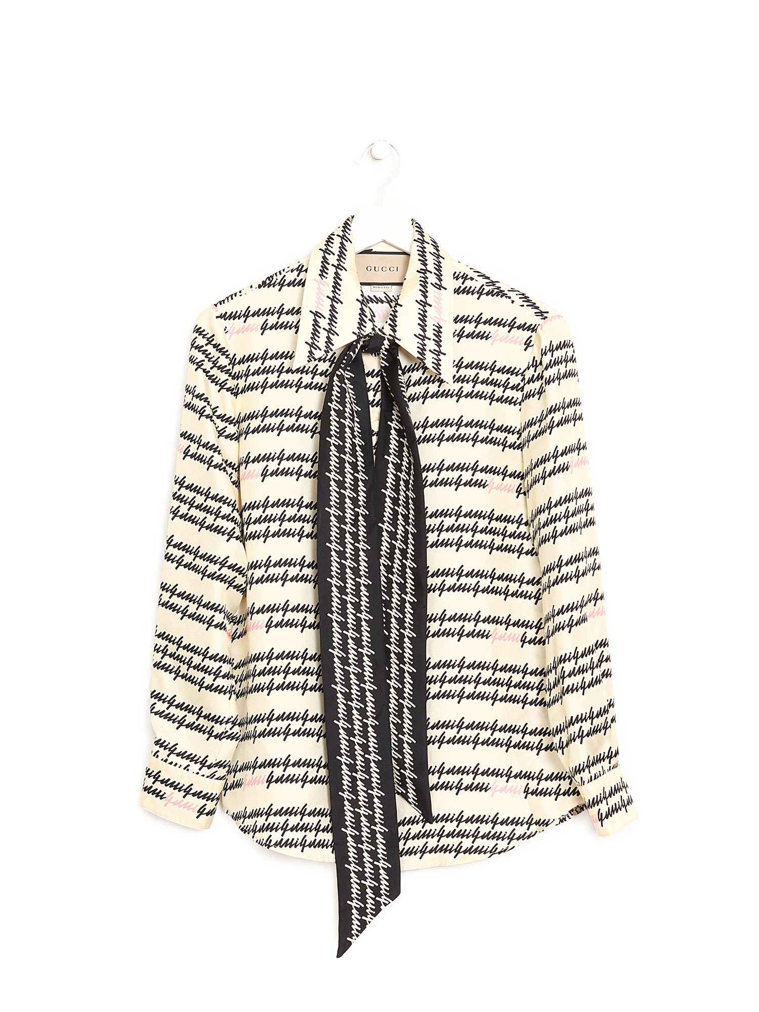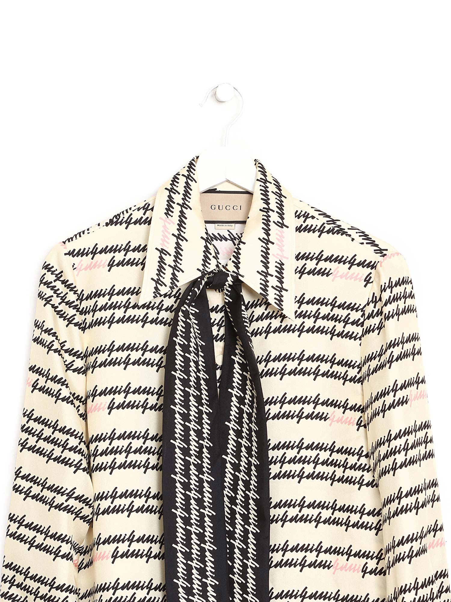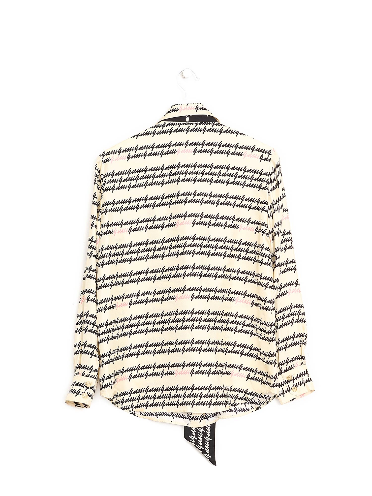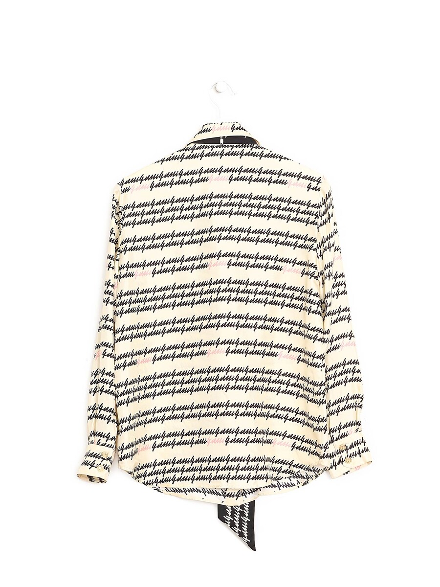 Chemise blanche à manches longues ornée d'un motif abstrait noir et creme. Col classique avec bande à nouer.