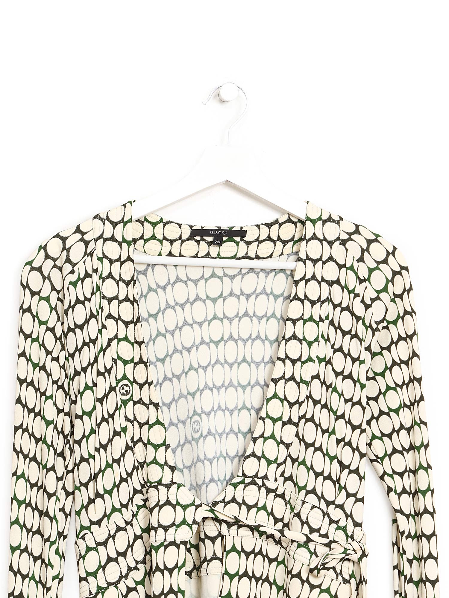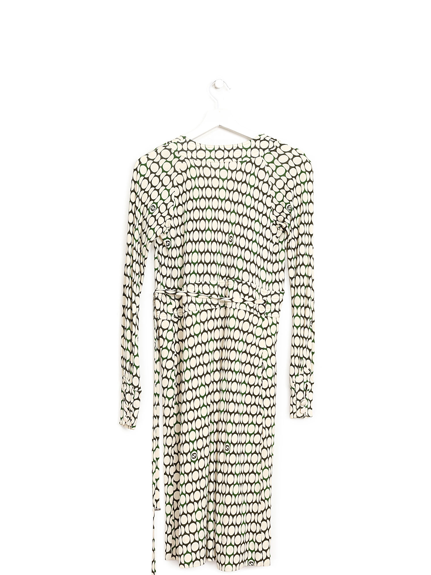 Robe midi portefeuille à manches longues avec un imprimé graphique géométrique audacieux dans une palette vive.
