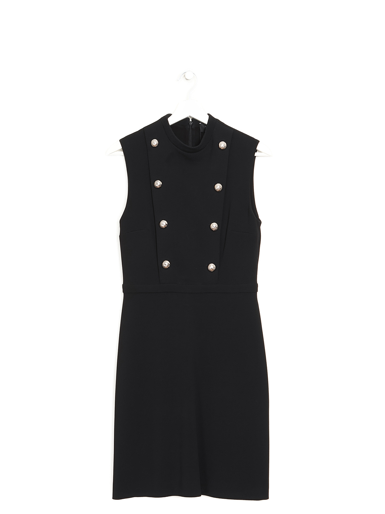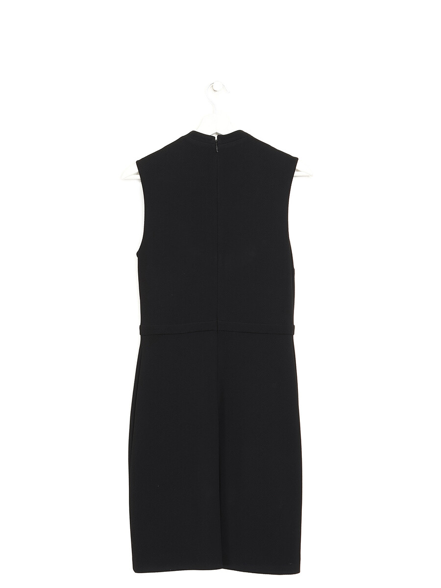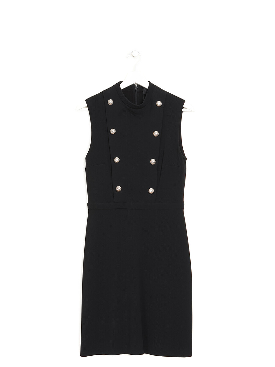 Robe sans manches en maille extensible noire. Boutons décoratifs ornant le devant. Encolure haute pour une allure élégante et sophistiquée.