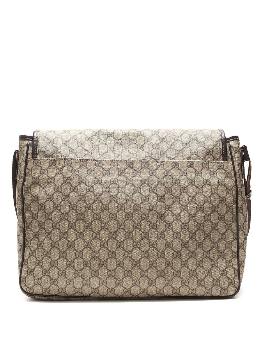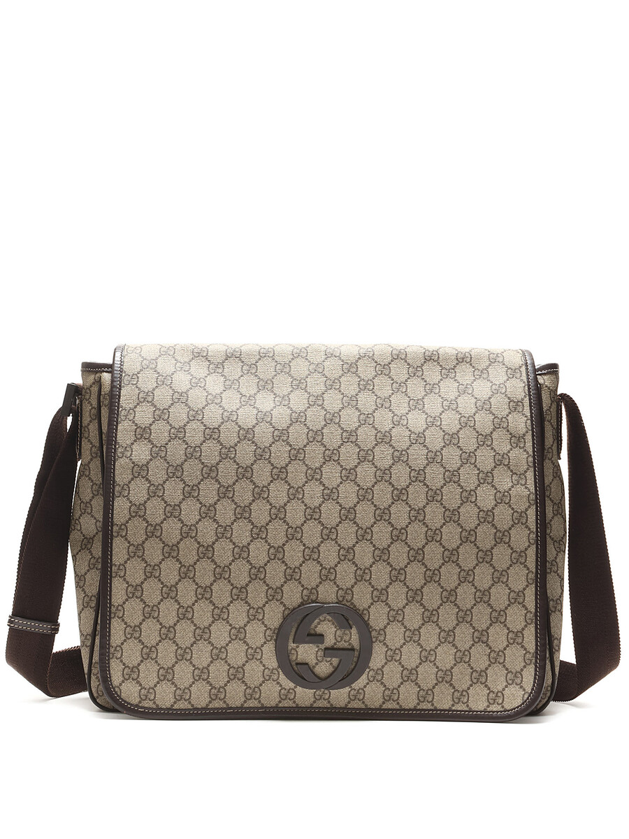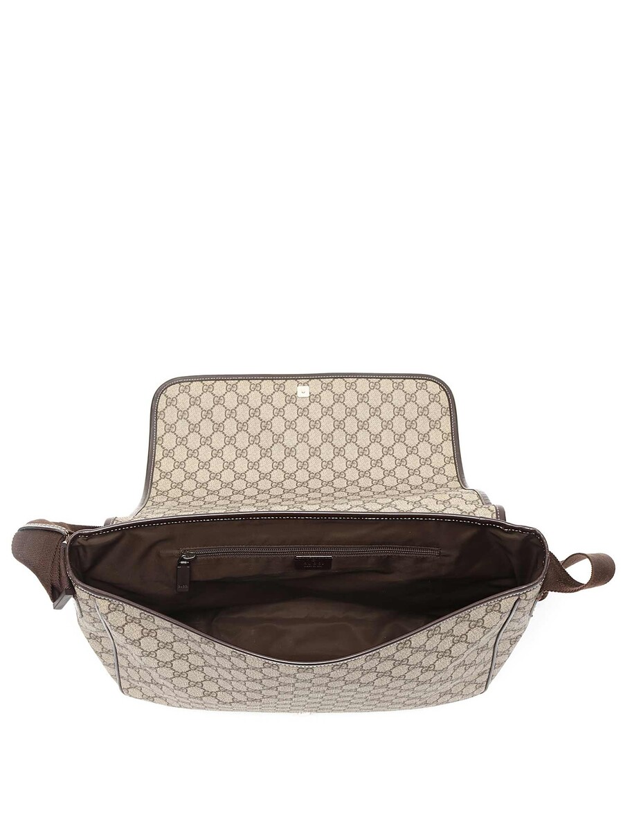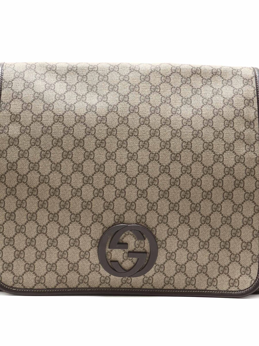 Sac messager en toile avec motif GG Monogram beige et détails bruns. Fermeture Velcro. Bandeau d'épaule ajustable en canvas. Finitions en cuir. Quincaillerie métallique.