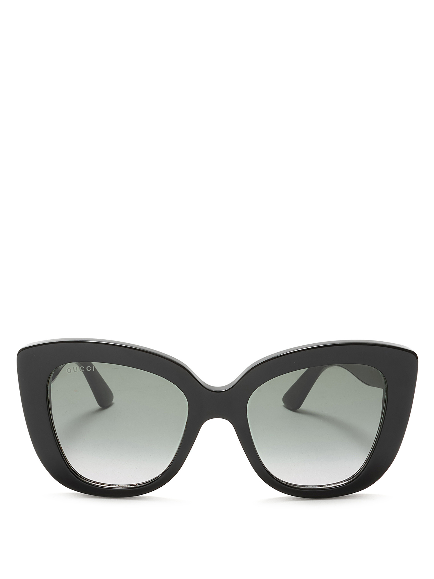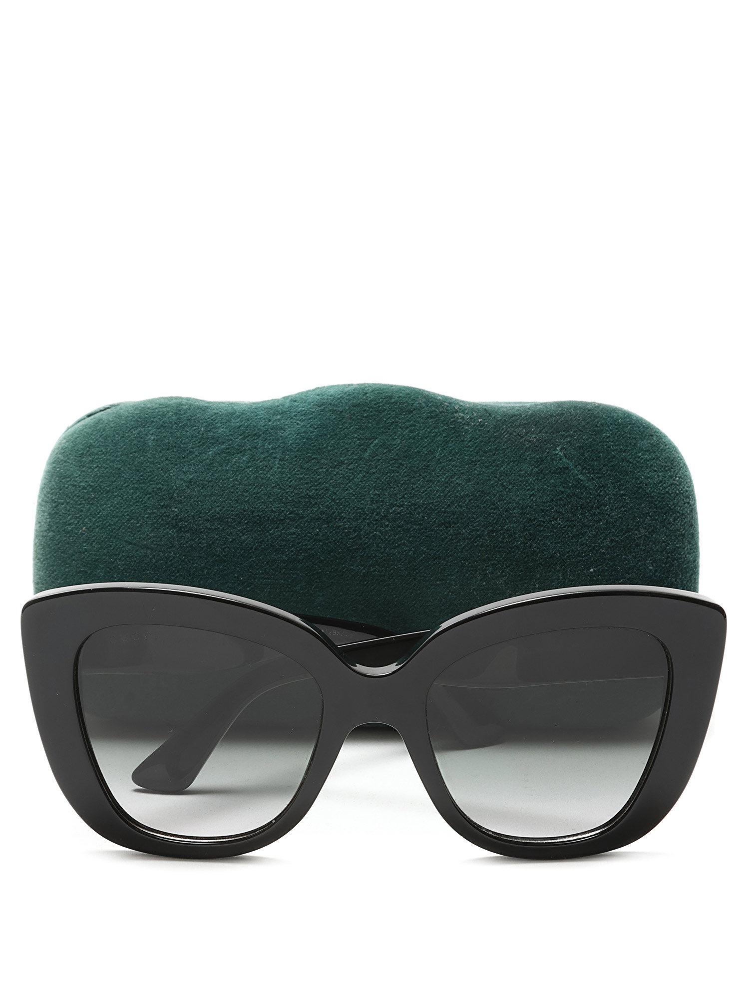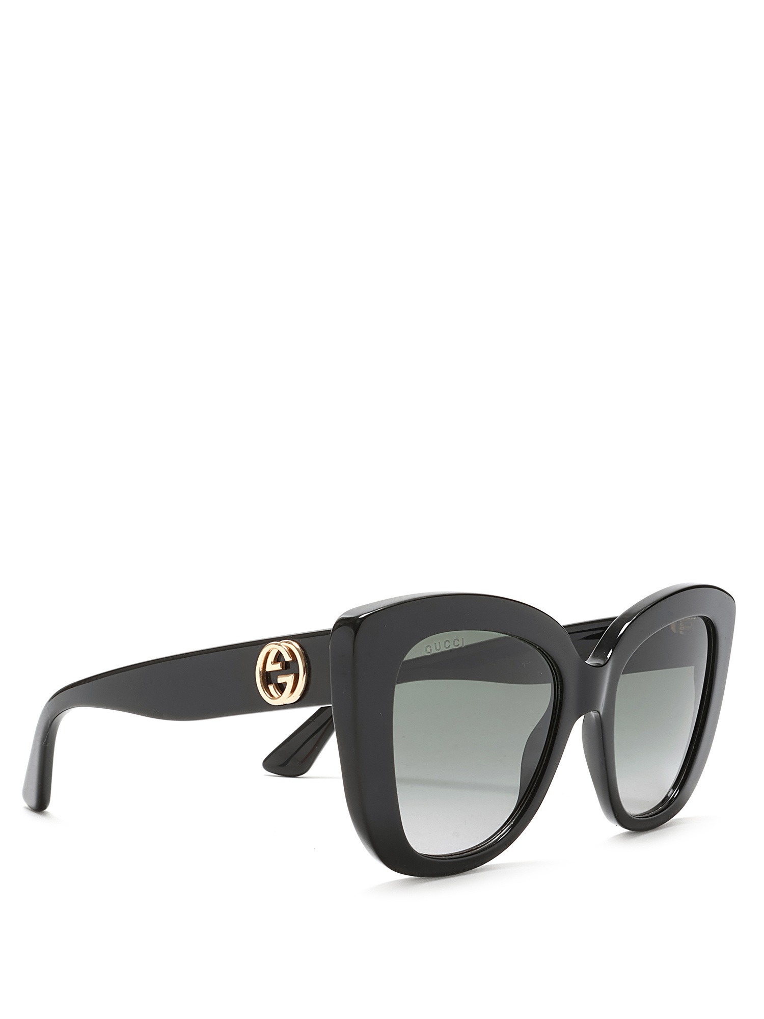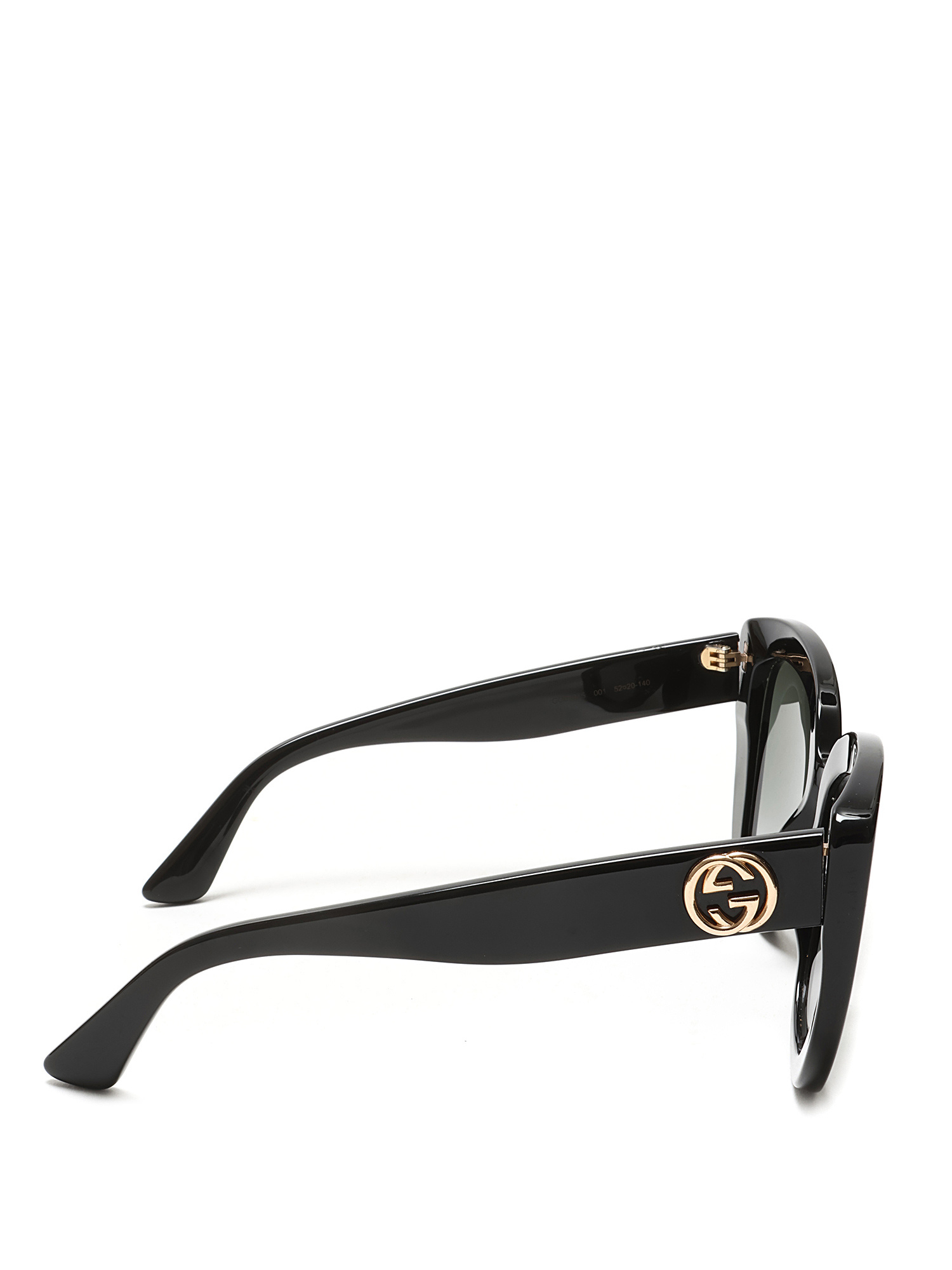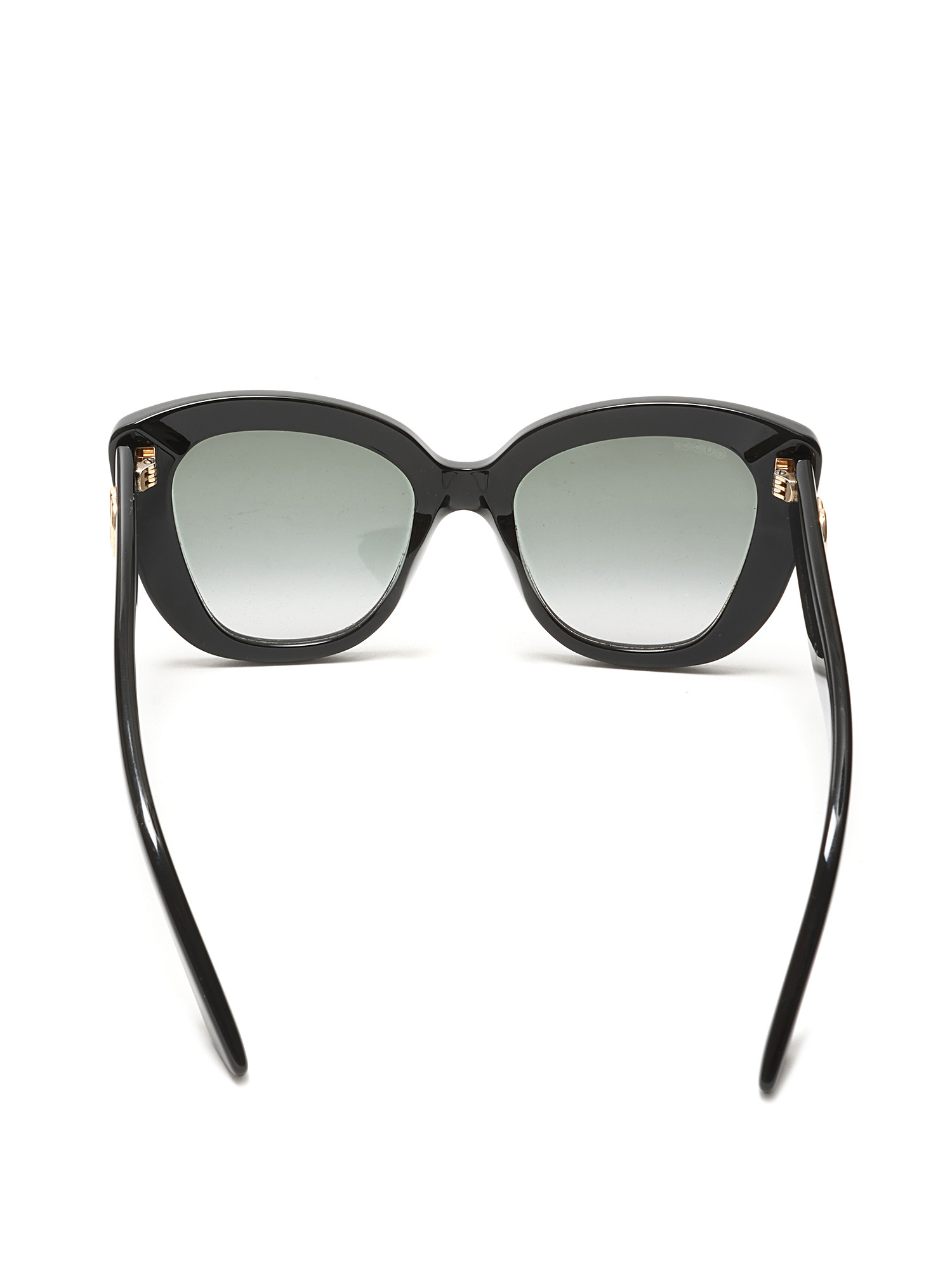 Lunettes de soleil en acétate noir avec logo doré sur les branches.