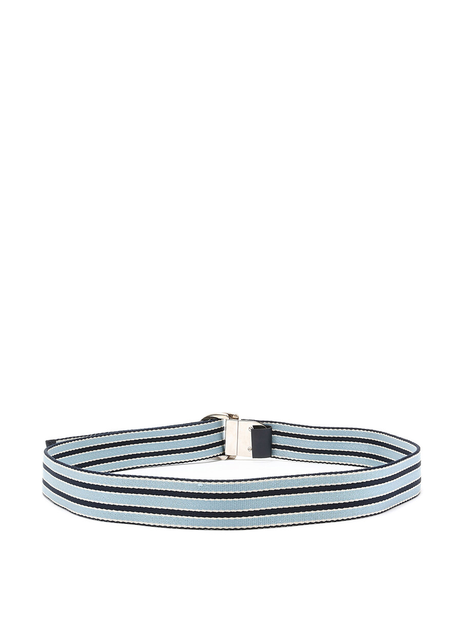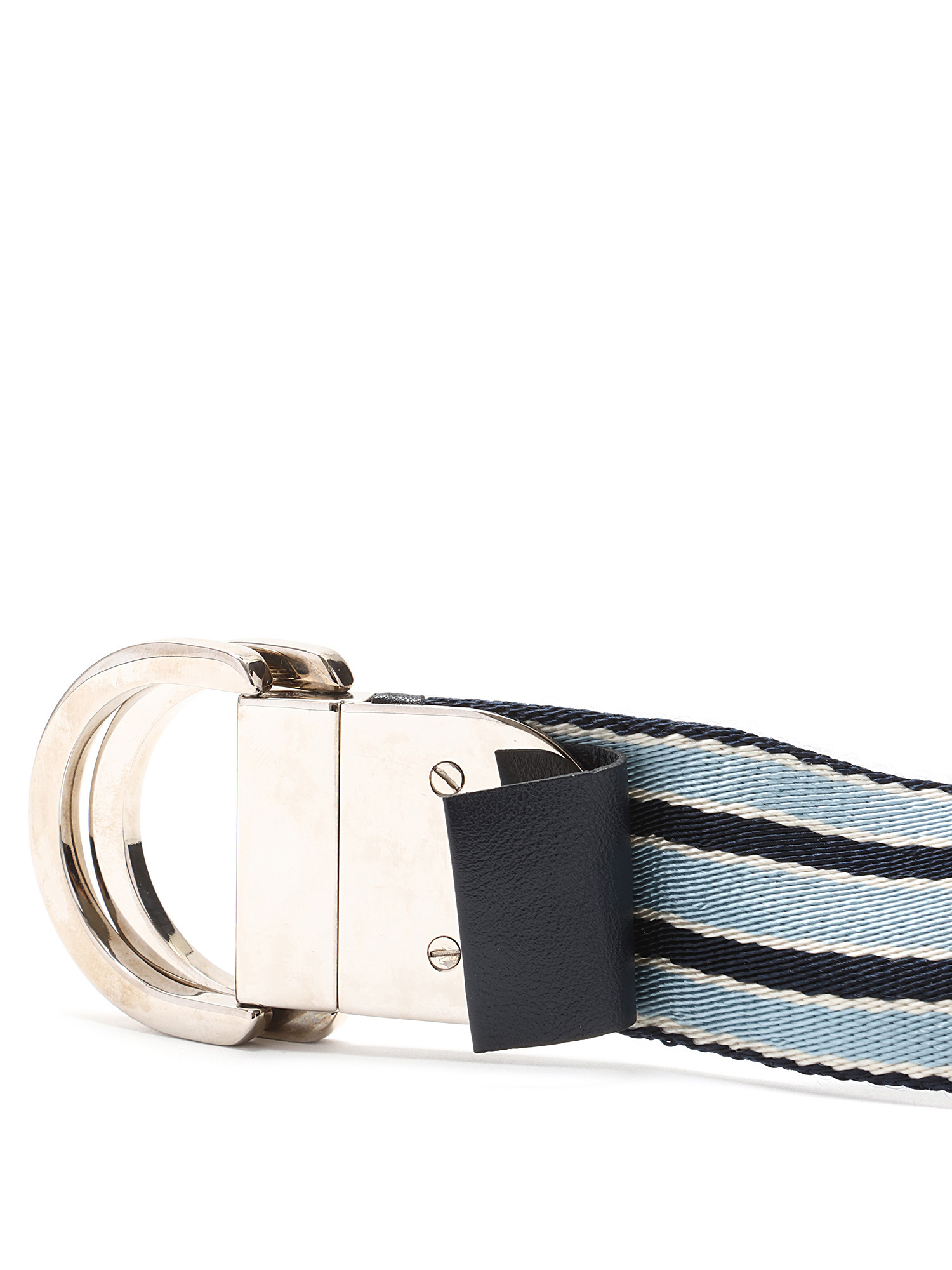Ceinture en tissu rayé et cuir, présentant la rayure signature Gucci en noir, bleu et blanc. Fermeture à boucle signature avec quincaillerie argentée gravée du logo Gucci.