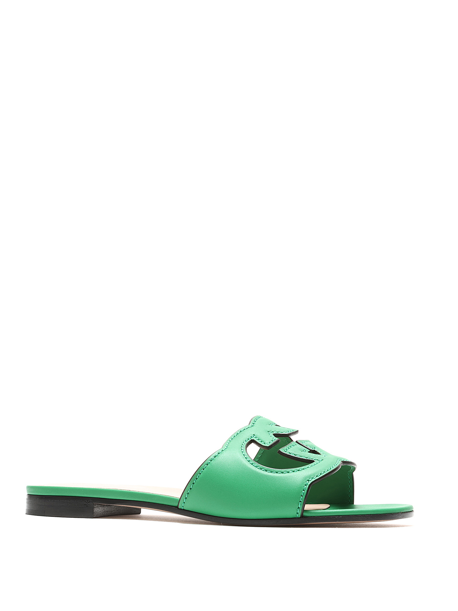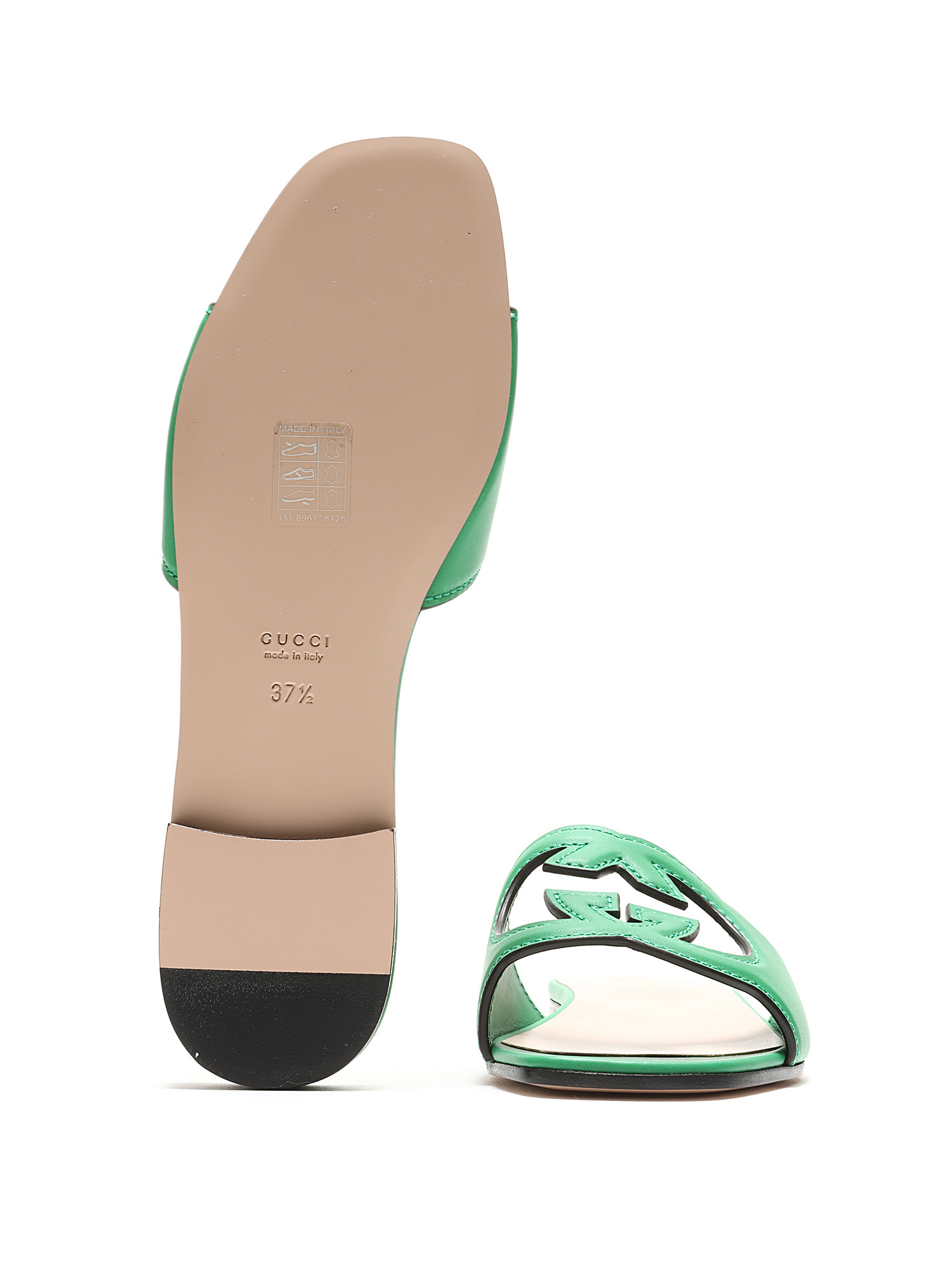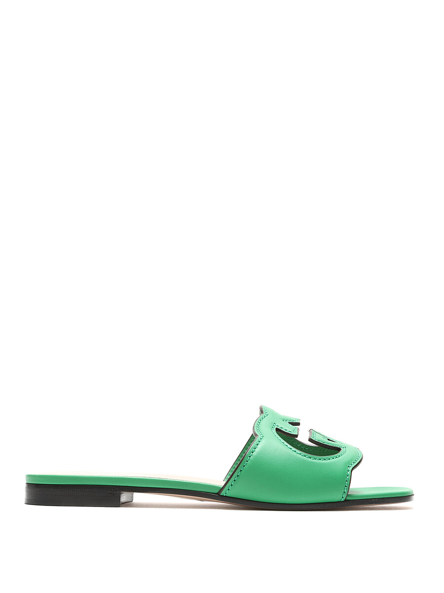 Sandales à enfiler en cuir vert avec découpe logo interlocking G. Bout ouvert avec semelle plate en cuir. Inclus sac de protection et boîte.