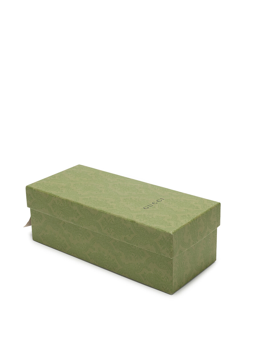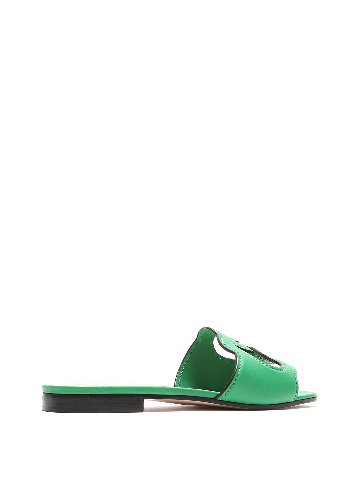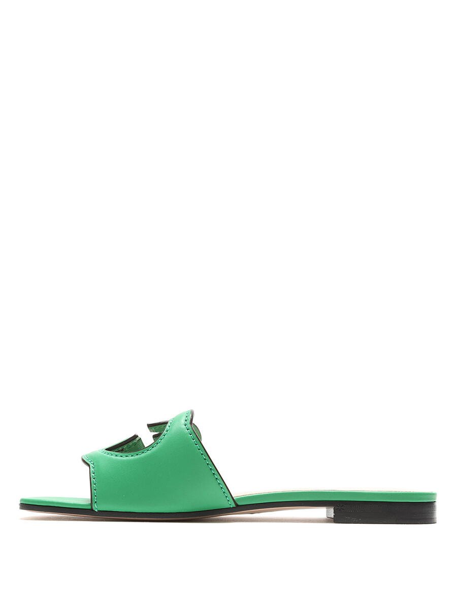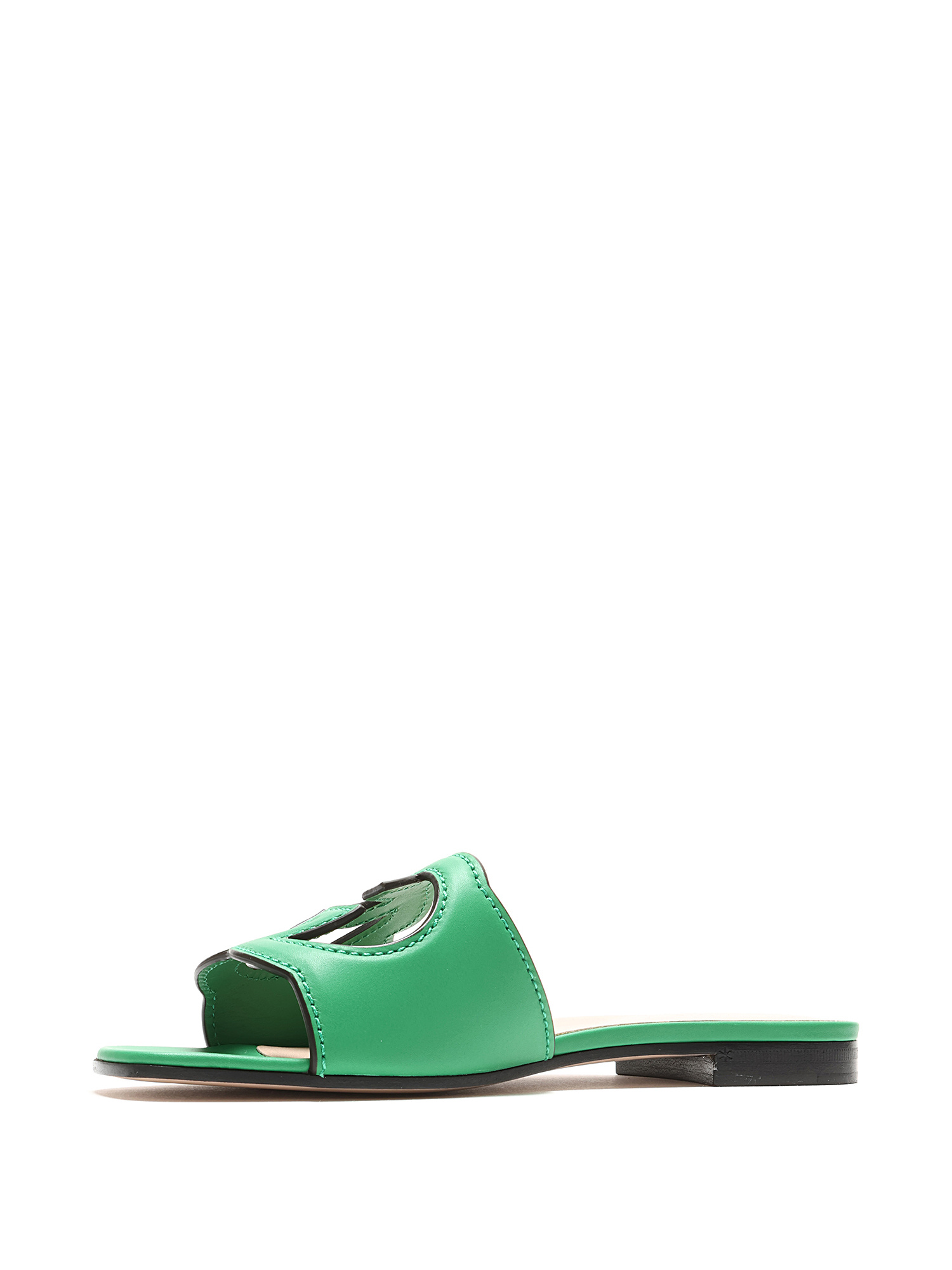 Sandales à enfiler en cuir vert avec découpe logo interlocking G. Bout ouvert avec semelle plate en cuir. Inclus sac de protection et boîte.