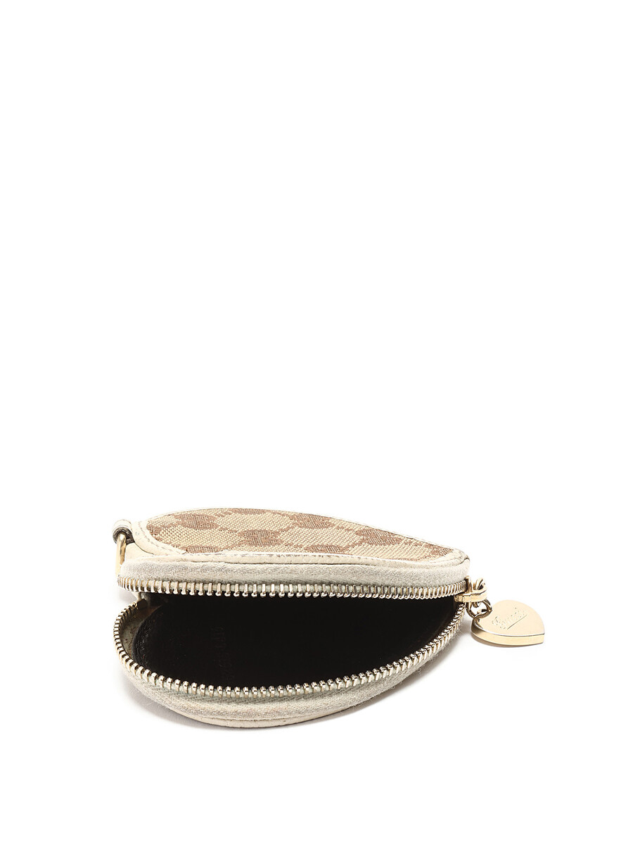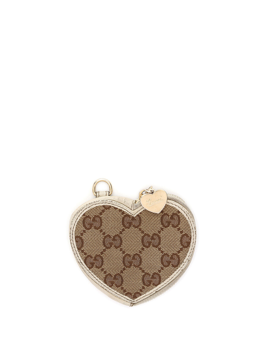 Porte-monnaie en forme de cœur avec le motif iconique GG en beige et brun. Fermeture à glissière. Quincaillerie dorée. Fabriqué en toile GG et bordures de cuir
