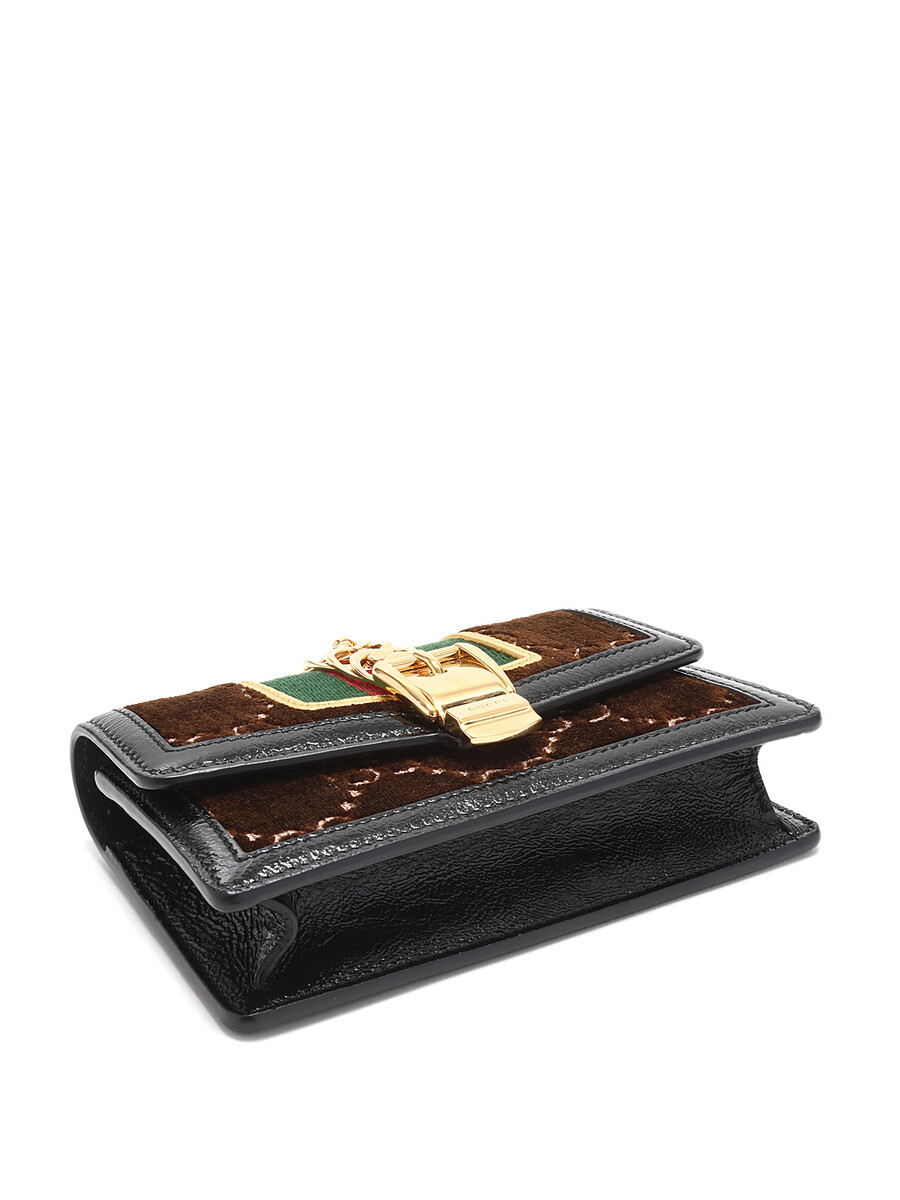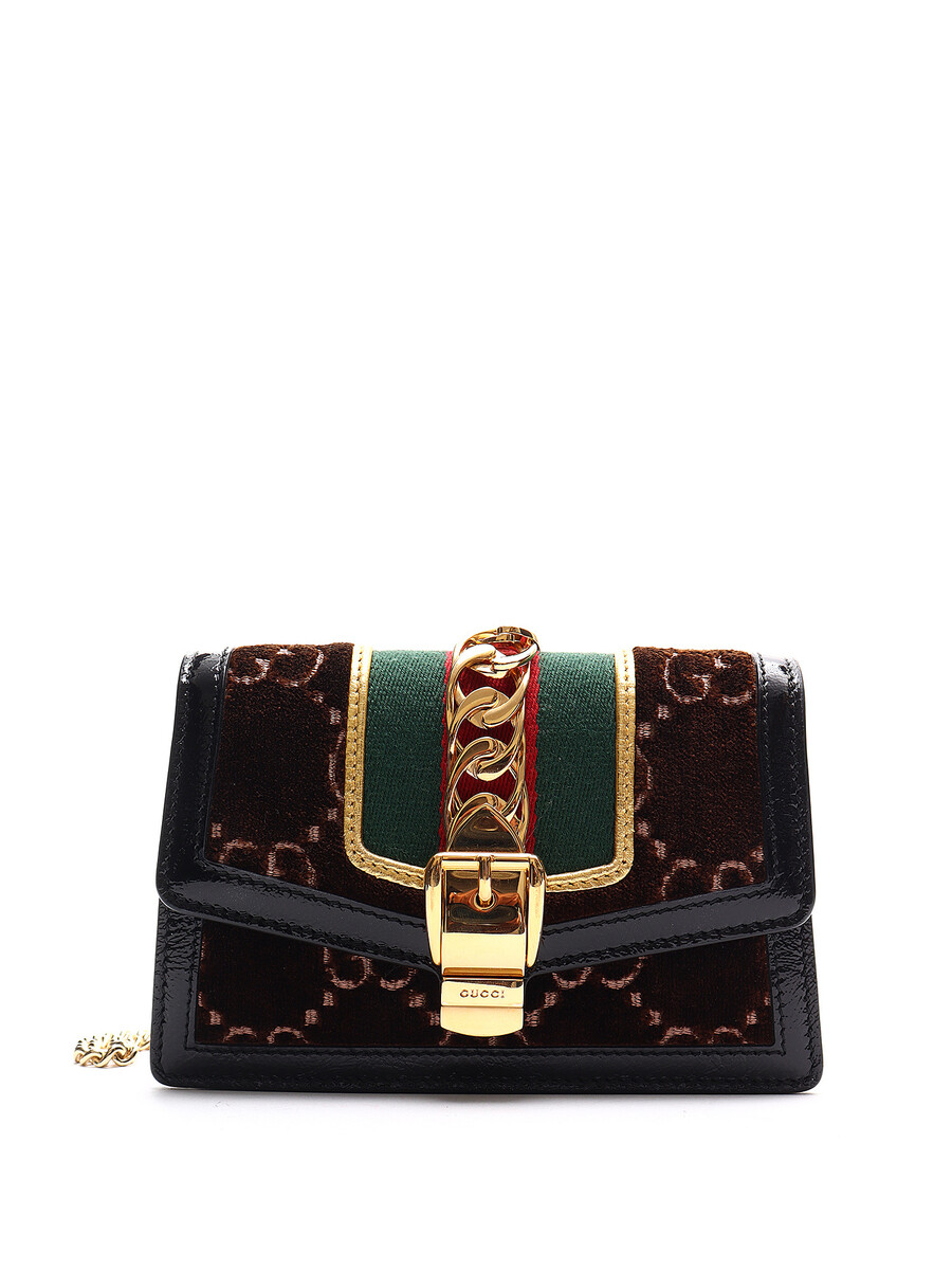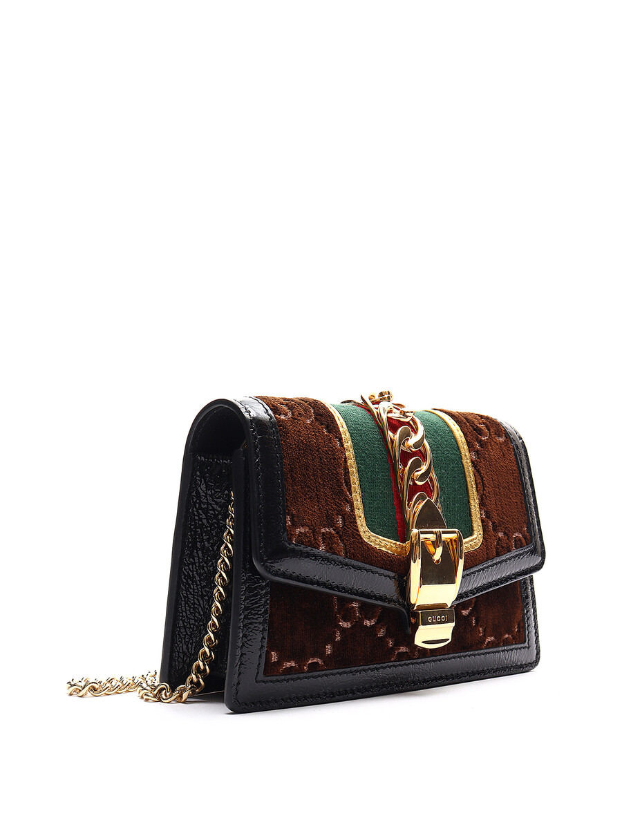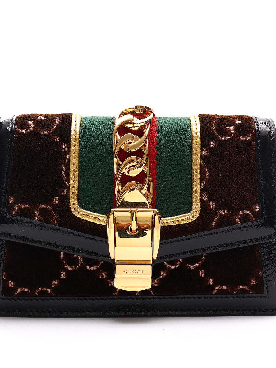Super Mini Sac Sylvie GG en velours dans des tons de brun, rouge, vert, noir et or. Fermeture magnétique. Bandoulière en chaîne dorée. Bordures en cuir verni noir. Avec boîte et dust bag.
