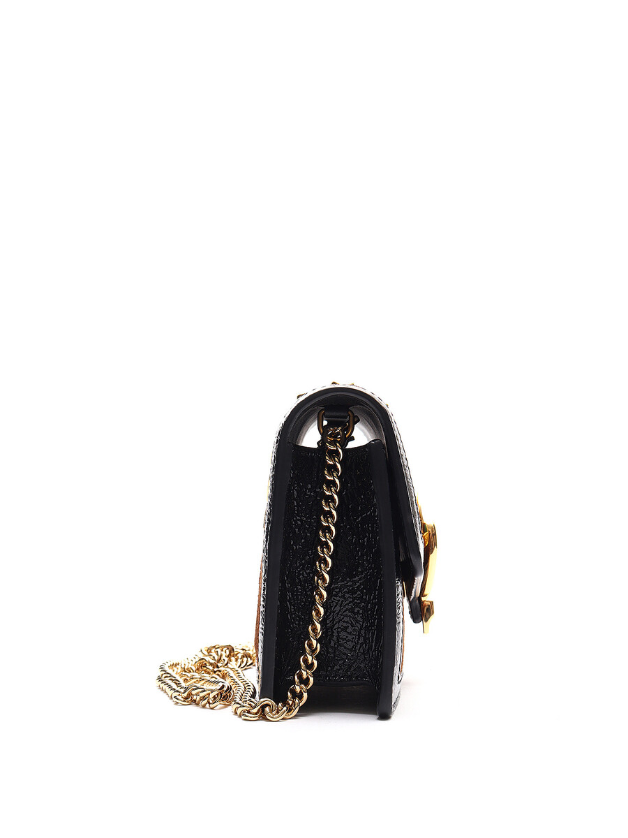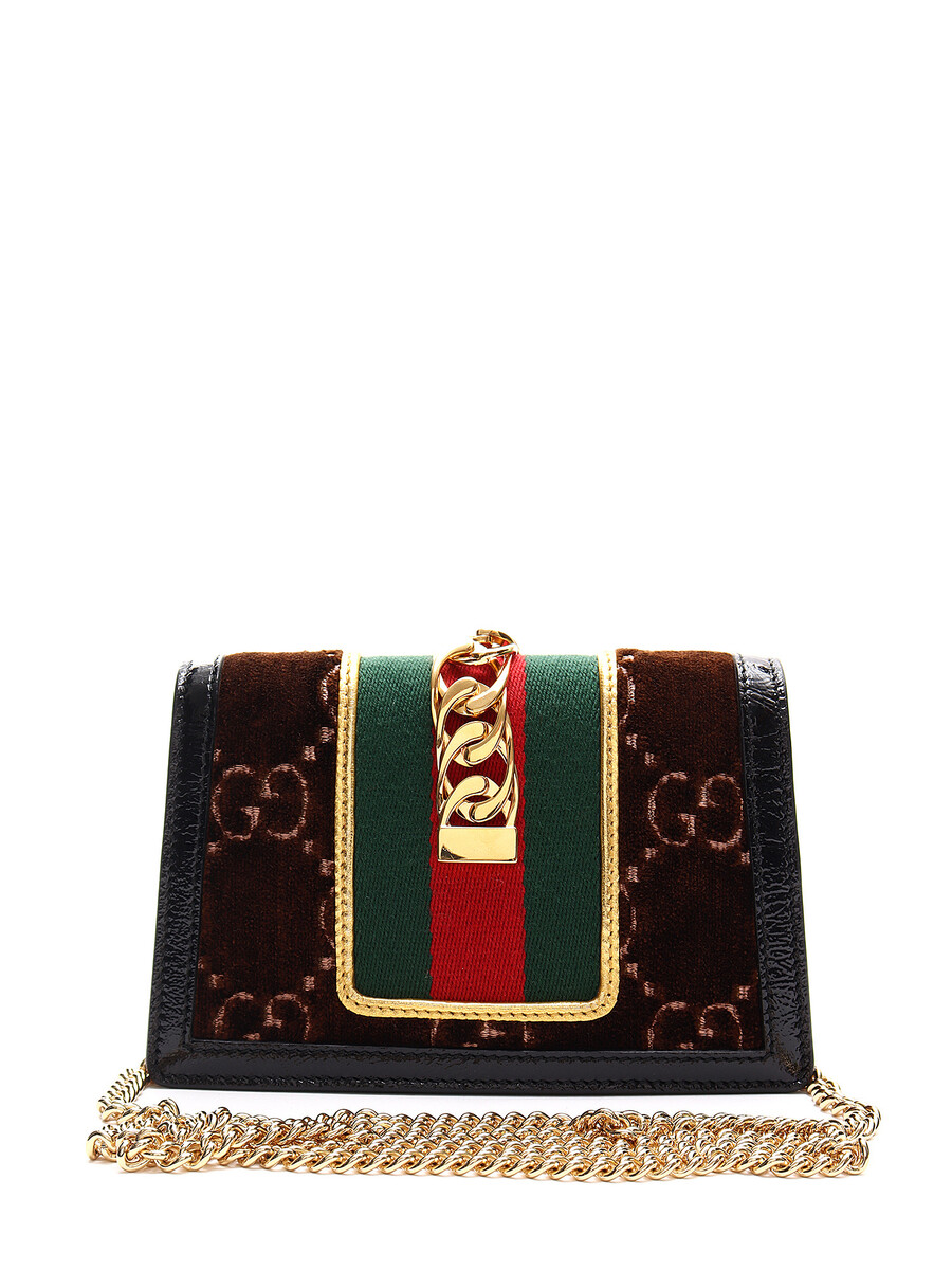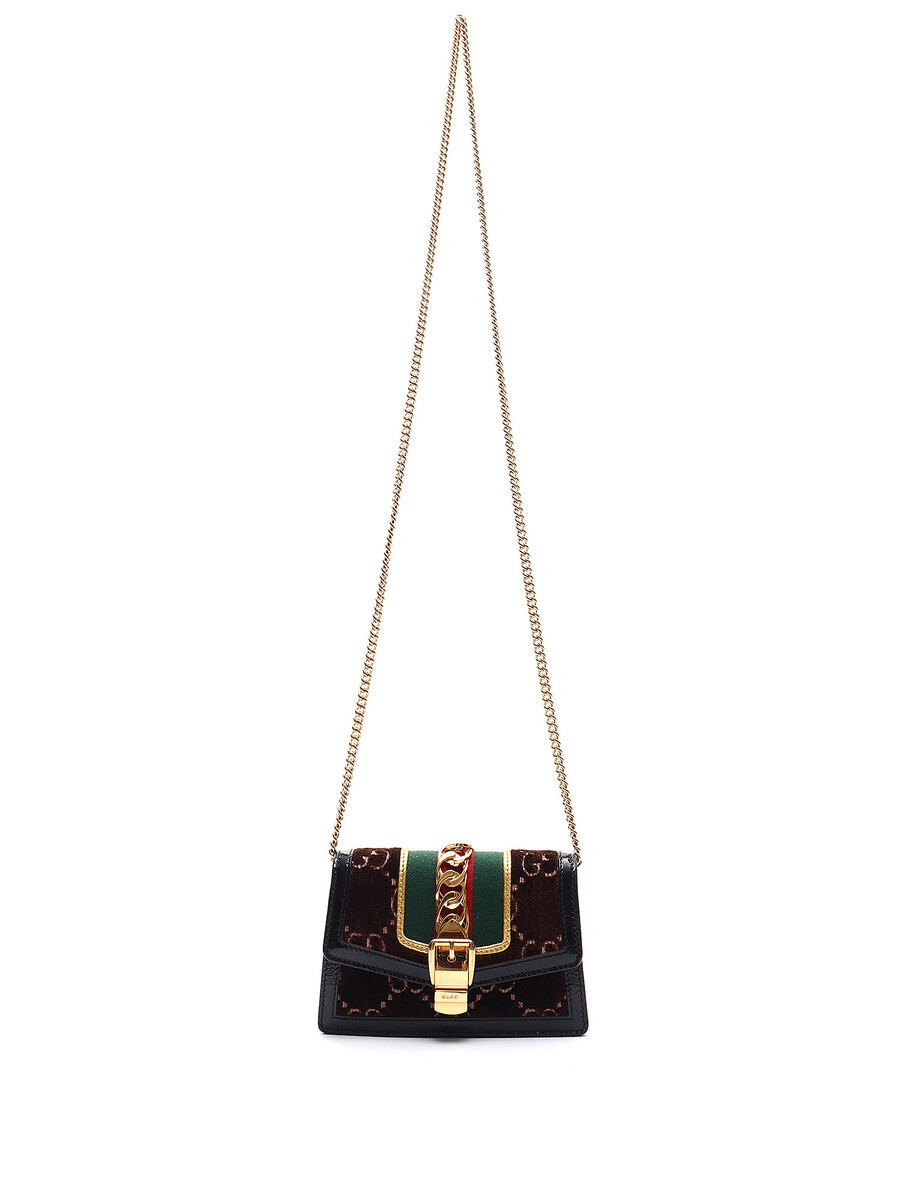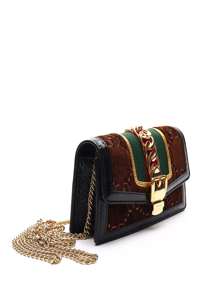 Super Mini Sac Sylvie GG en velours dans des tons de brun, rouge, vert, noir et or. Fermeture magnétique. Bandoulière en chaîne dorée. Bordures en cuir verni noir. Avec boîte et dust bag.