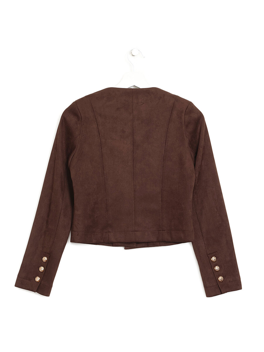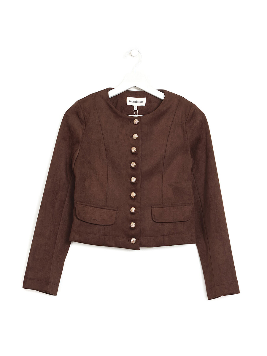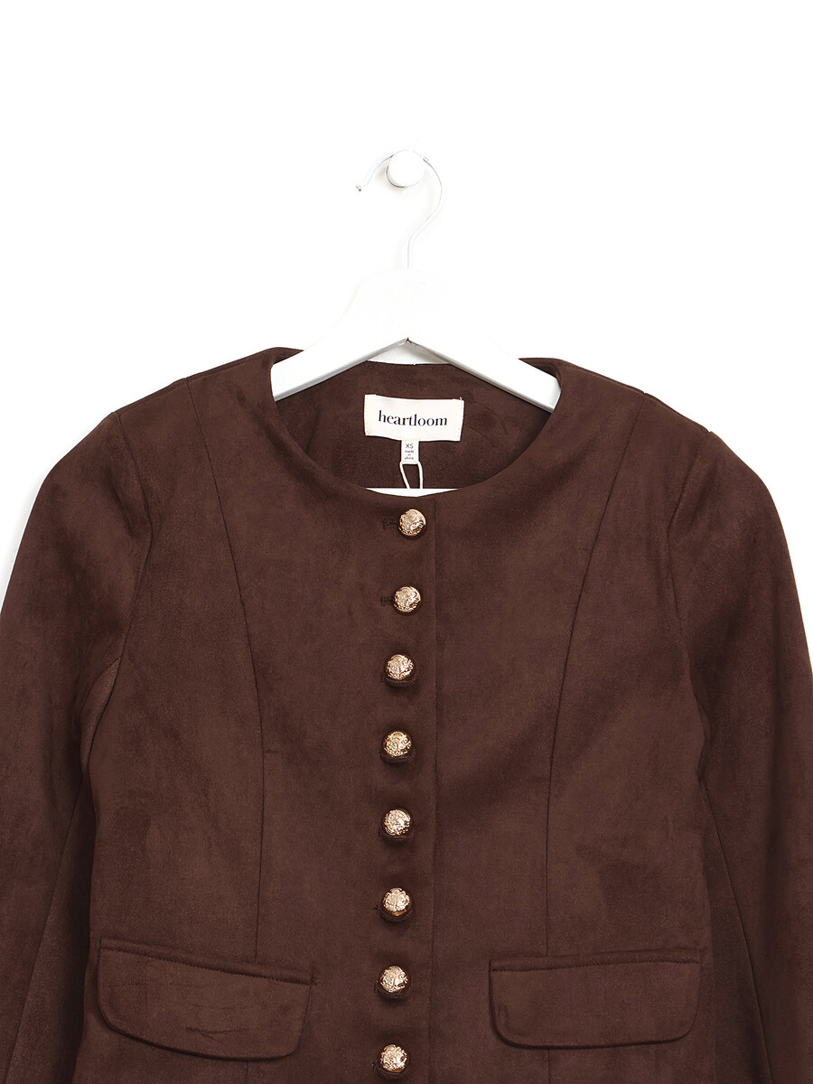 Blazer en faux suède brun espresso riche à la finition lisse. Devant simple à revers crantés.