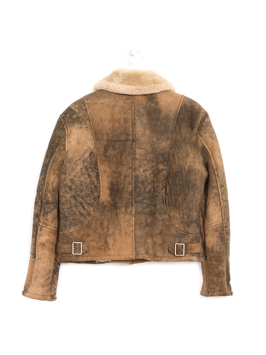 Veste en shearling marron avec une texture douillette. Comprend un large col à revers.