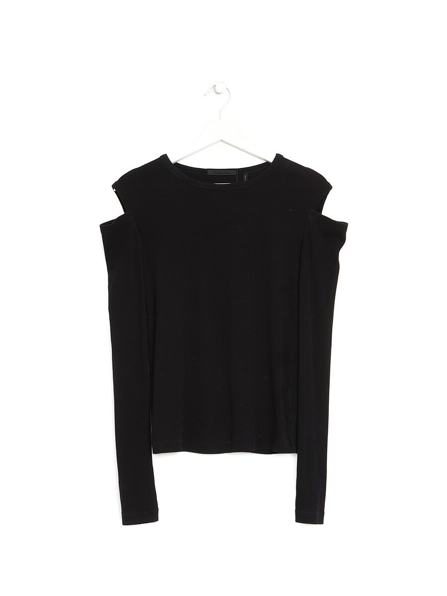 T-shirt noir à manches longues avec découpes aux épaules. Col rond.