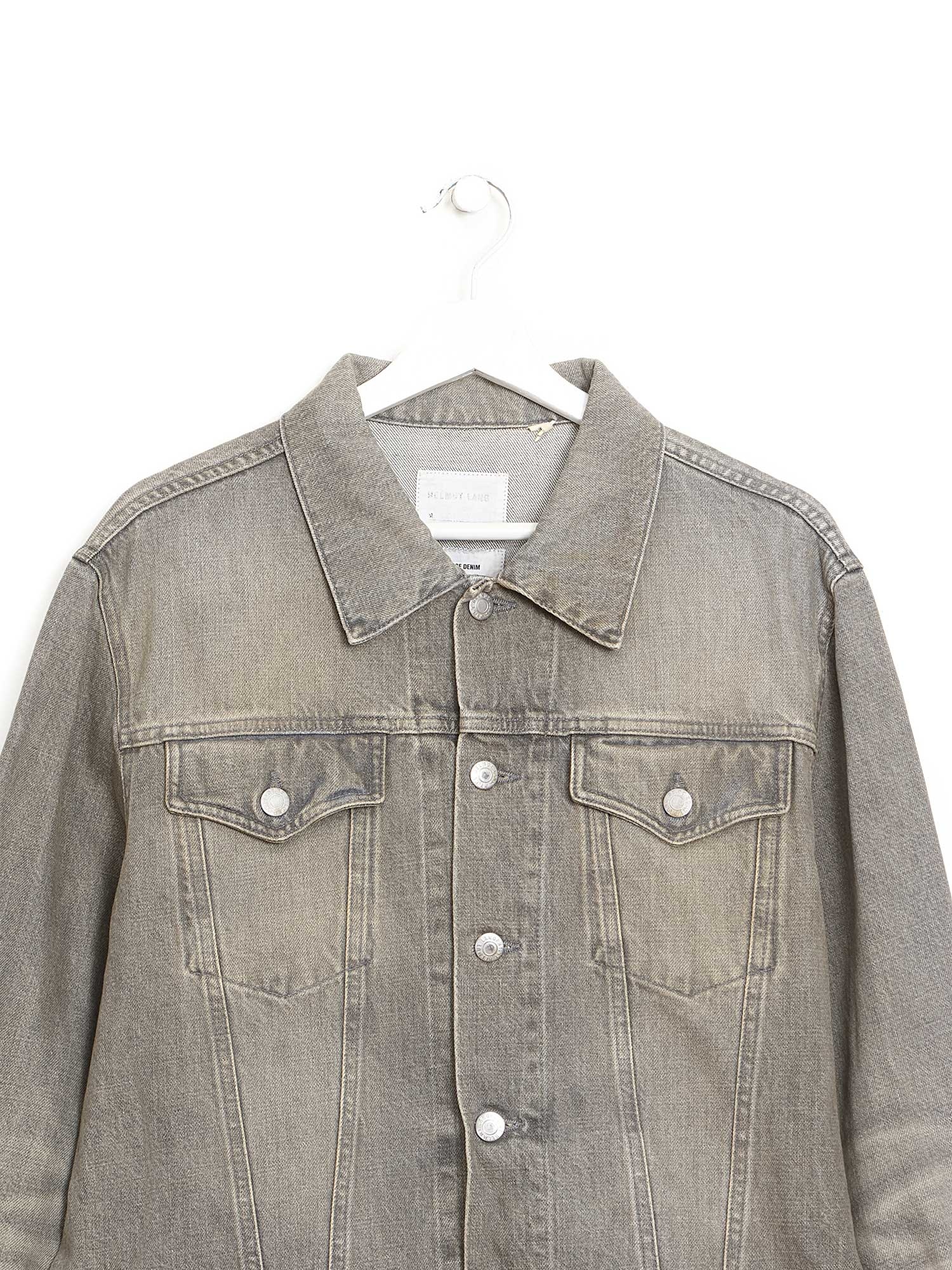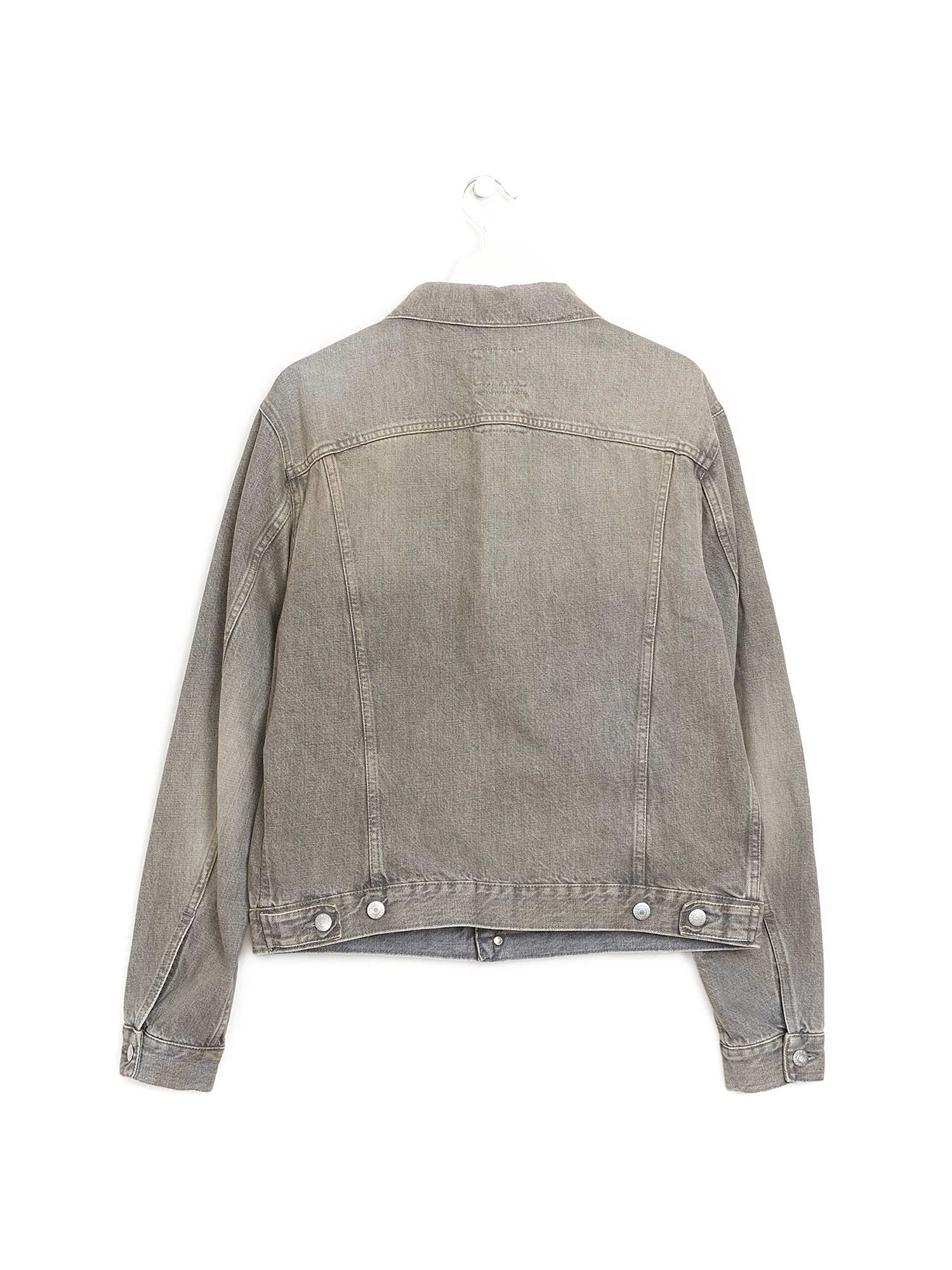 Veste en denim classique à manches longues en gris délavé doux. Fermeture à boutons au devant, col chemise, et poches à rabat sur la poitrine.