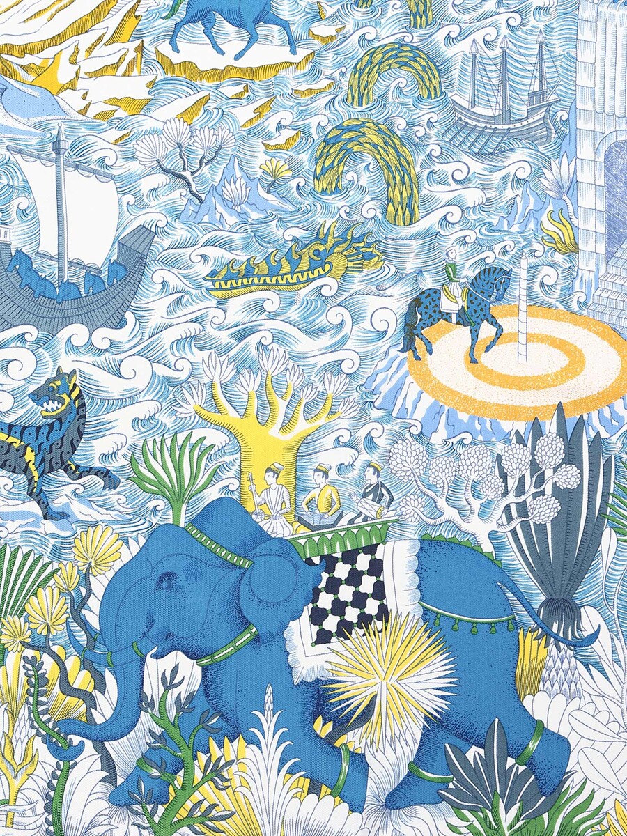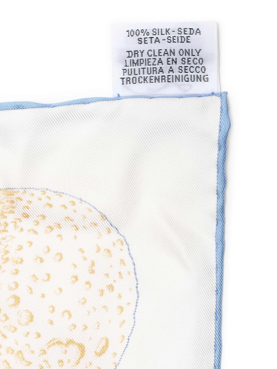 Carré en soie avec un design graphique dans des teintes de bleu. Vendu dans sa boîte d'origine.