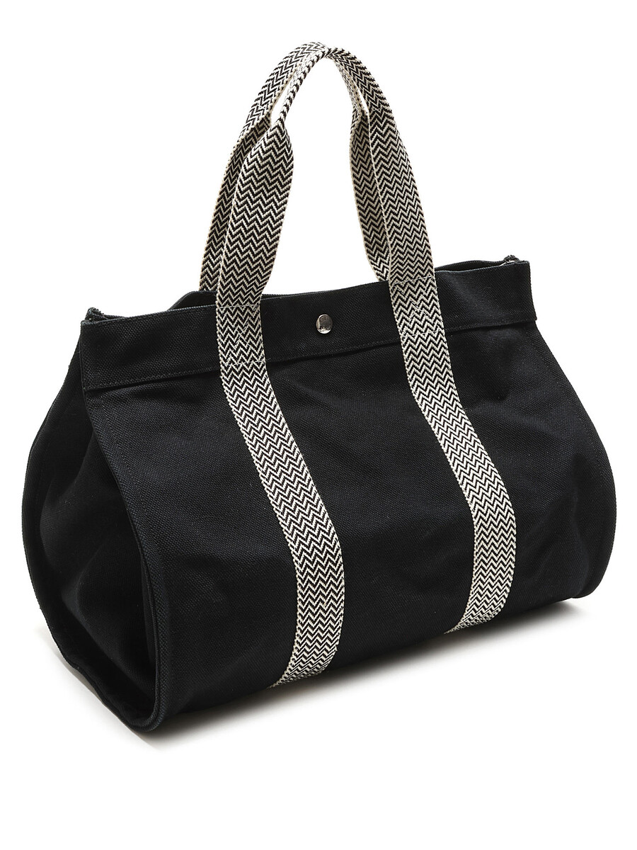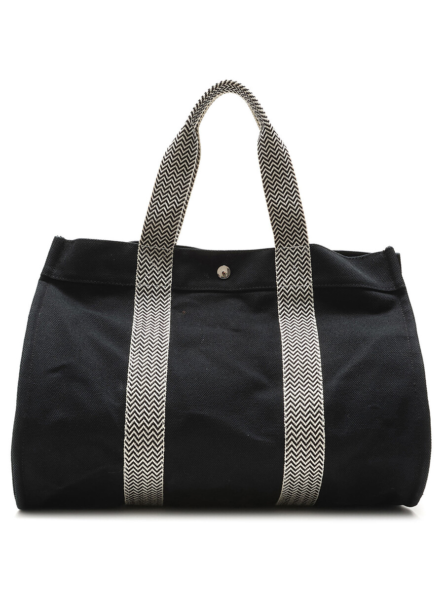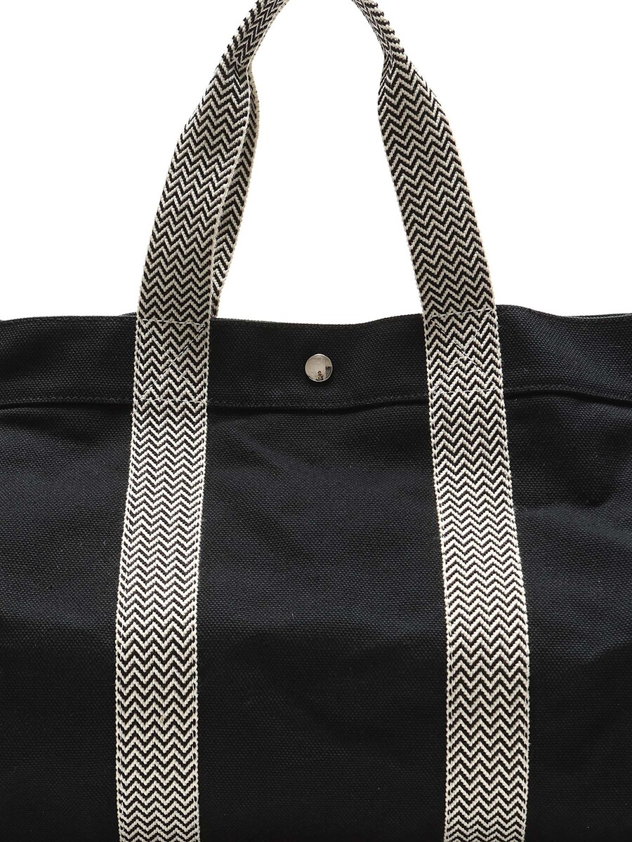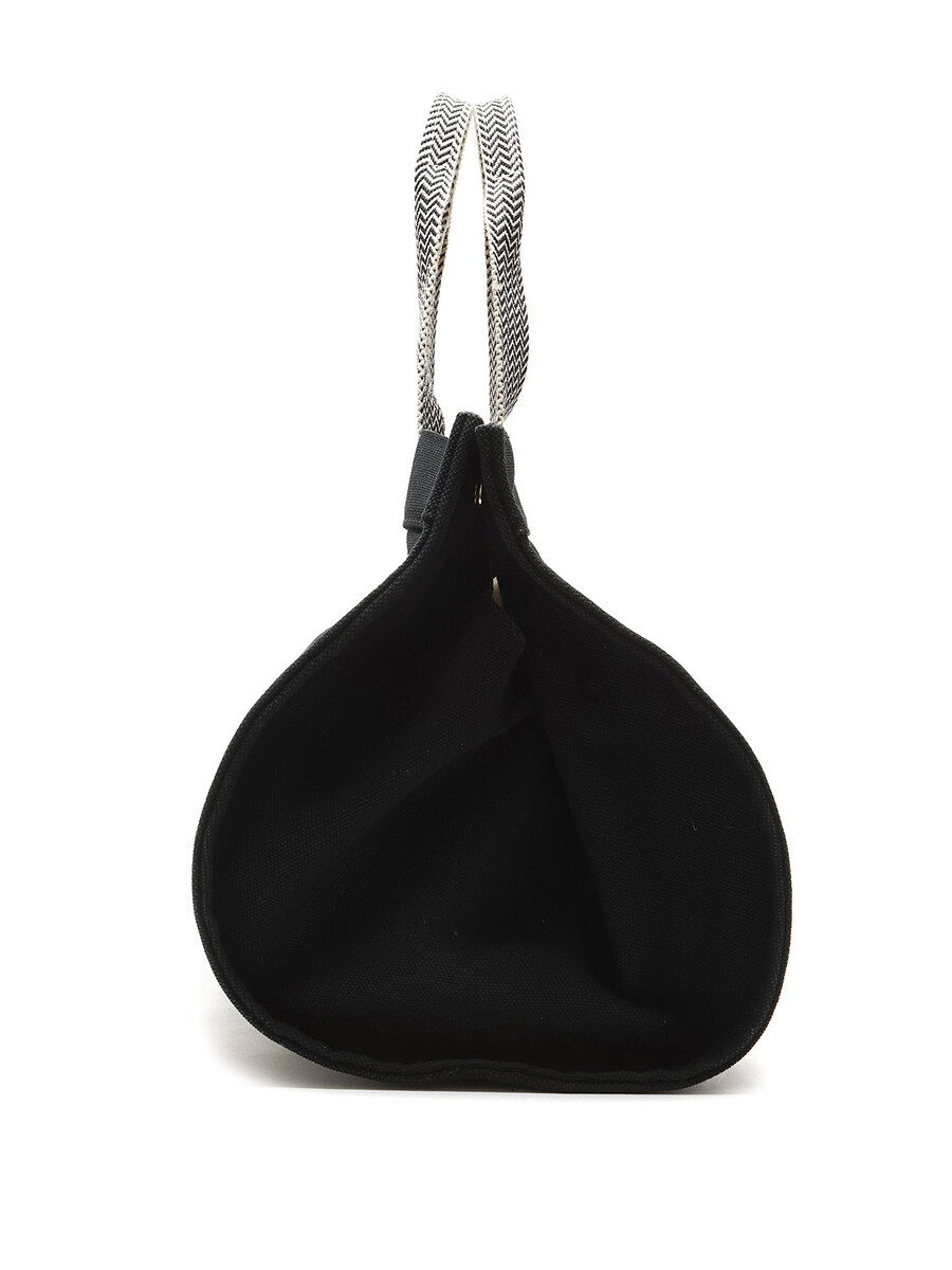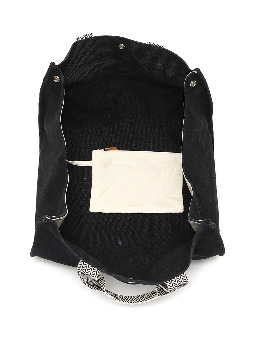 Sac cabas en toile noir avec fermeture à boutons-pression et deux anses.