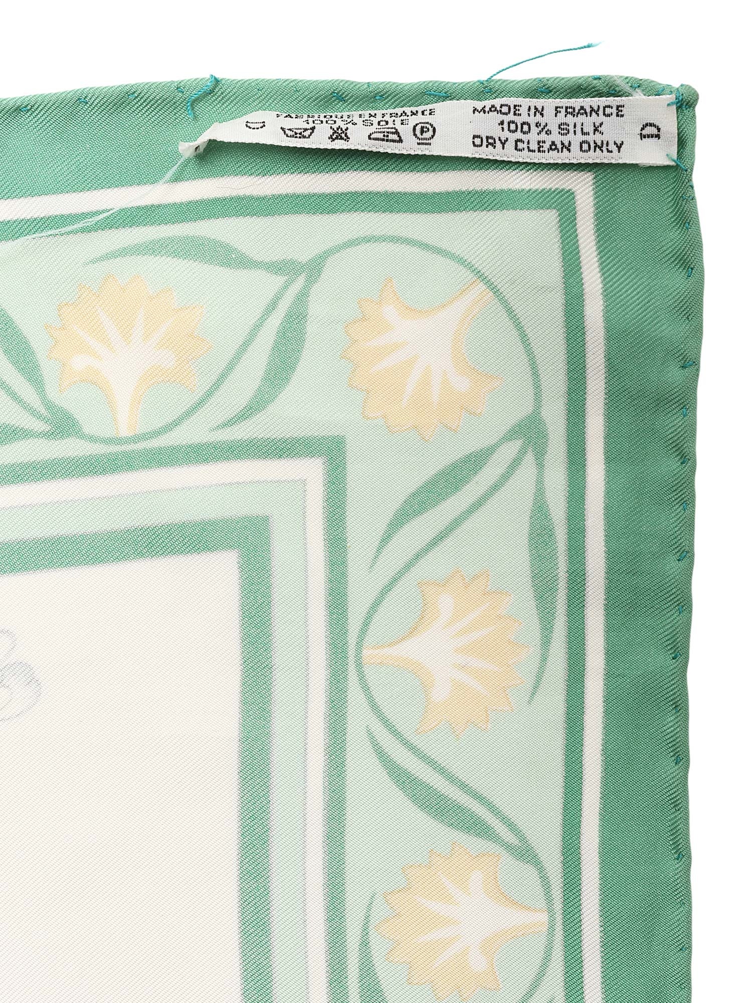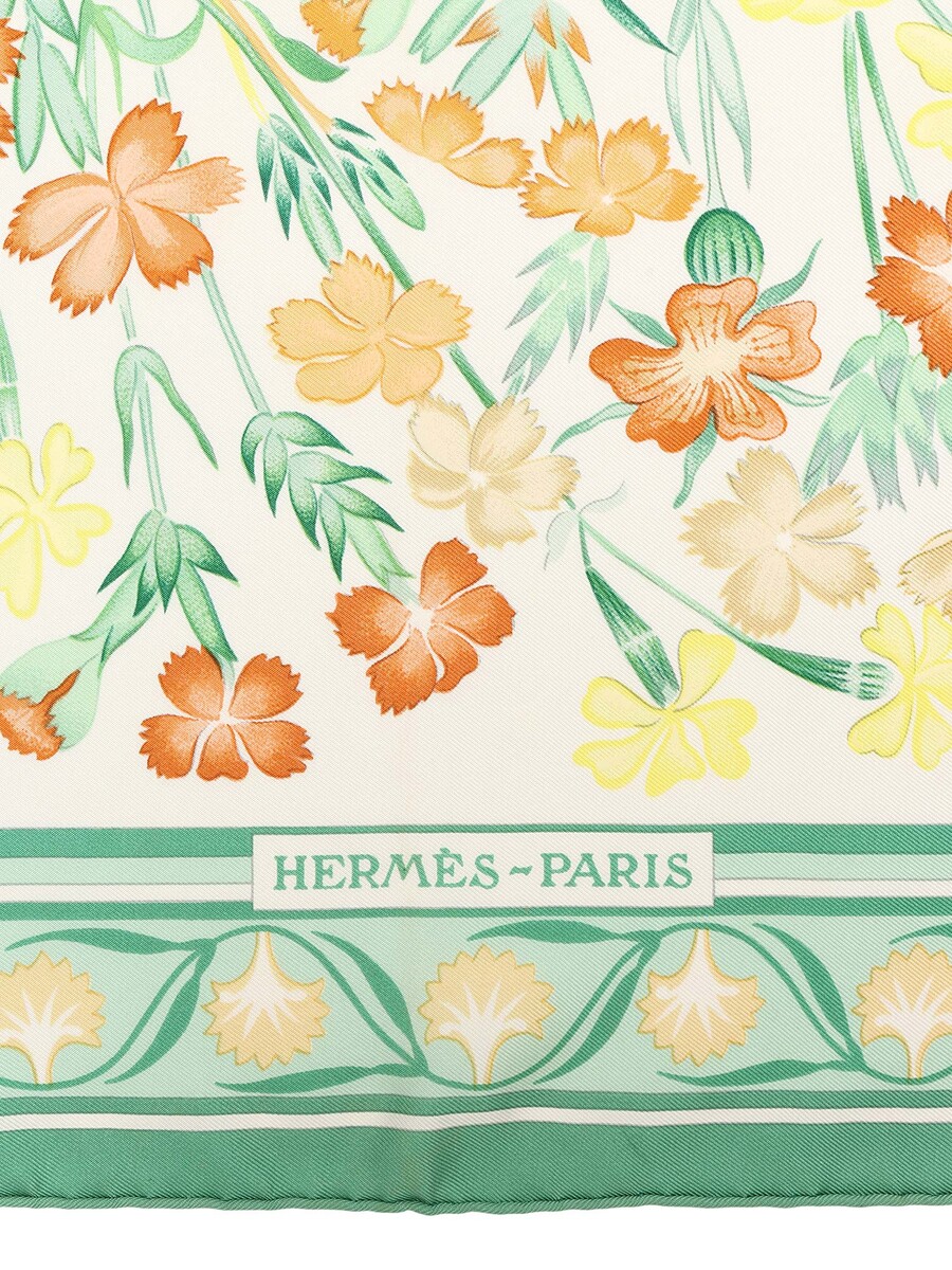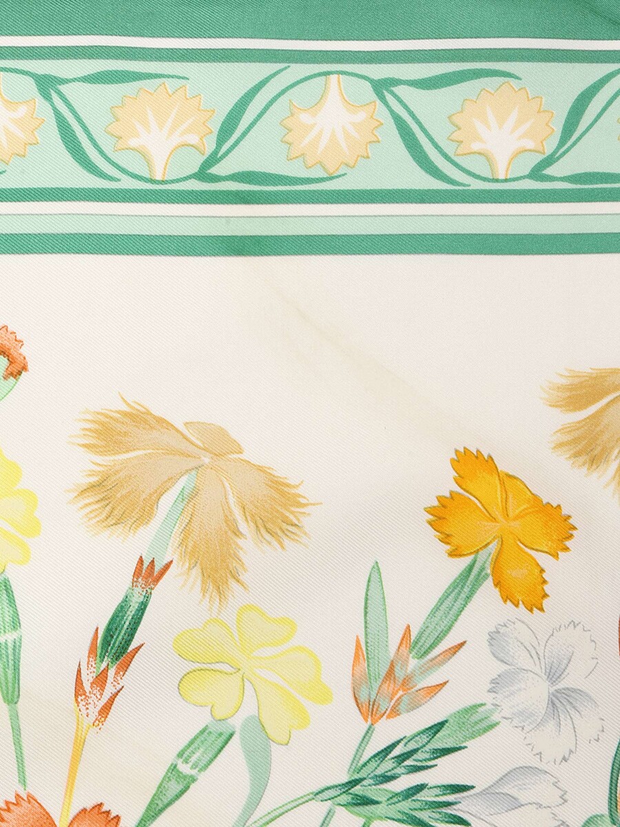 Foulard en soie à motif floral botanique dans des tons de vert, orange, jaune et blanc. Forme carrée. Légers signes d'usure avec fils tirés.