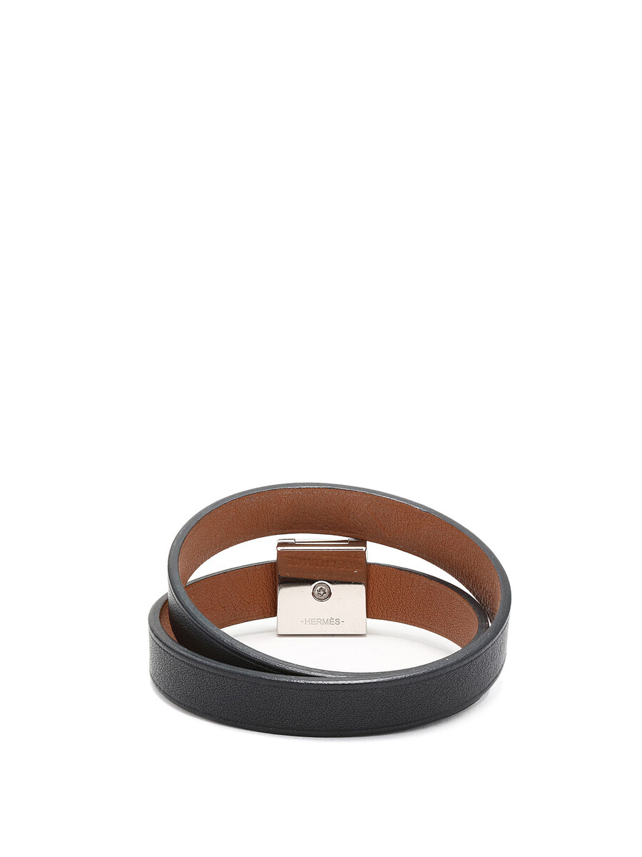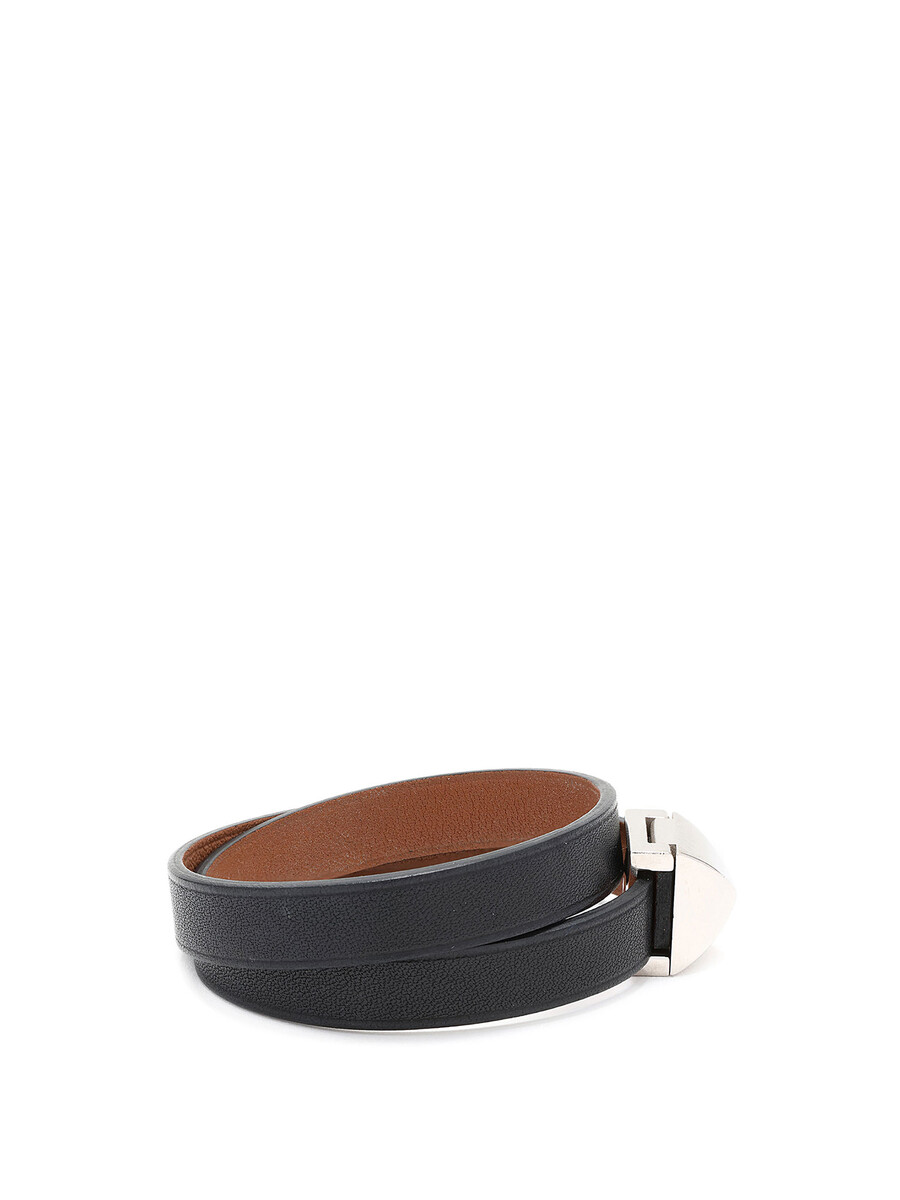 Bracelet double tour en cuir noir avec fermoir à crochet plaqué palladium.