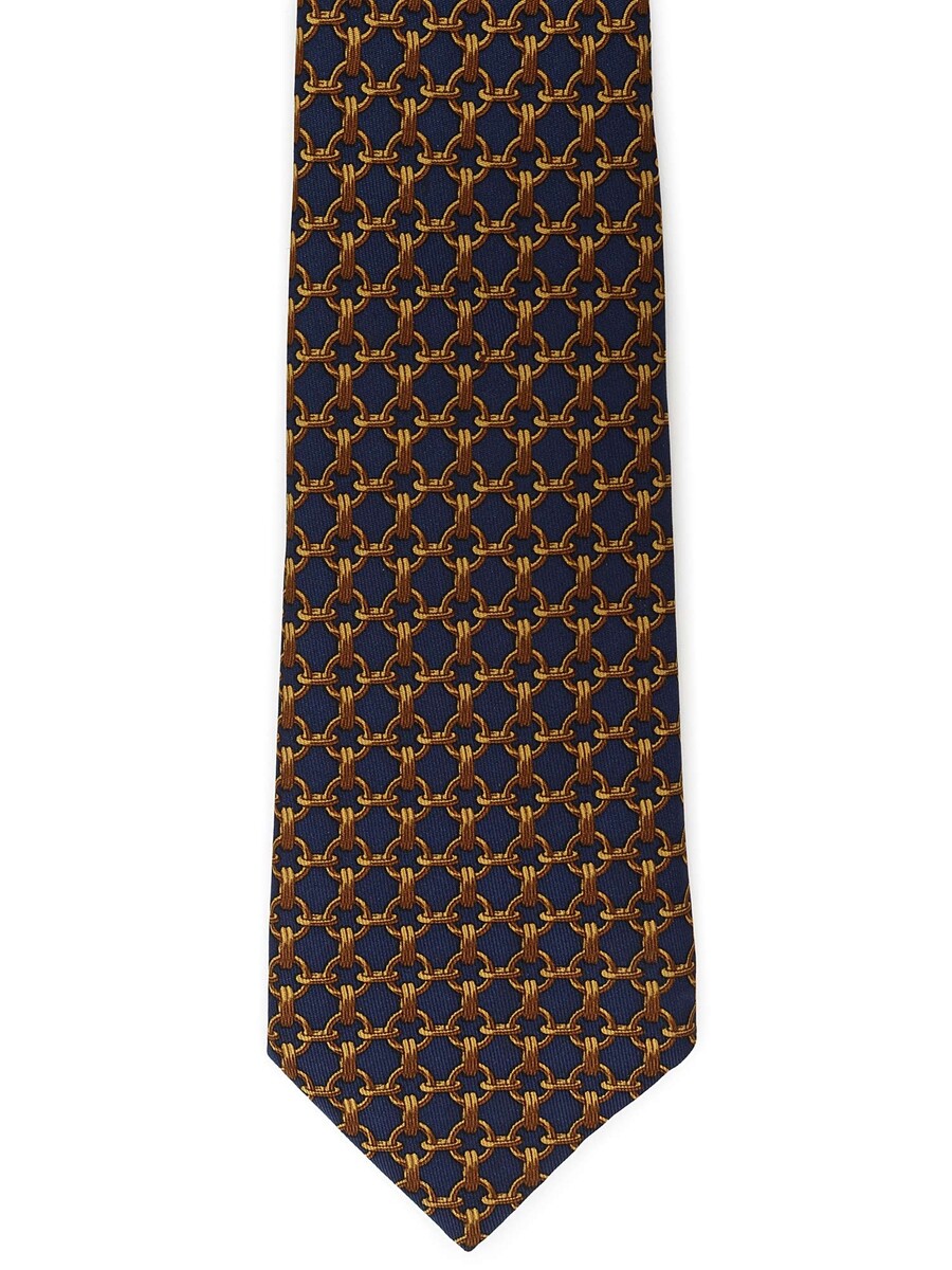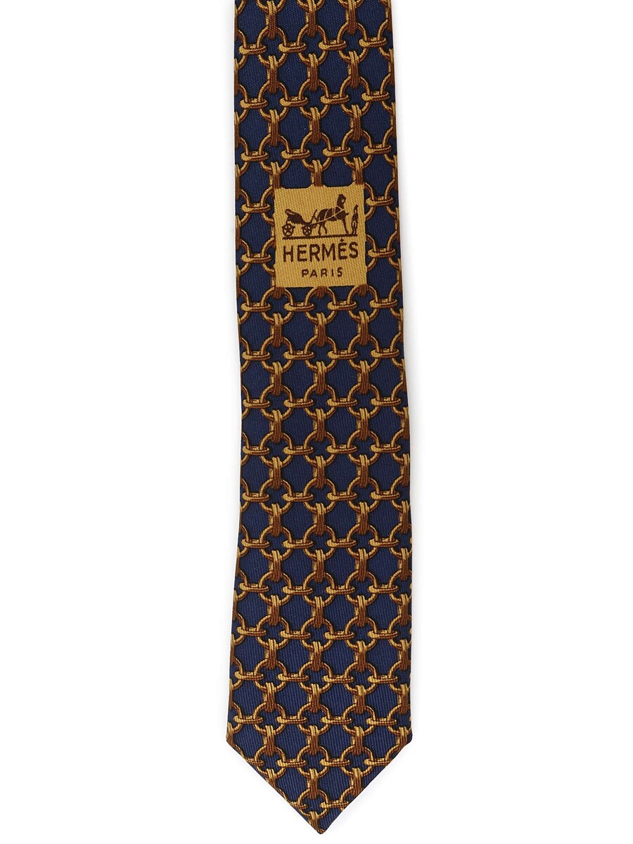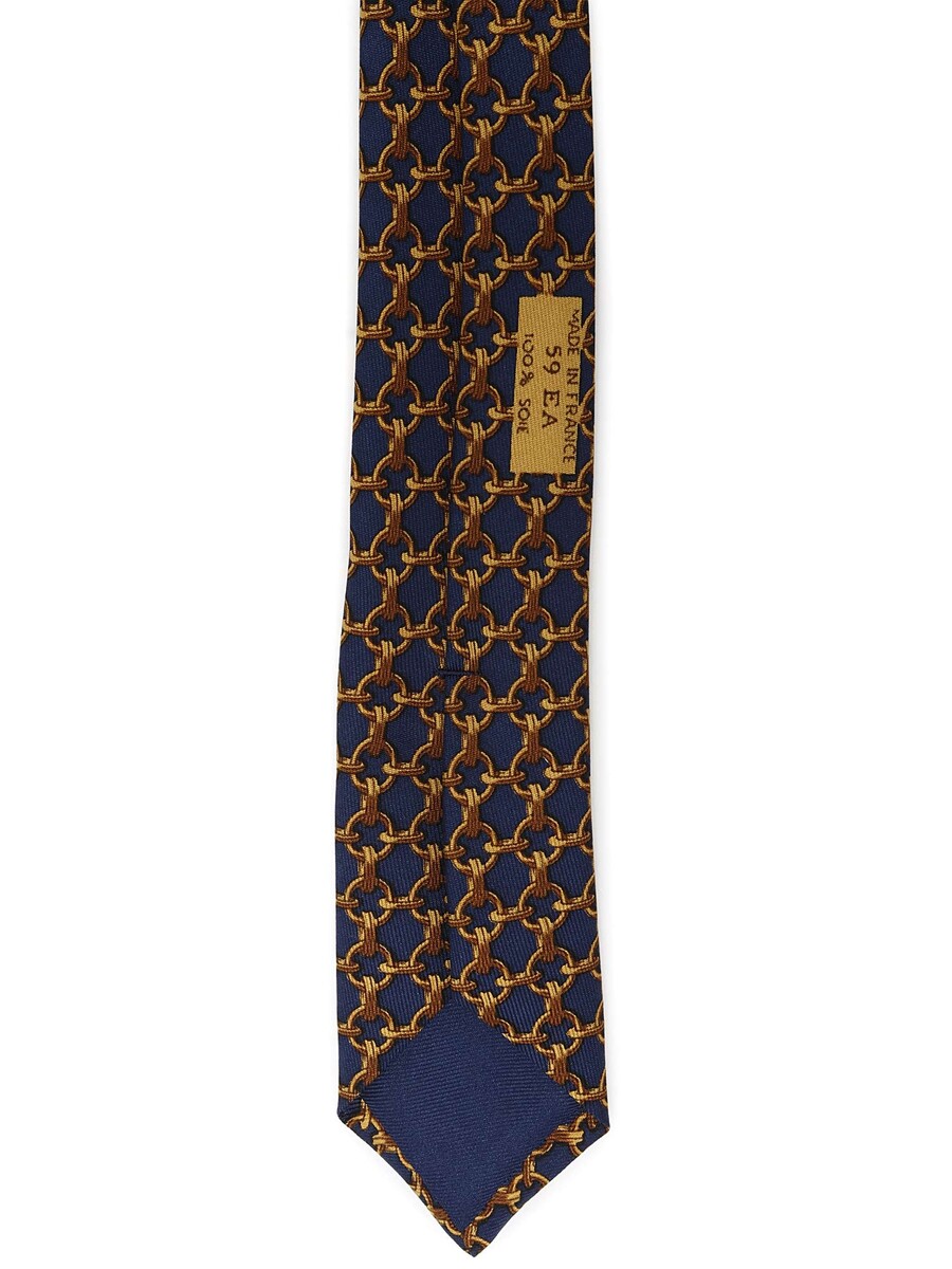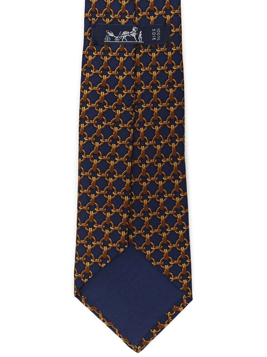 Cravate en soie avec un motif de maillons de chaîne en bleu et jaune. Offre une sensation de luxe et un motif complexe.