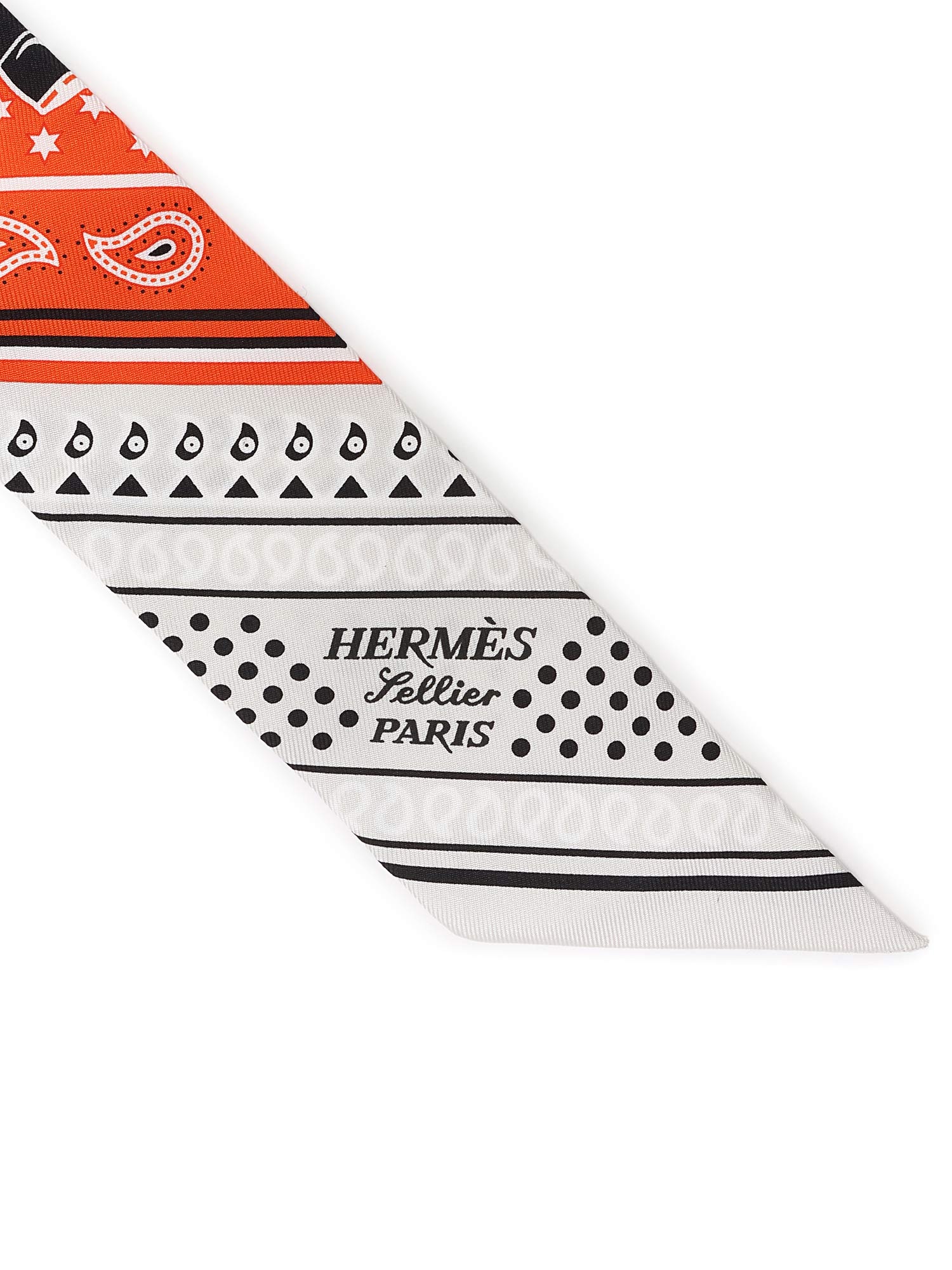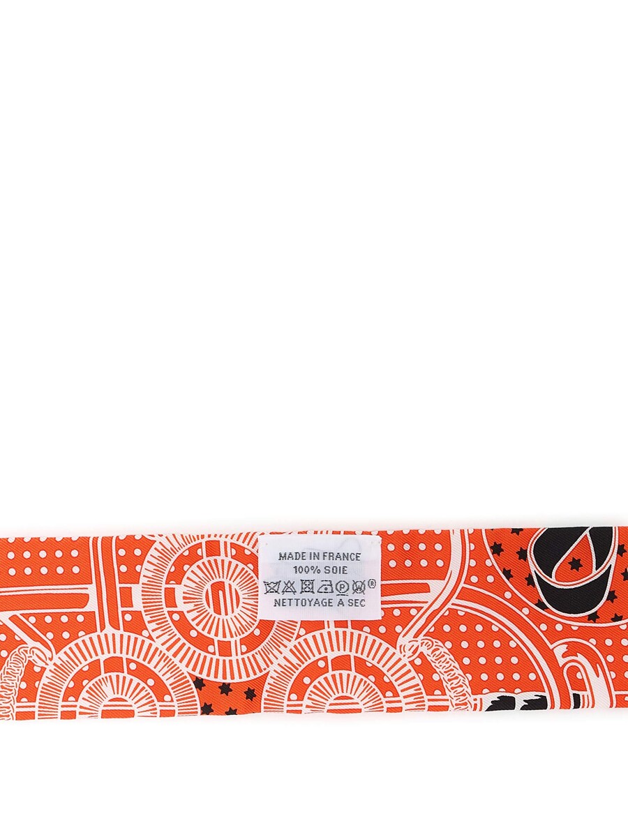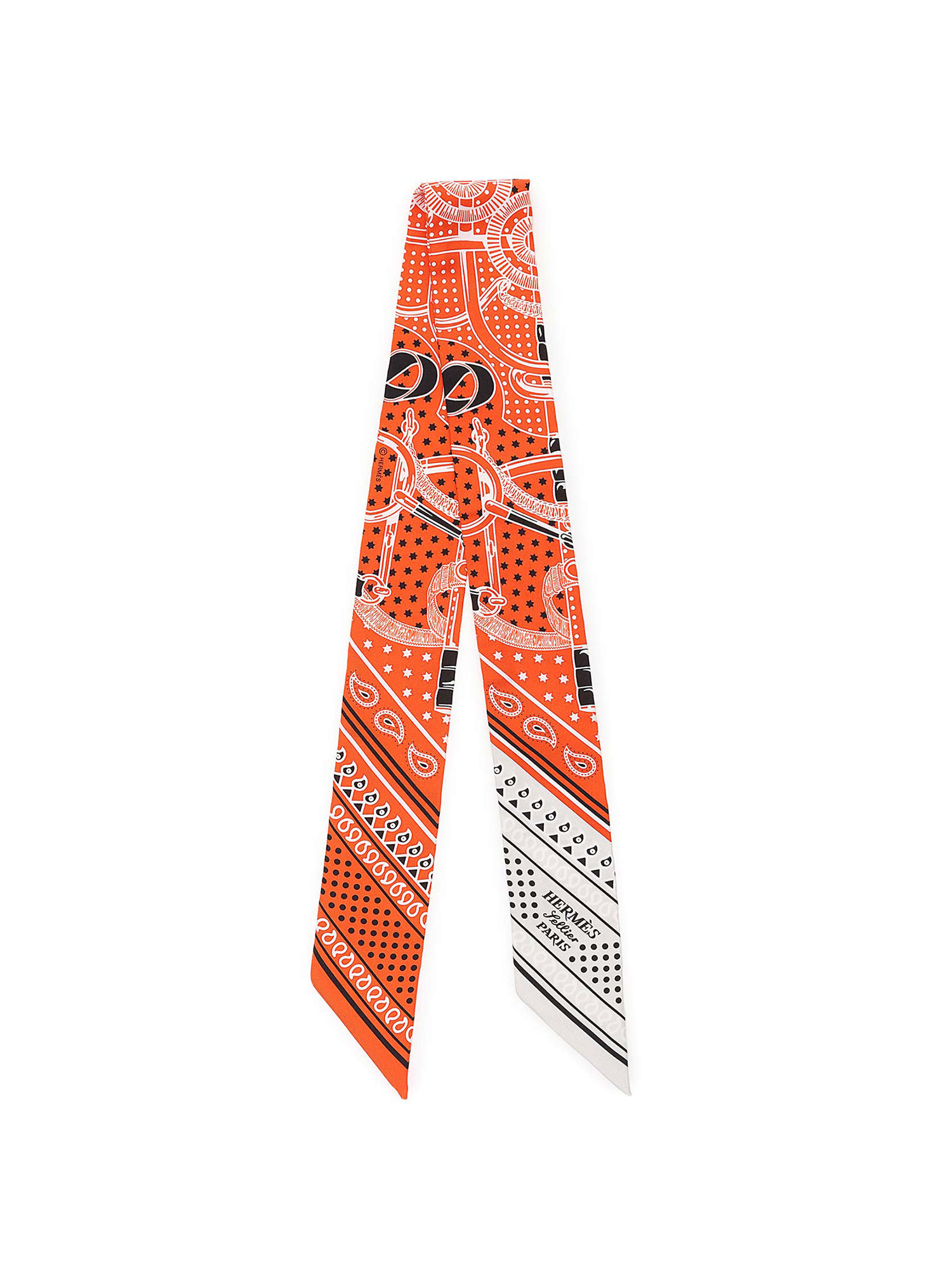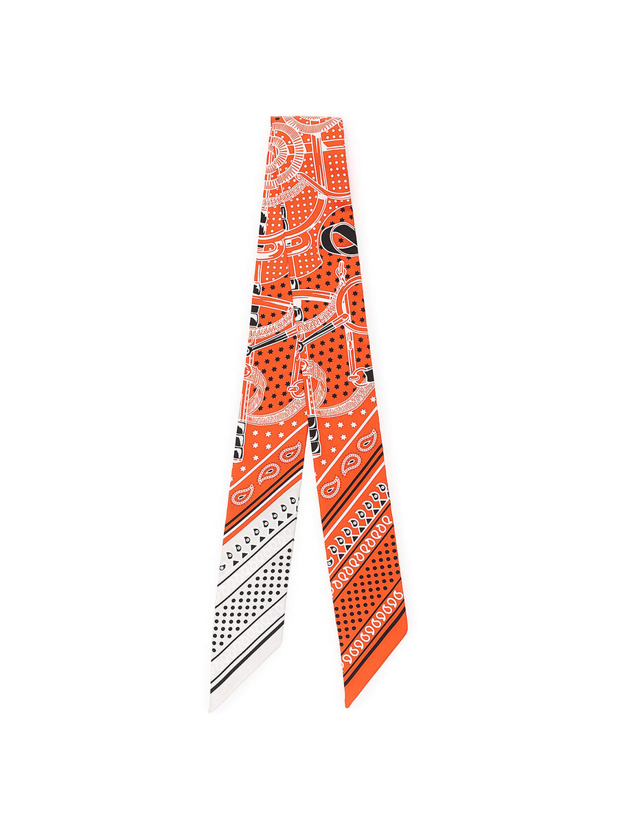 Foulard en soie présentant un motif géométrique et cachemire en orange vif, blanc et noir. Livré avec une boîte ronde.