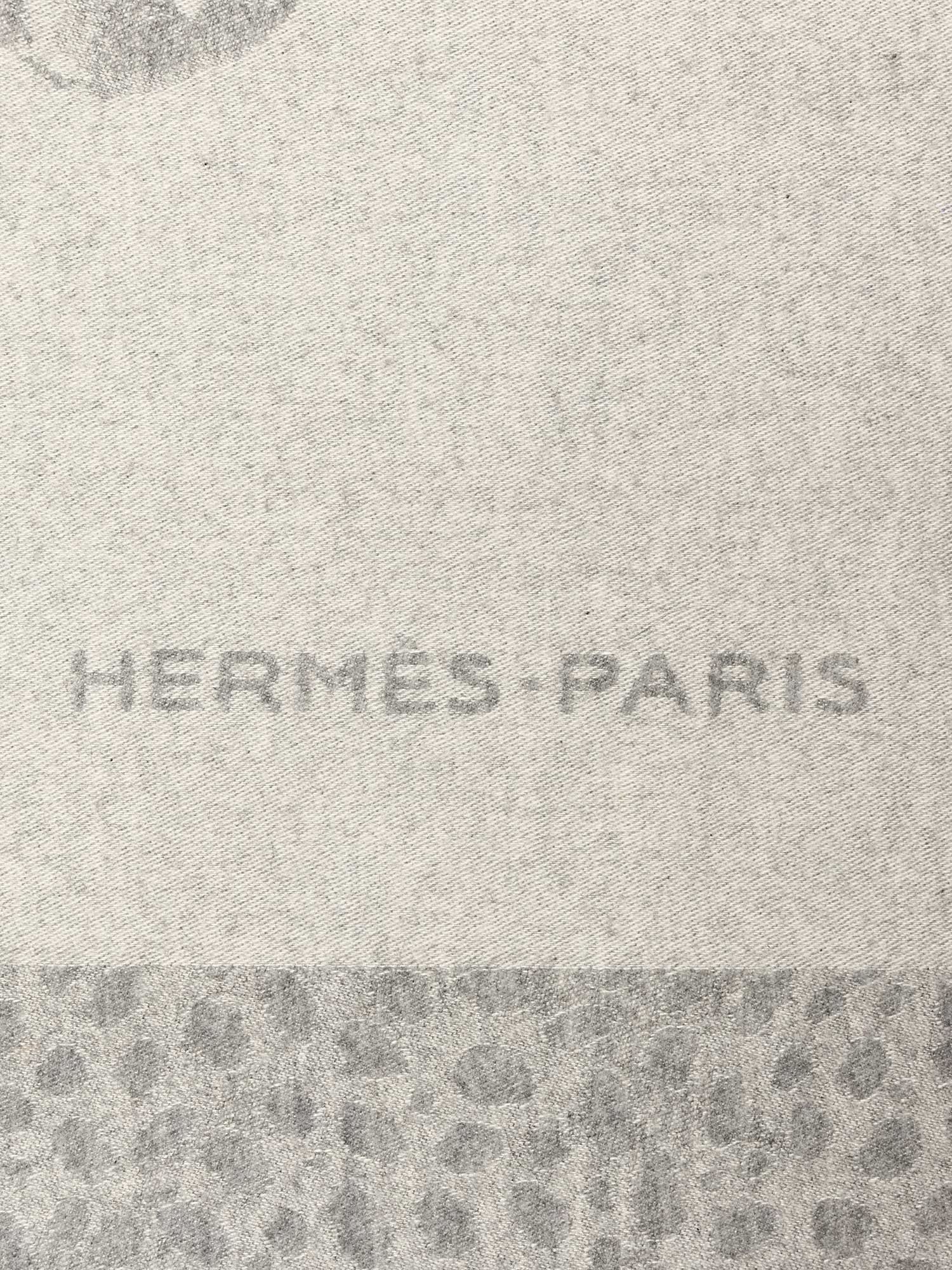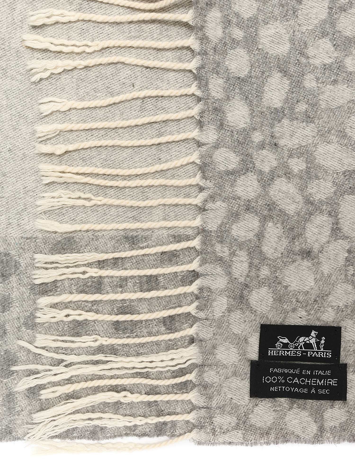 Jeté en cachemire doux avec imprimé léopard emblématique en gris. Bords à franges.