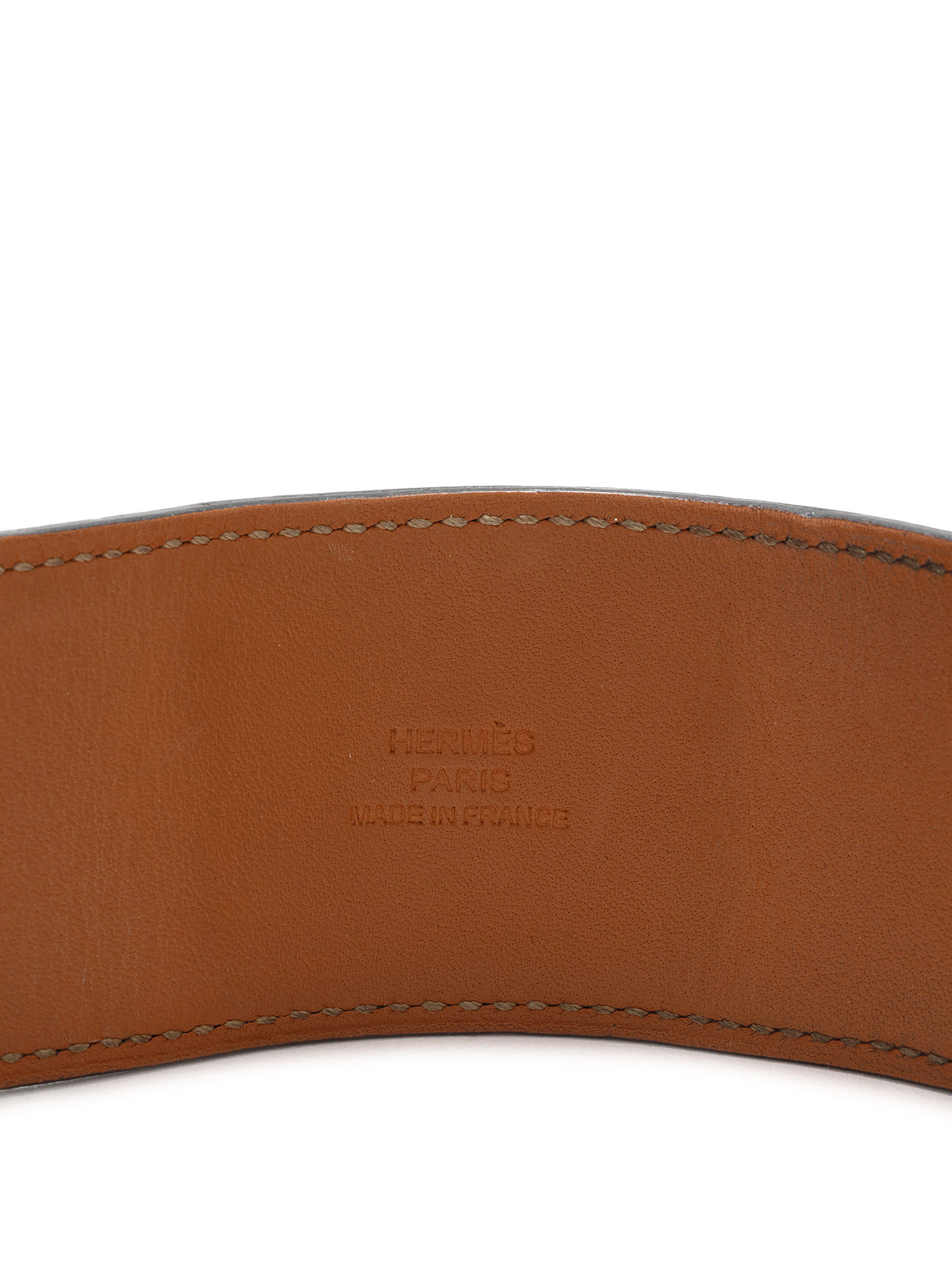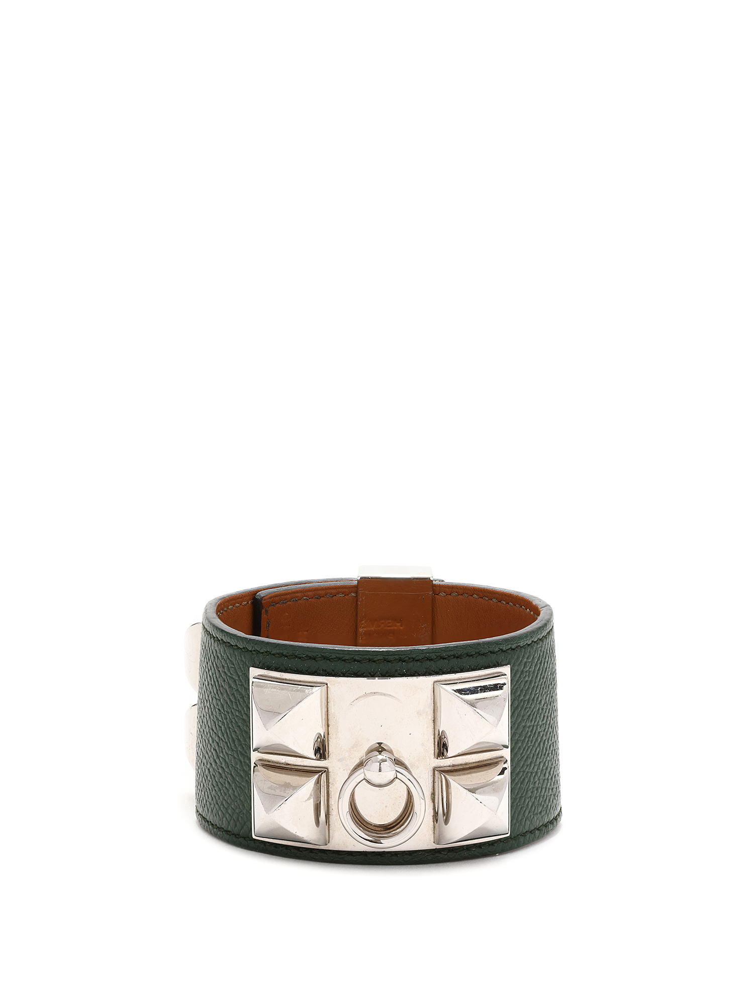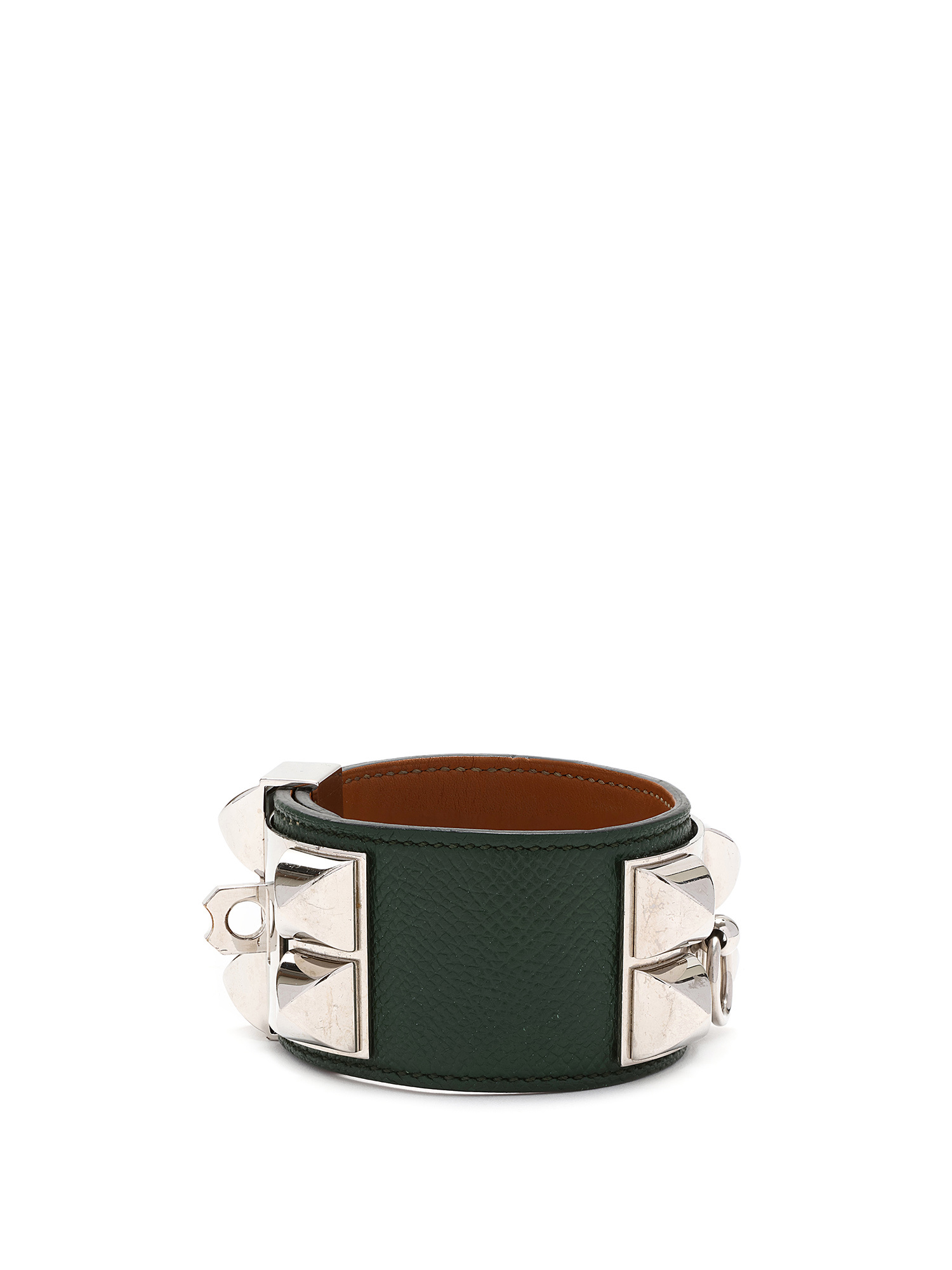 Bracelet en cuir vert olive avec des clous pyramidaux argentés et un anneau central. Fermeture réglable par boucle. Fabriqué en France.