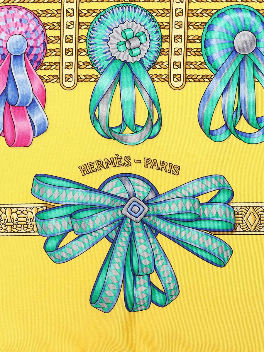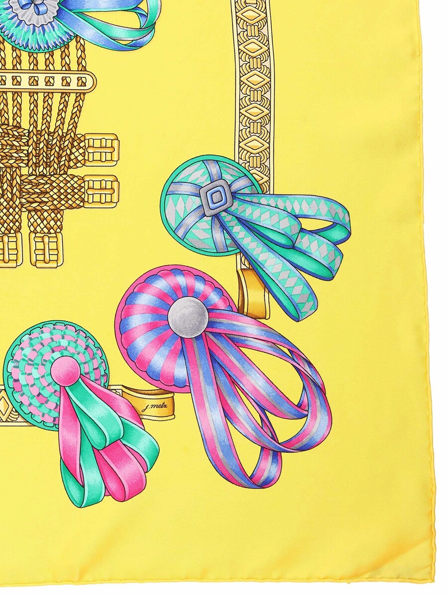 Carré en soie à motif de rubans et chaînes dans les tons de jaune, vert, rose et bleu.