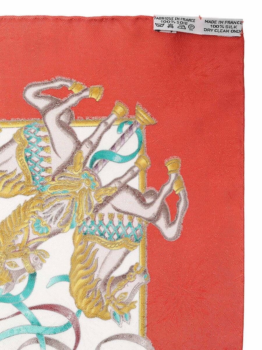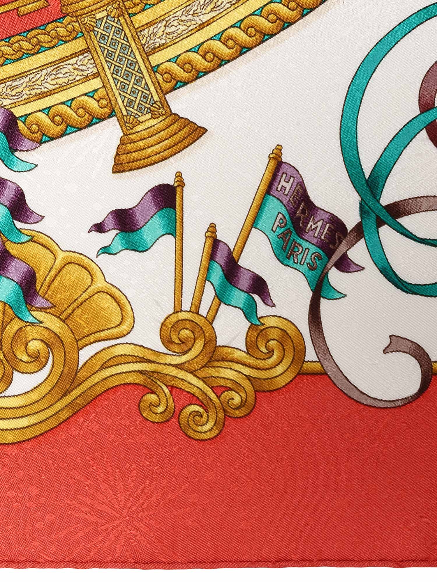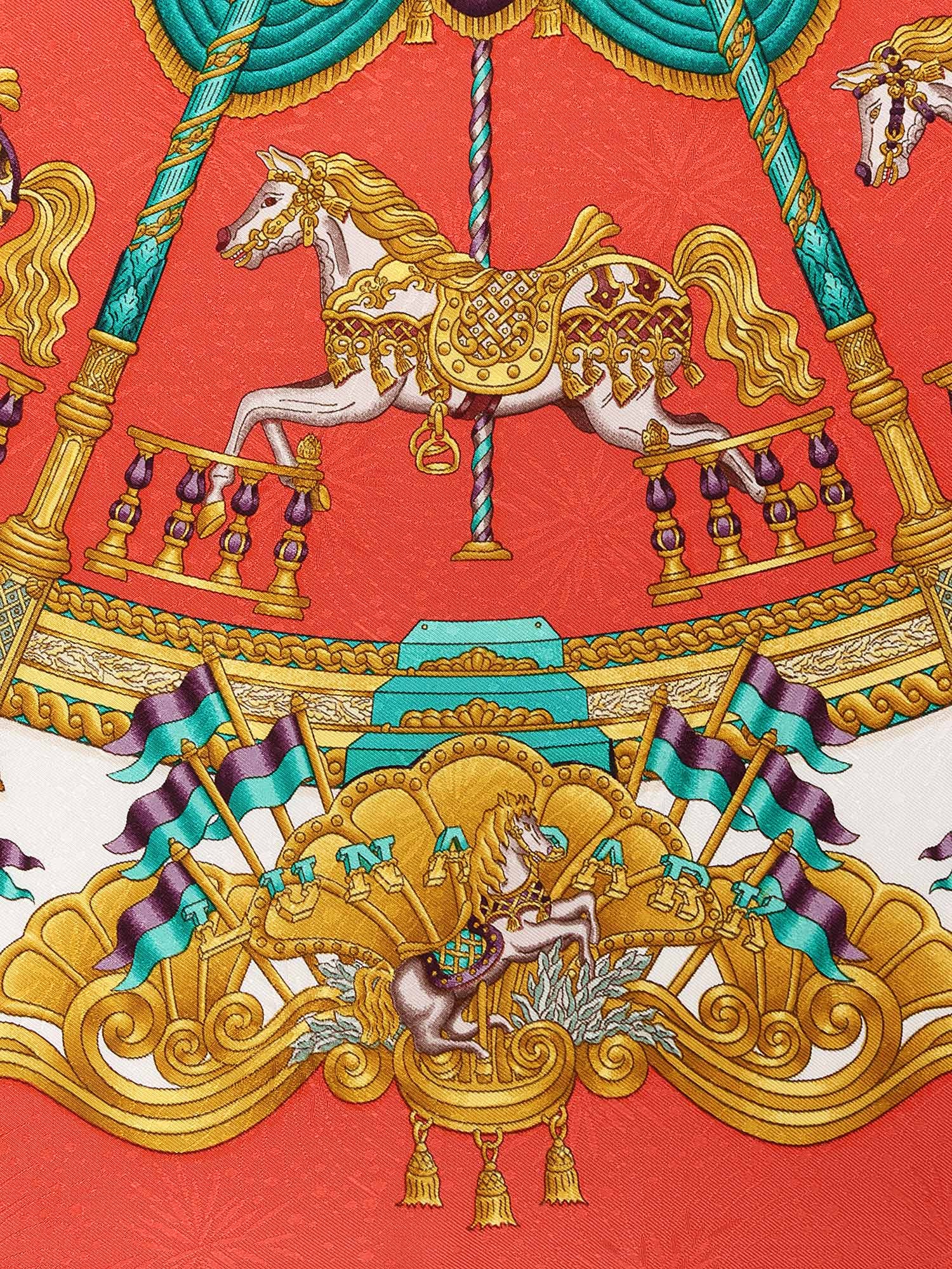 Carré en soie orné d'un motif de carrousel éclatant en rouge, or, vert, bleu et blanc.