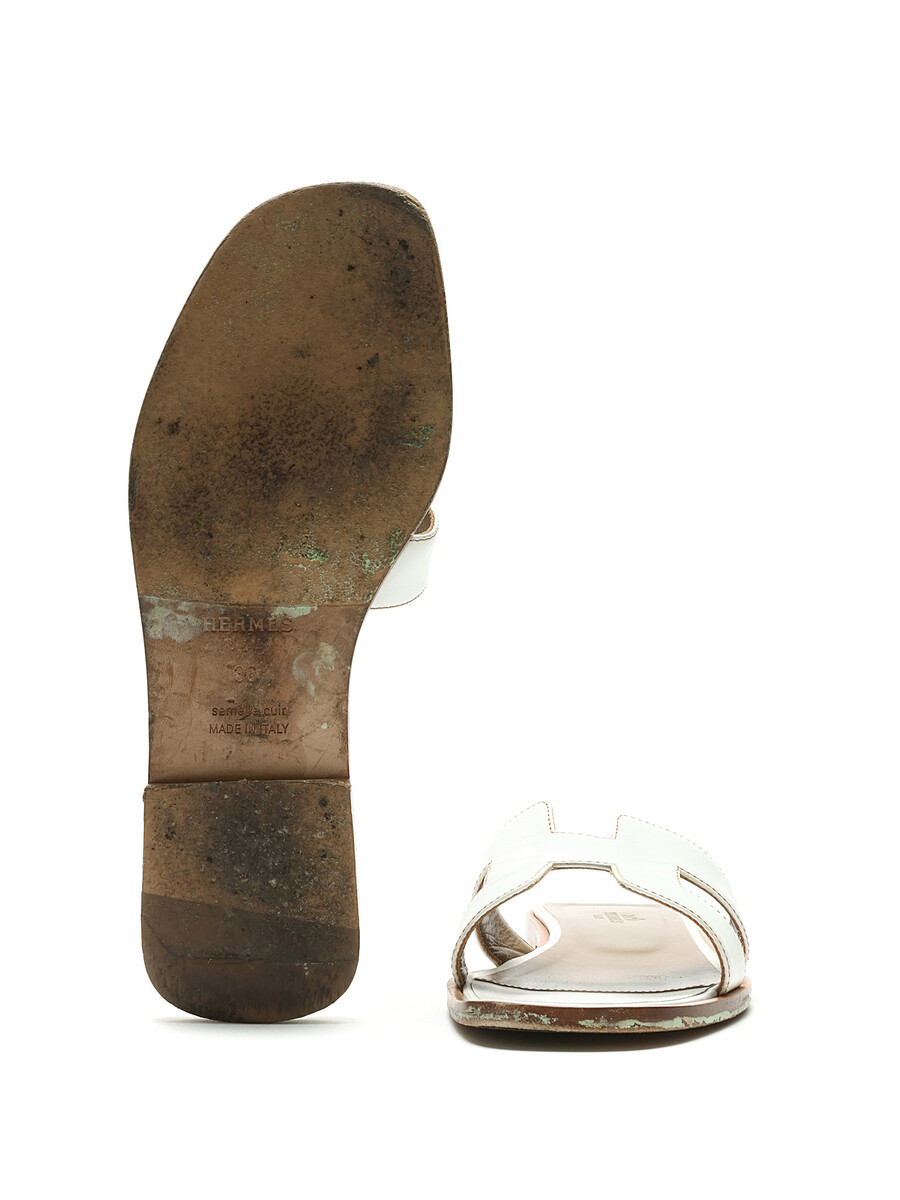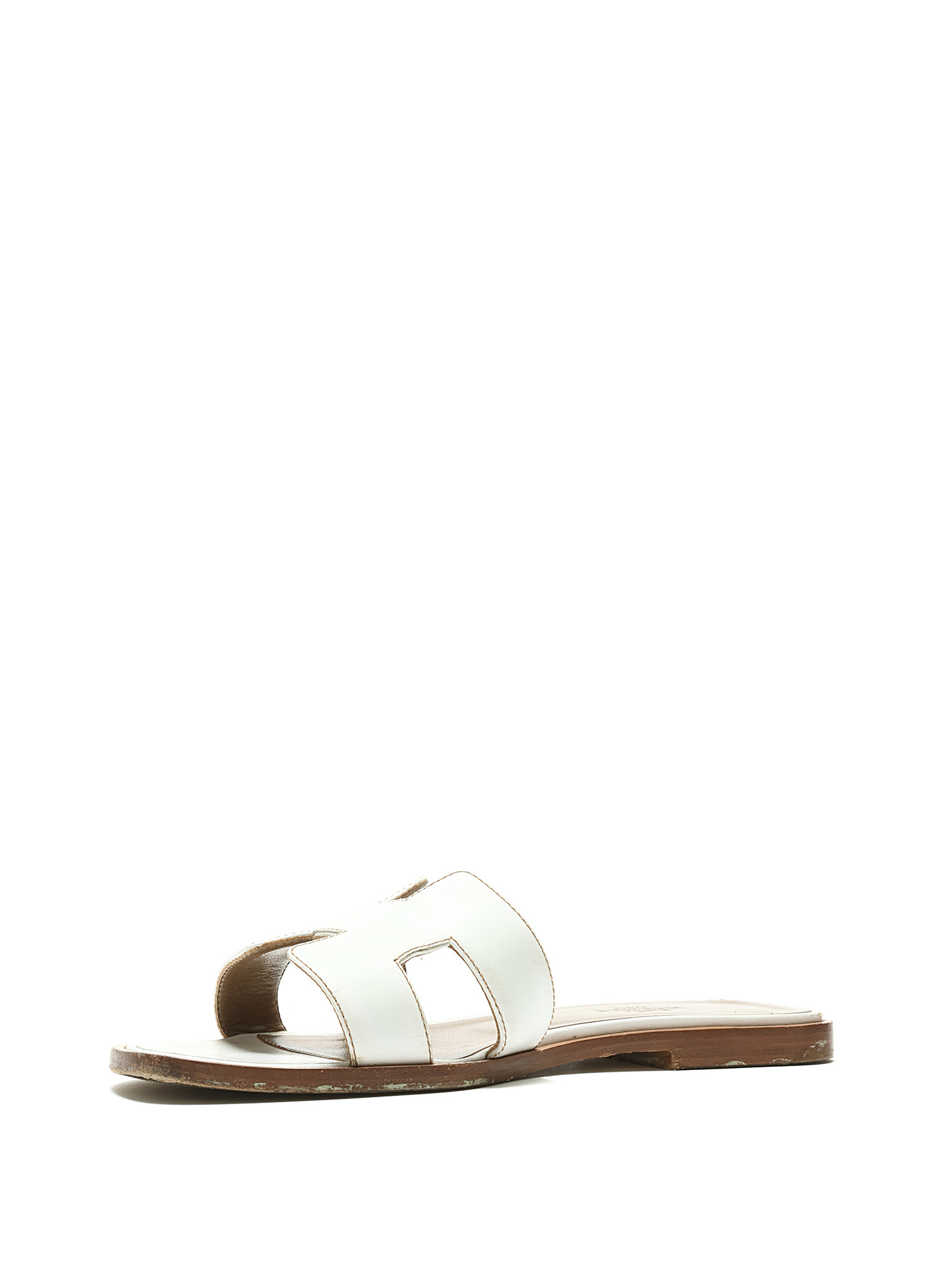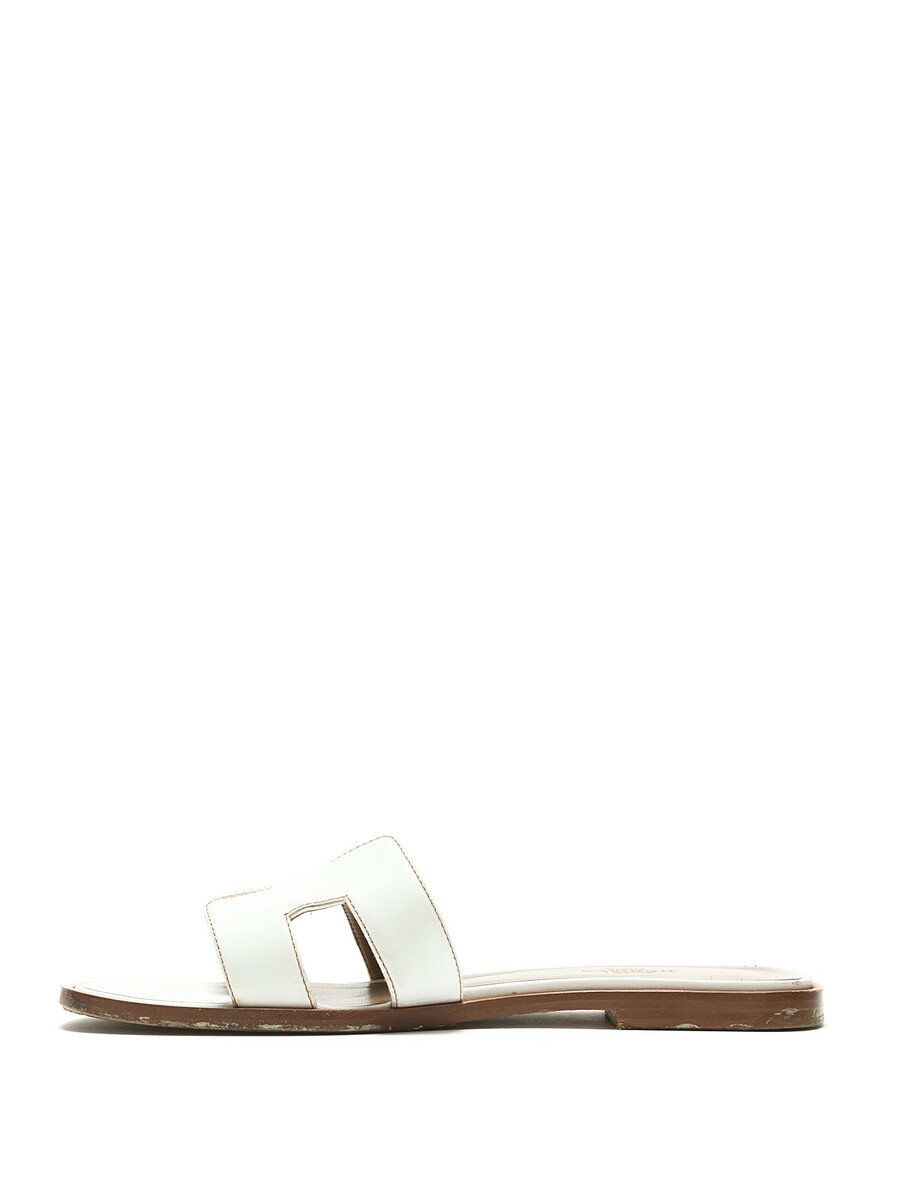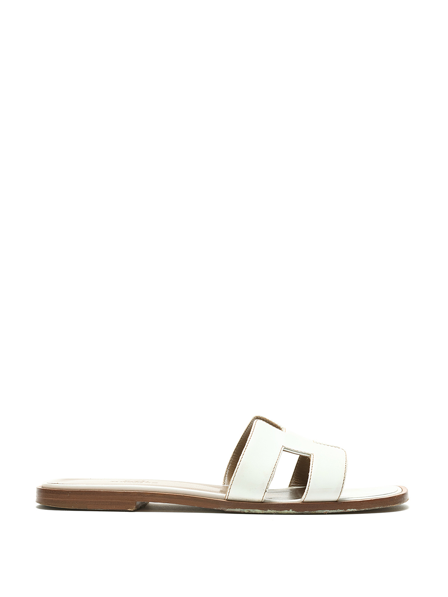 Sandales en cuir grainé blanches avec découpe à motif à logo. Bout ouvert. Semelle en cuir. Avec dust bag.