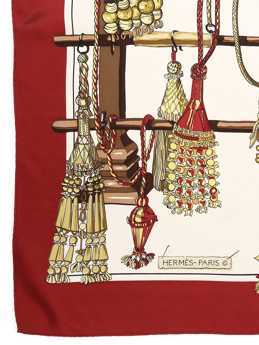 Foulard en soie avec motif de cordage et glands dans des tons de rouge, or et ivoire. Ourlet roulé avec couture ton sur ton. Signé 'Hermès Paris'.