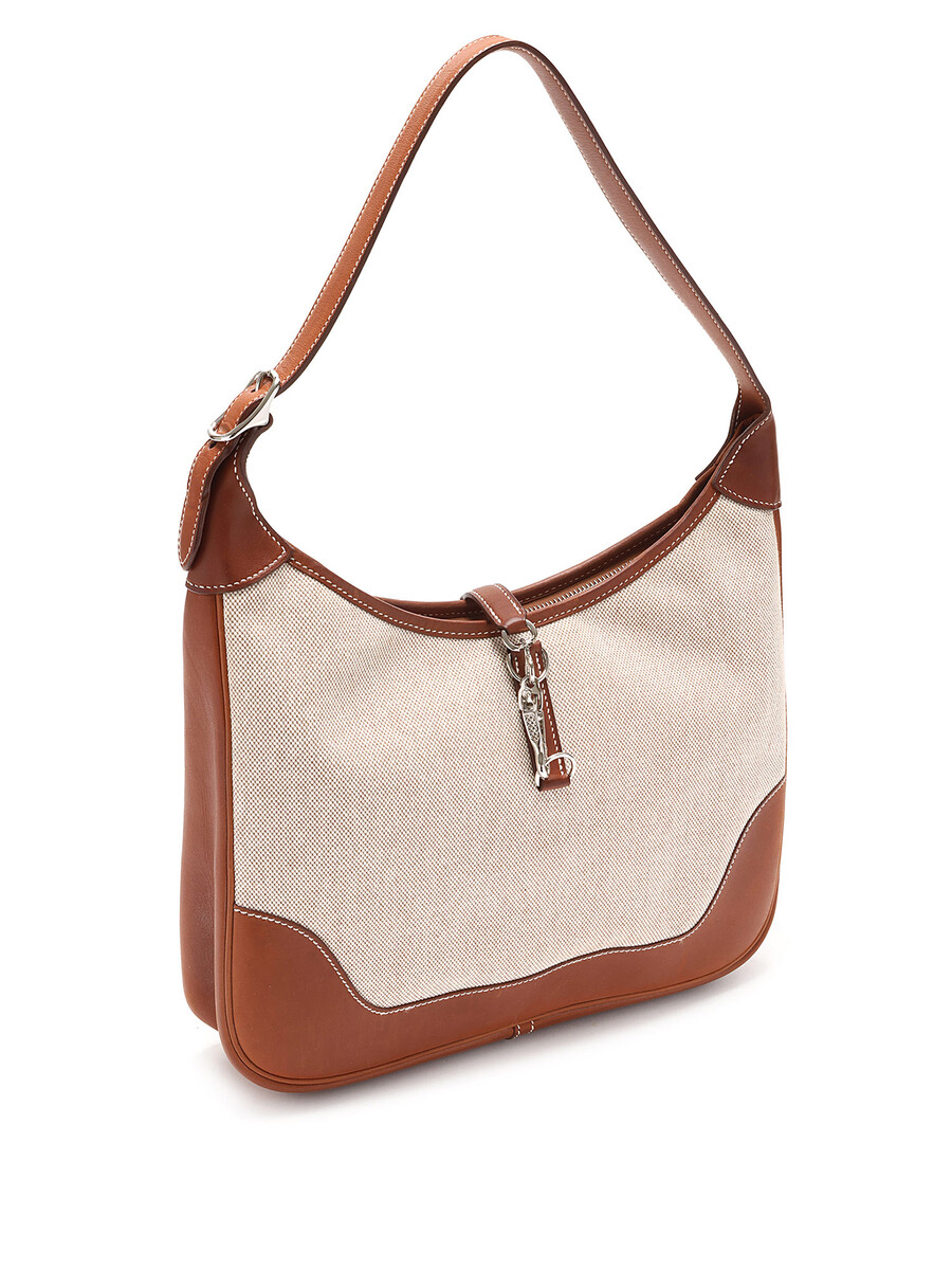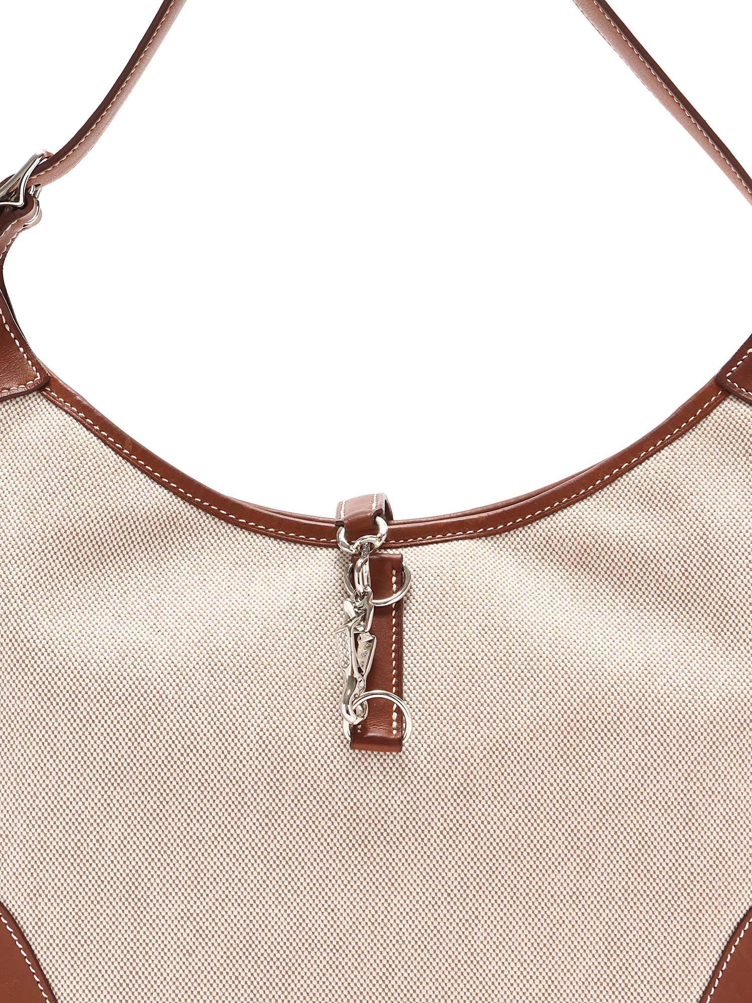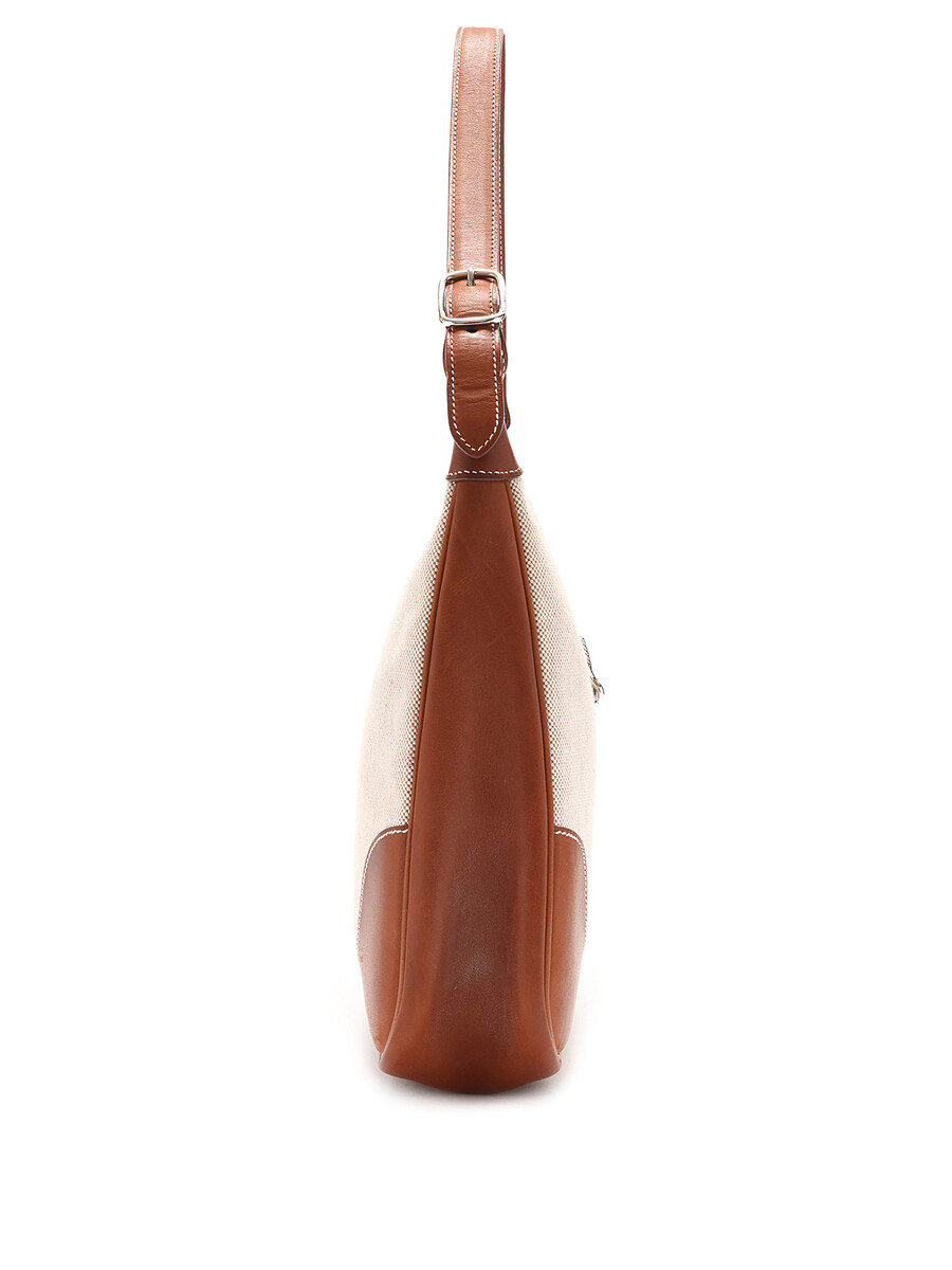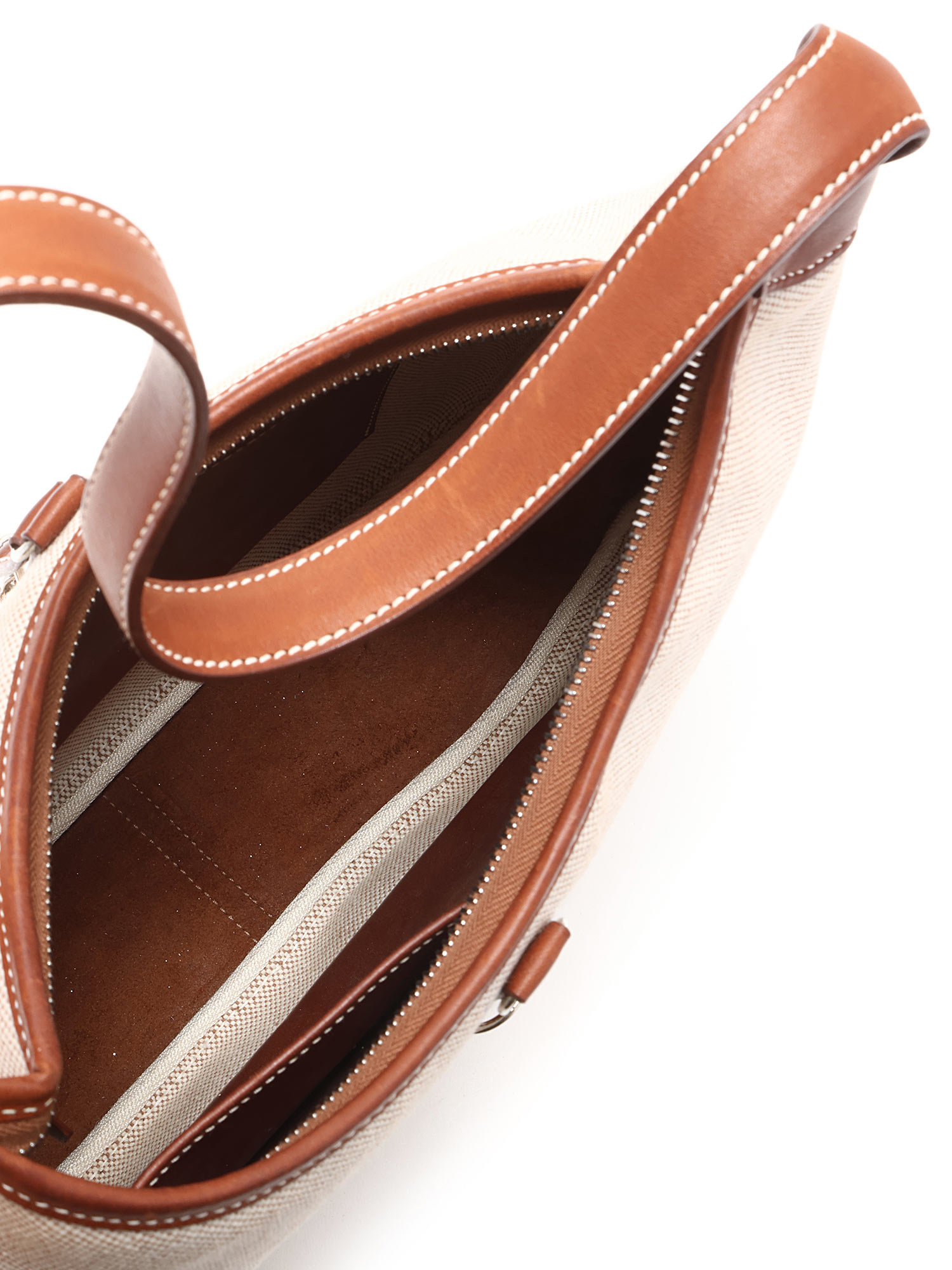Sac hobo en toile et cuir brun et beige. Bandoulière en cuir ajustable. Fermeture à glissière. Finitions en cuir. Quincaillerie argentée.