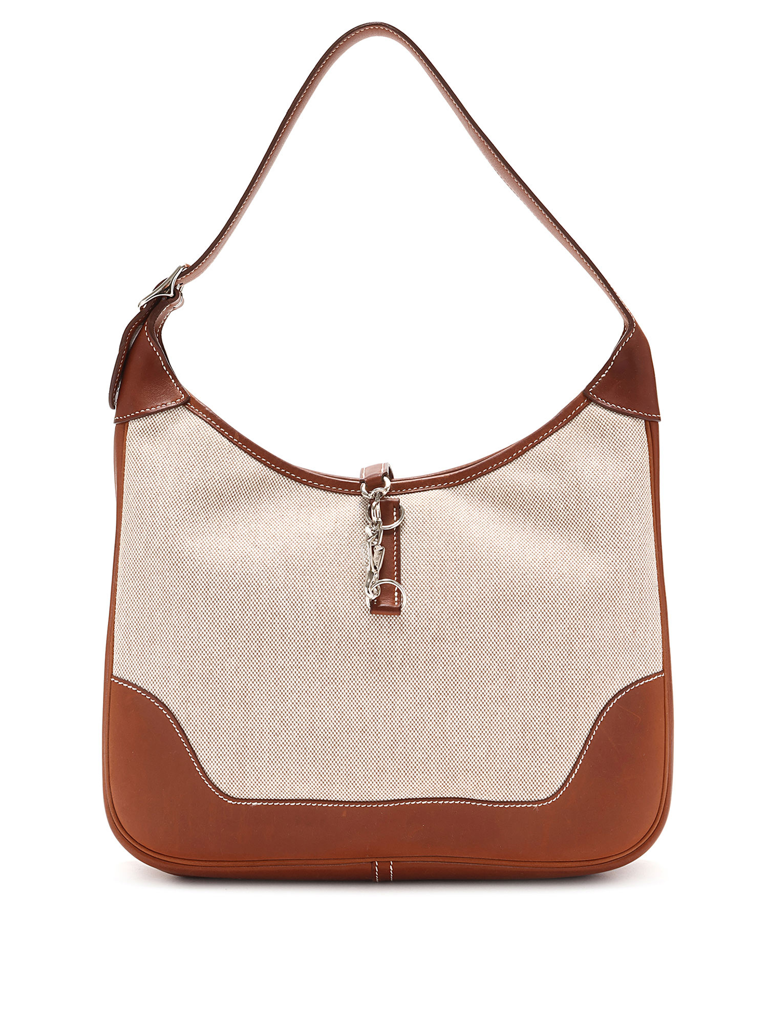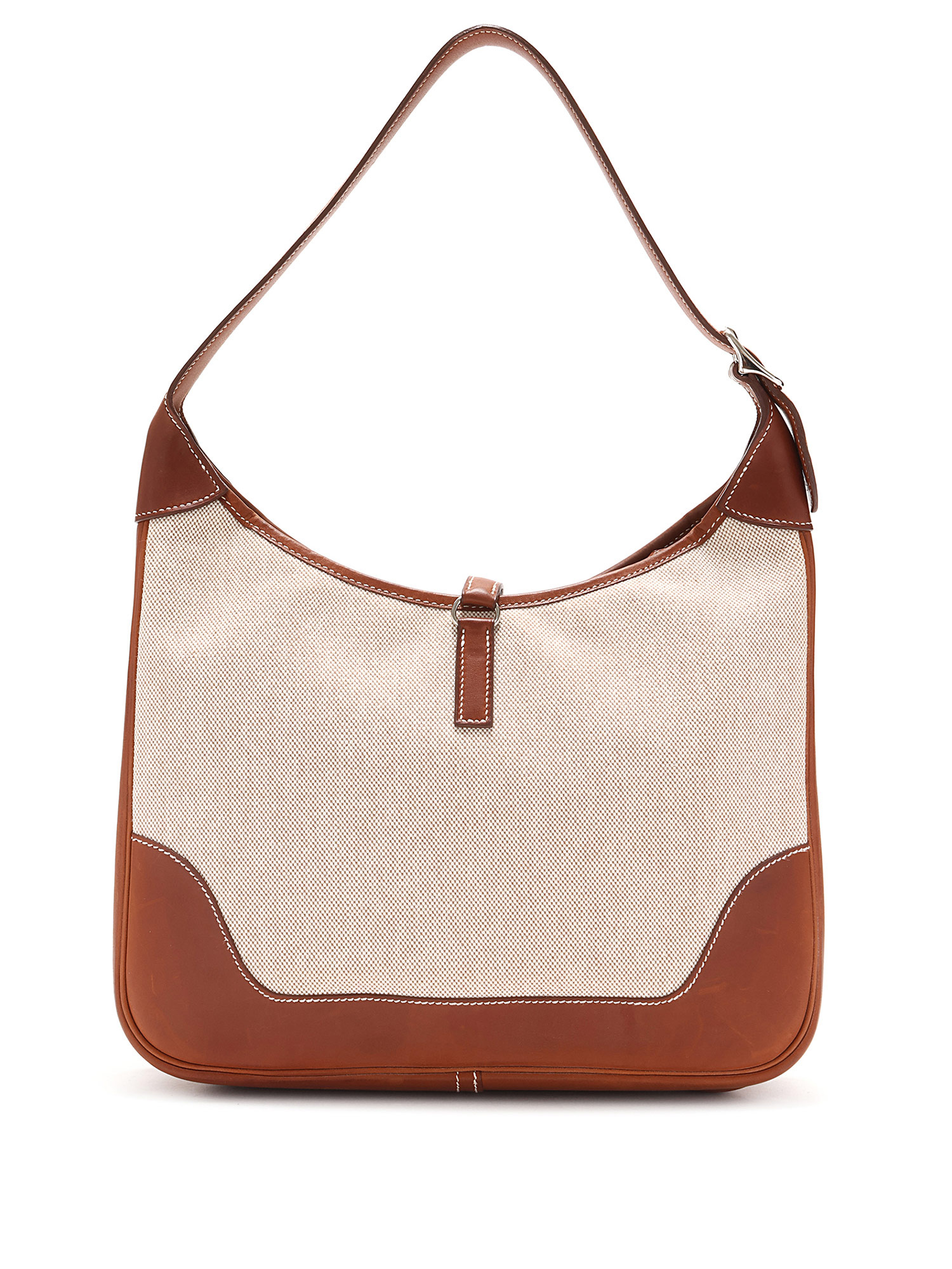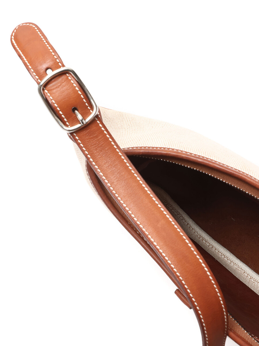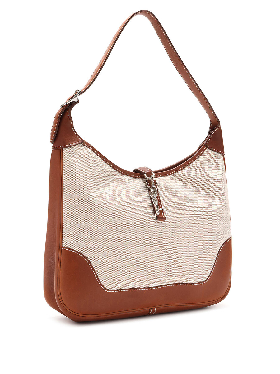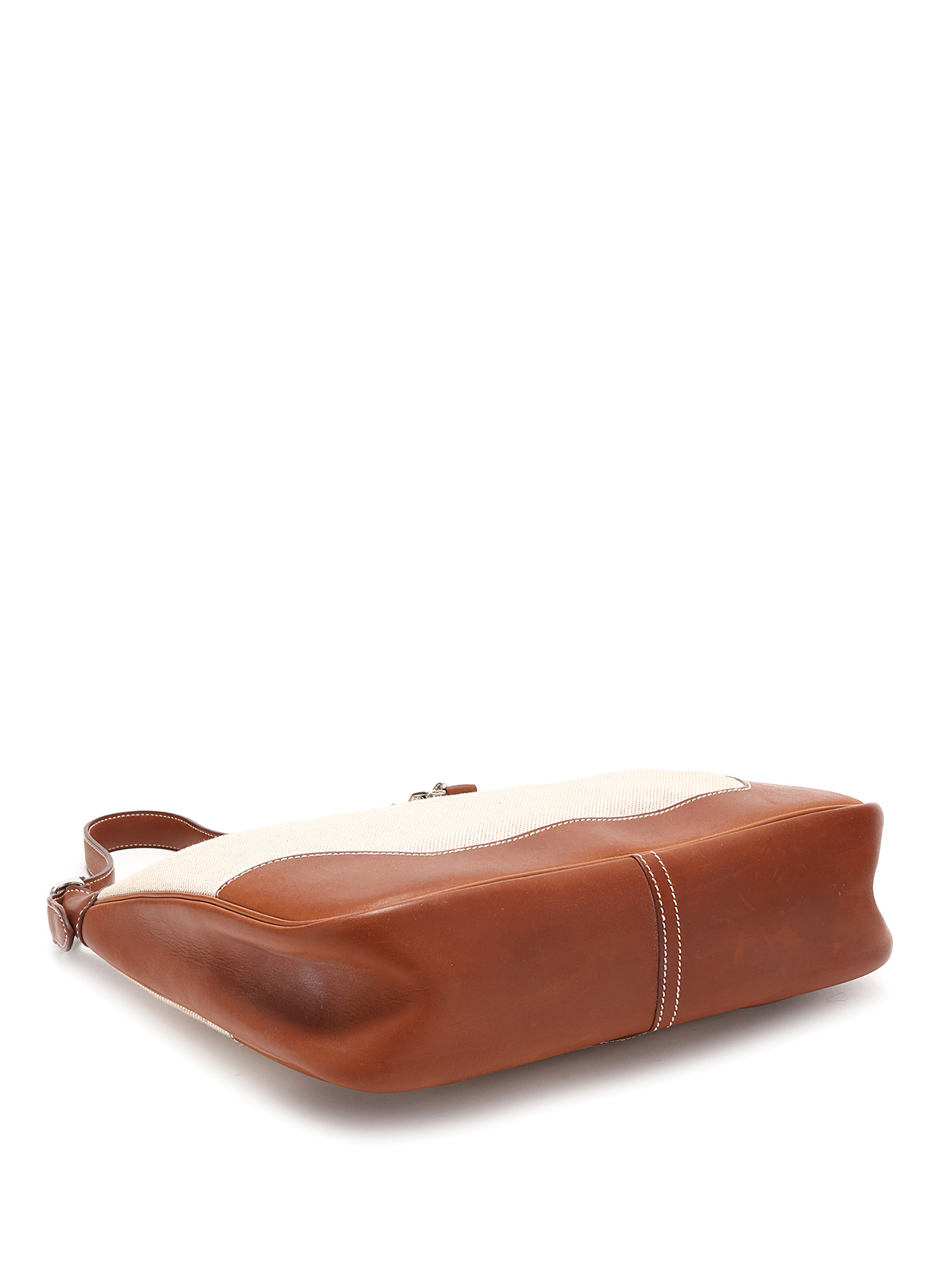 Sac hobo en toile et cuir brun et beige. Bandoulière en cuir ajustable. Fermeture à glissière. Finitions en cuir. Quincaillerie argentée.