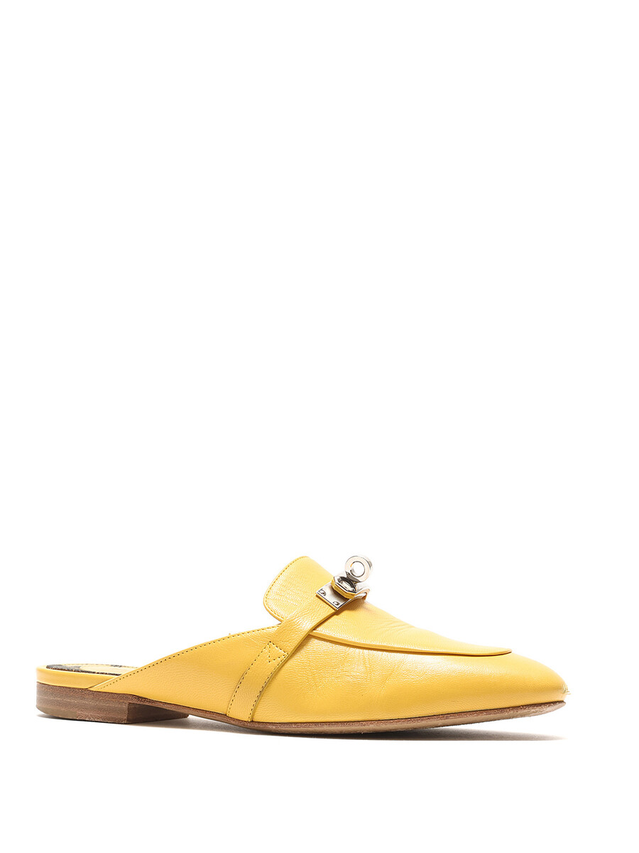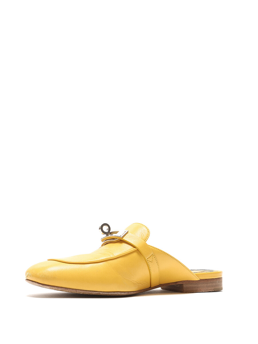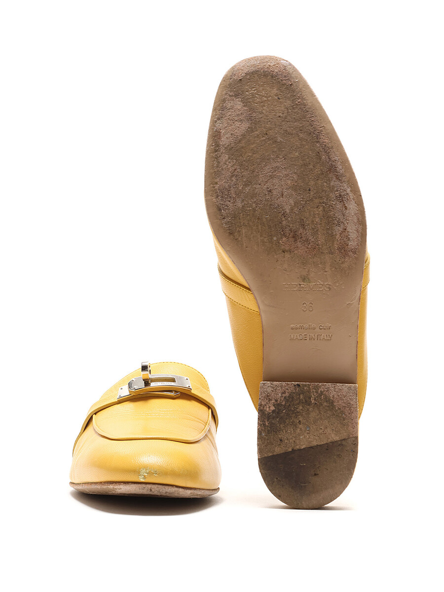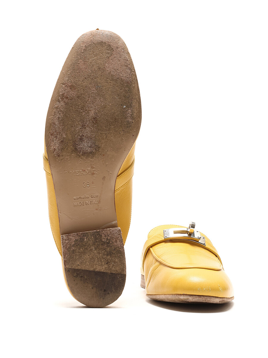 Mocassins en cuir jaune vif avec détail de verrou. Style à enfiler avec bout rond fermé. Semelle en cuir. Livrés avec un sac à poussière Hermès.