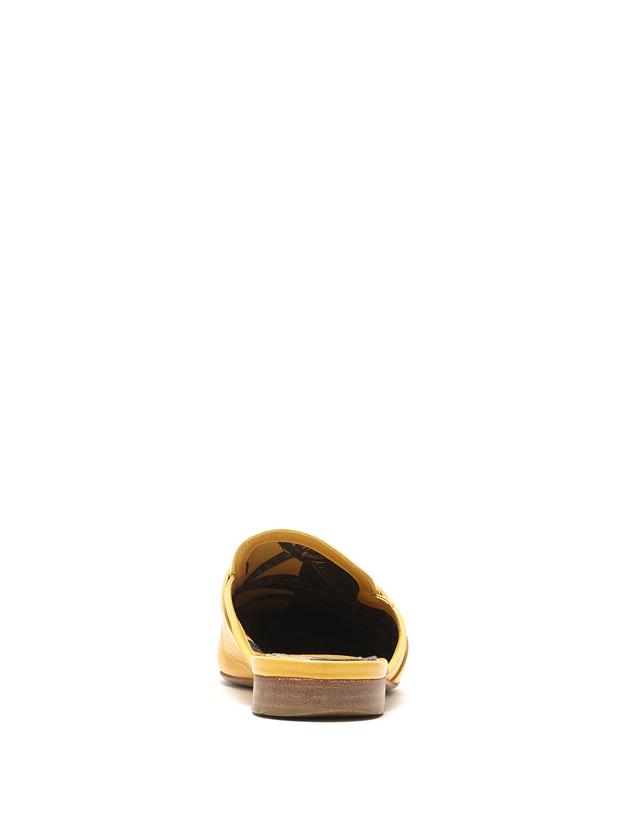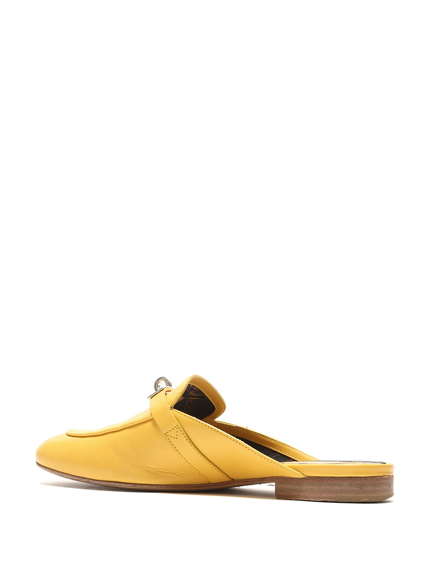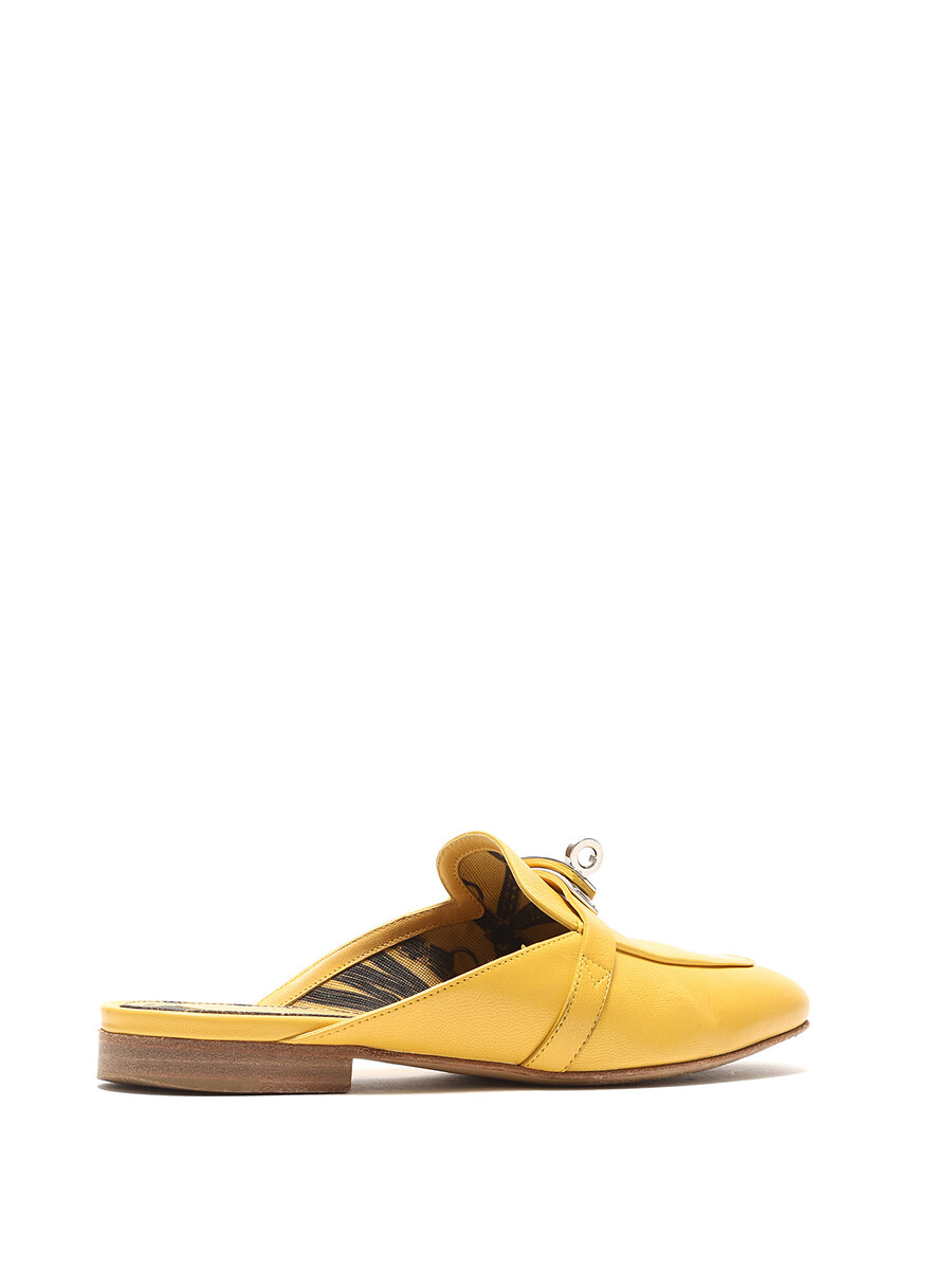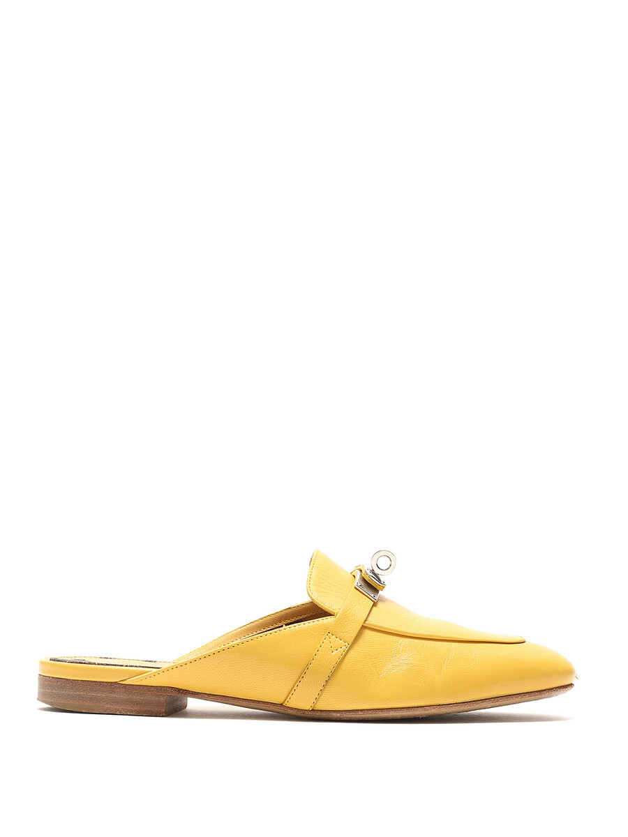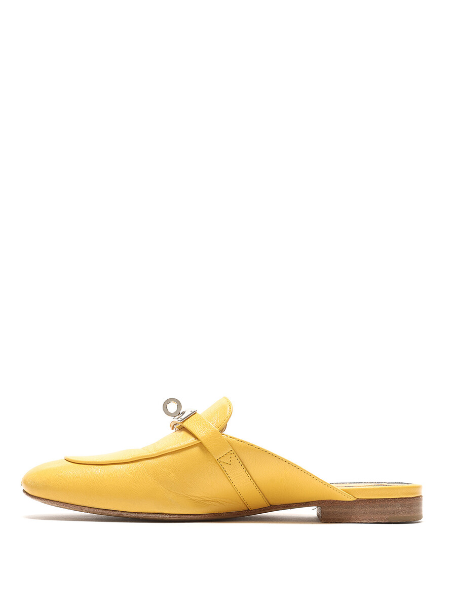 Mocassins en cuir jaune vif avec détail de verrou. Style à enfiler avec bout rond fermé. Semelle en cuir. Livrés avec un sac à poussière Hermès.