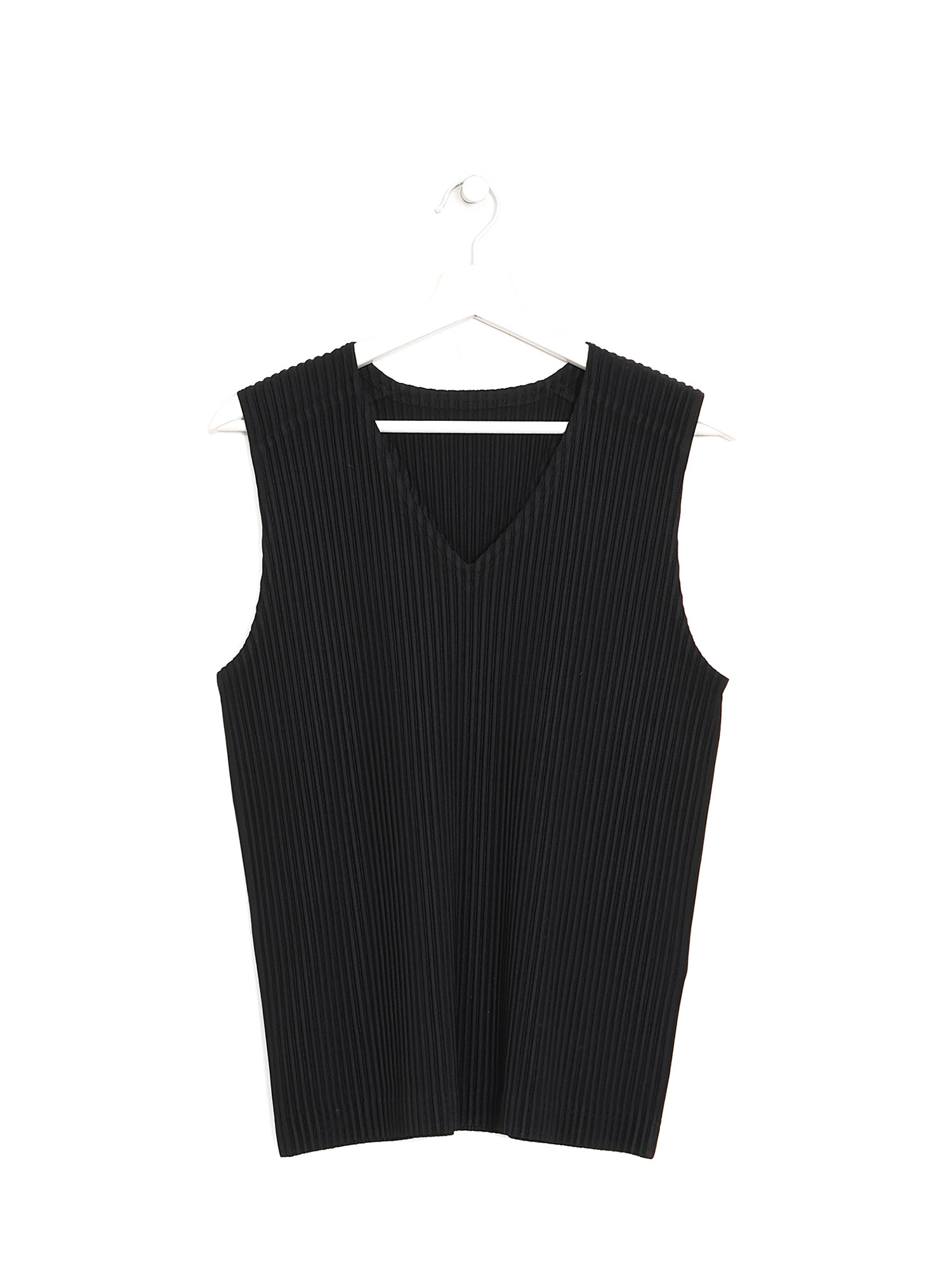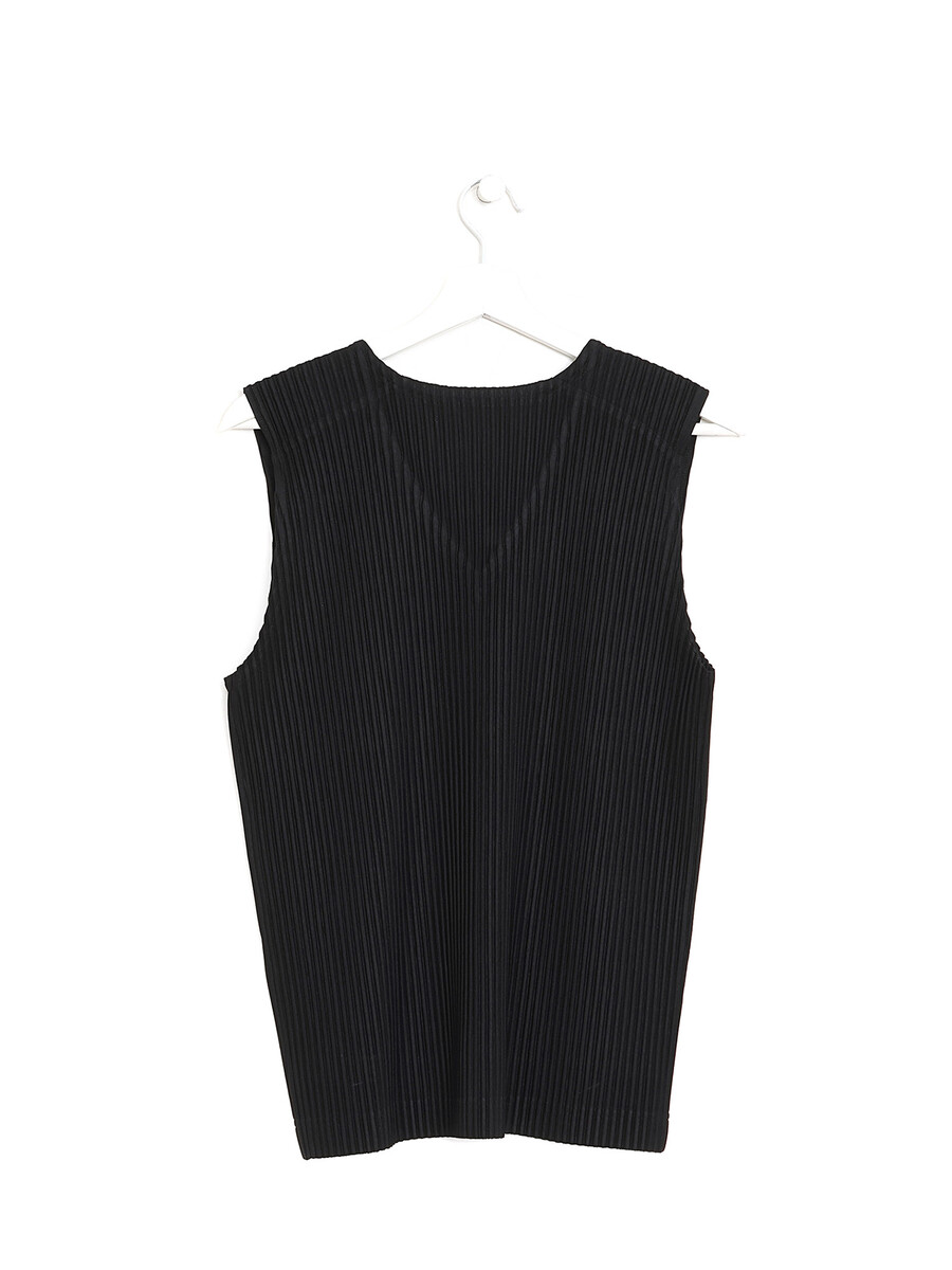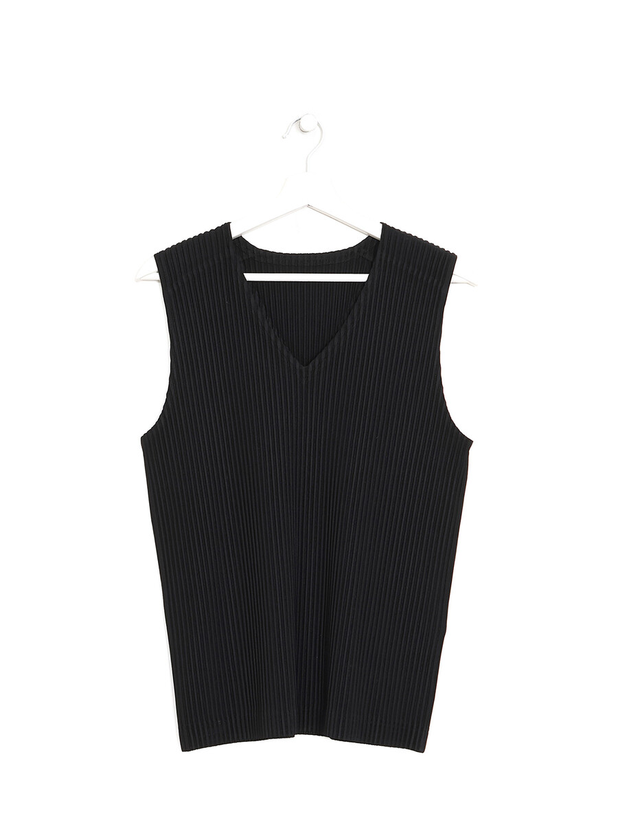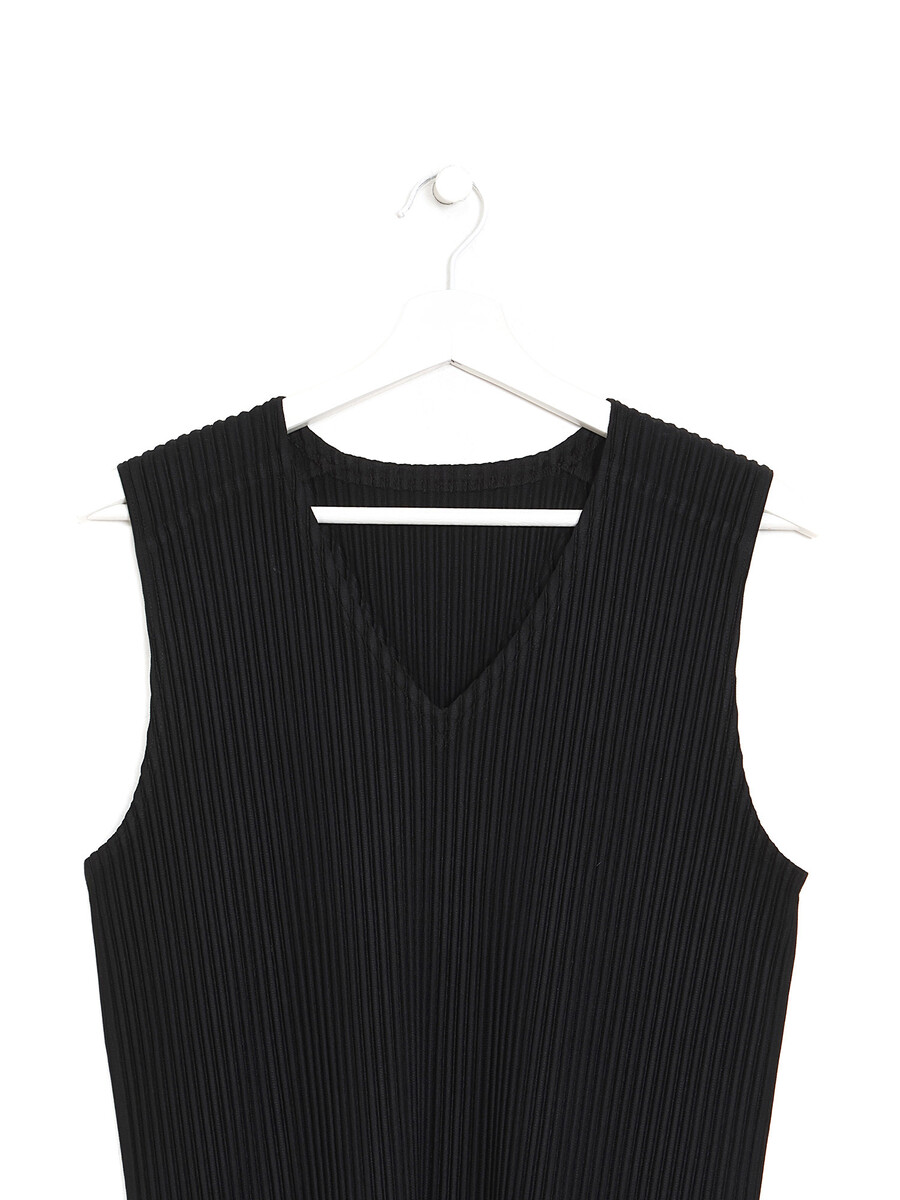 Haut plissé sans manches à col en V noir. Tissu léger et respirant en polyester. Finition ton sur ton. Parfait pour superposition.