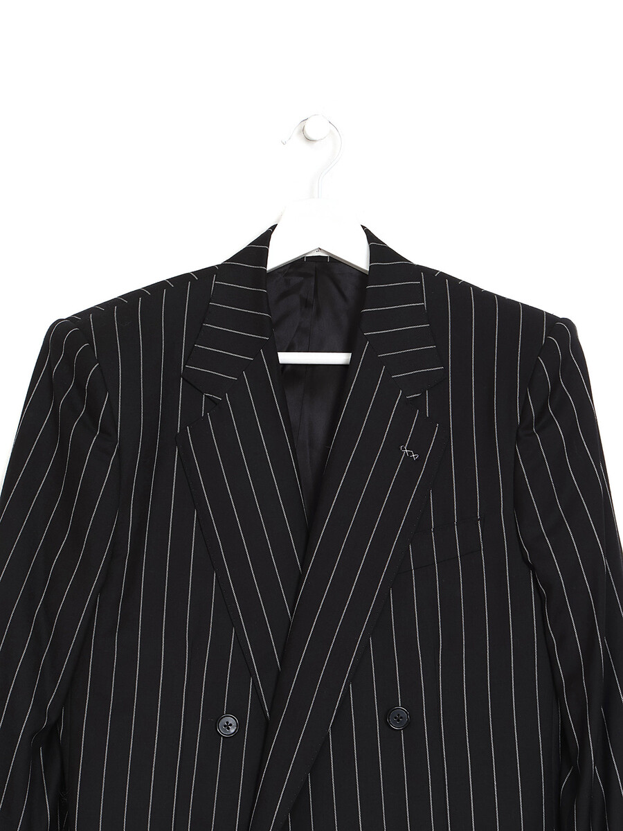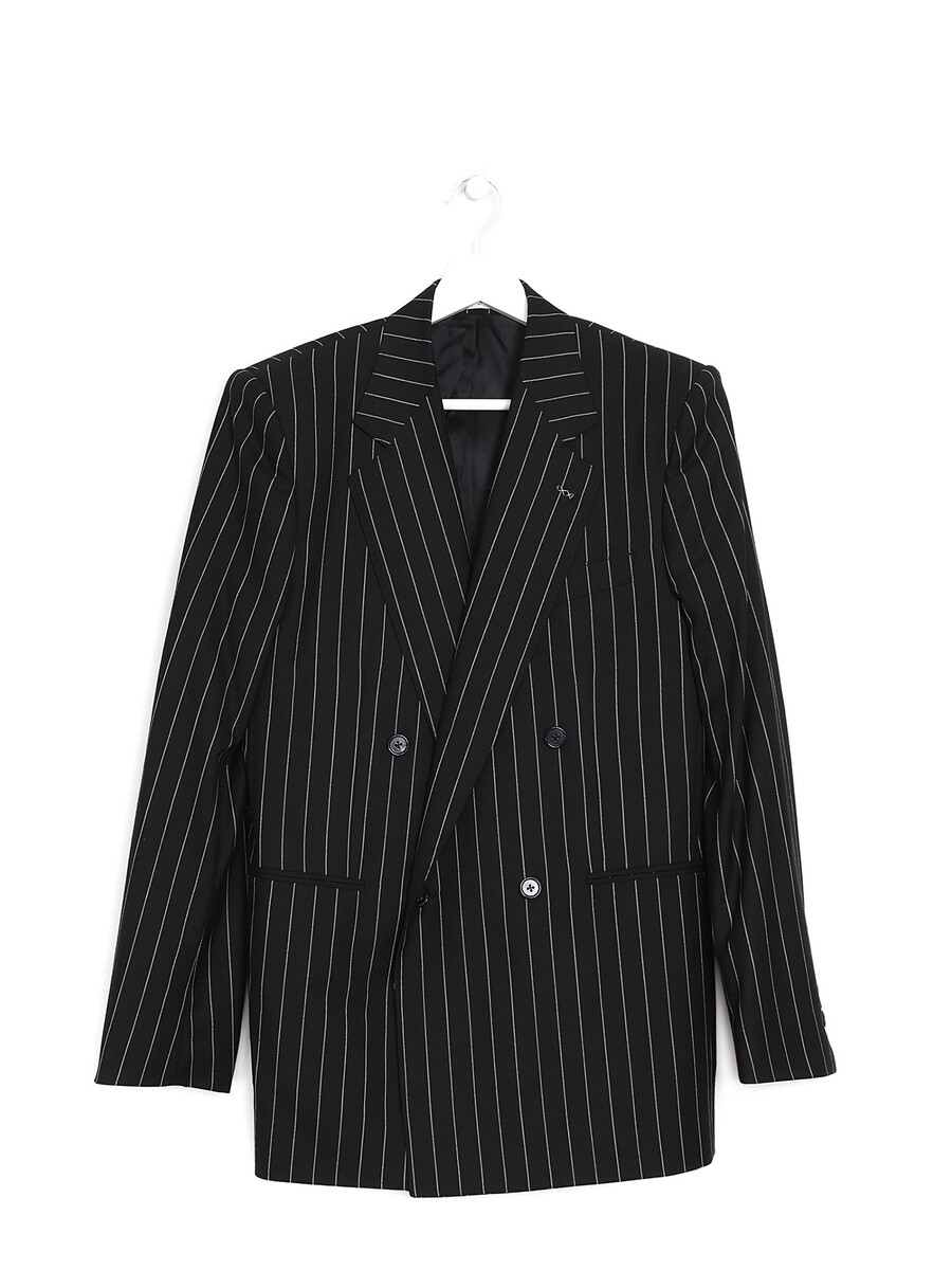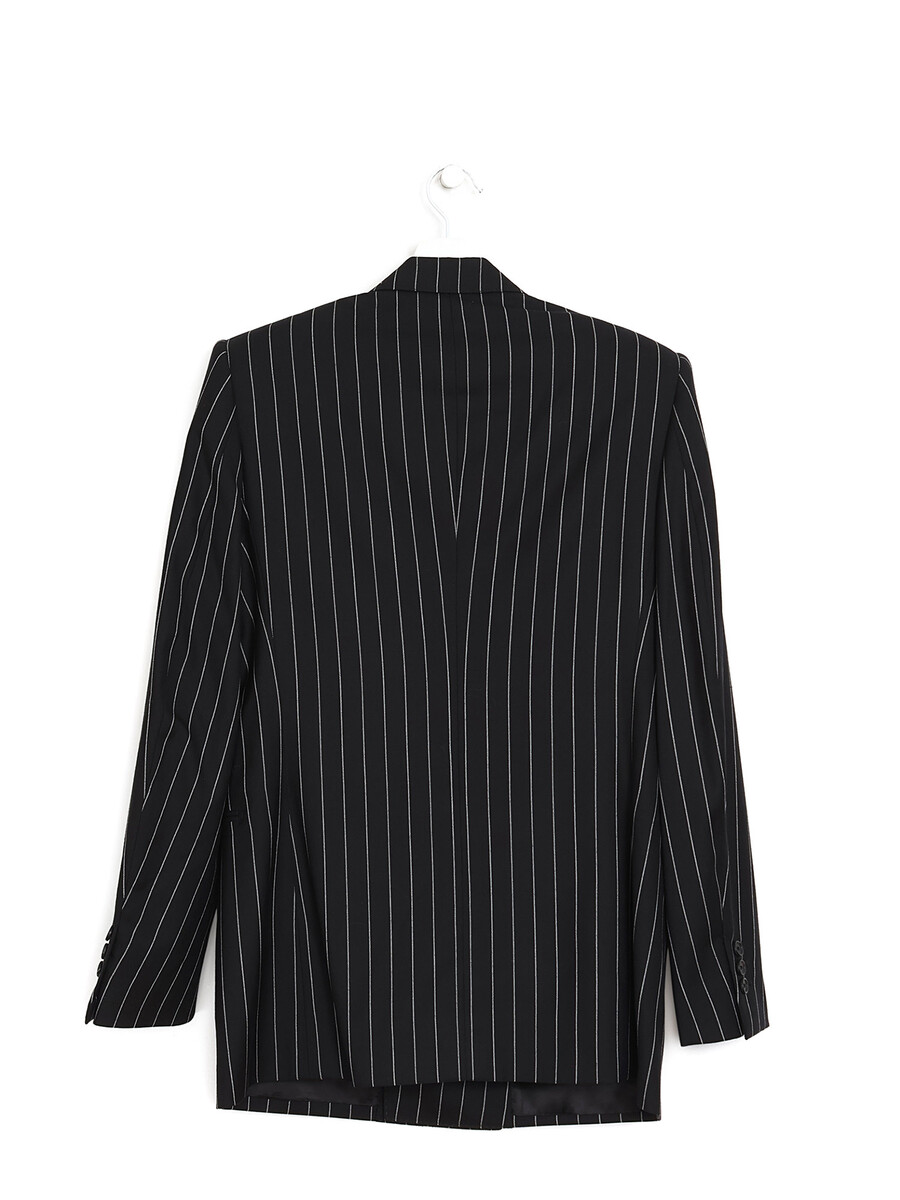 Veste en laine rayée à coupe classique. Conçue pour une silhouette nette, elle présente une fermeture à simple boutonnage, des revers crantés et des poches passepoilées.