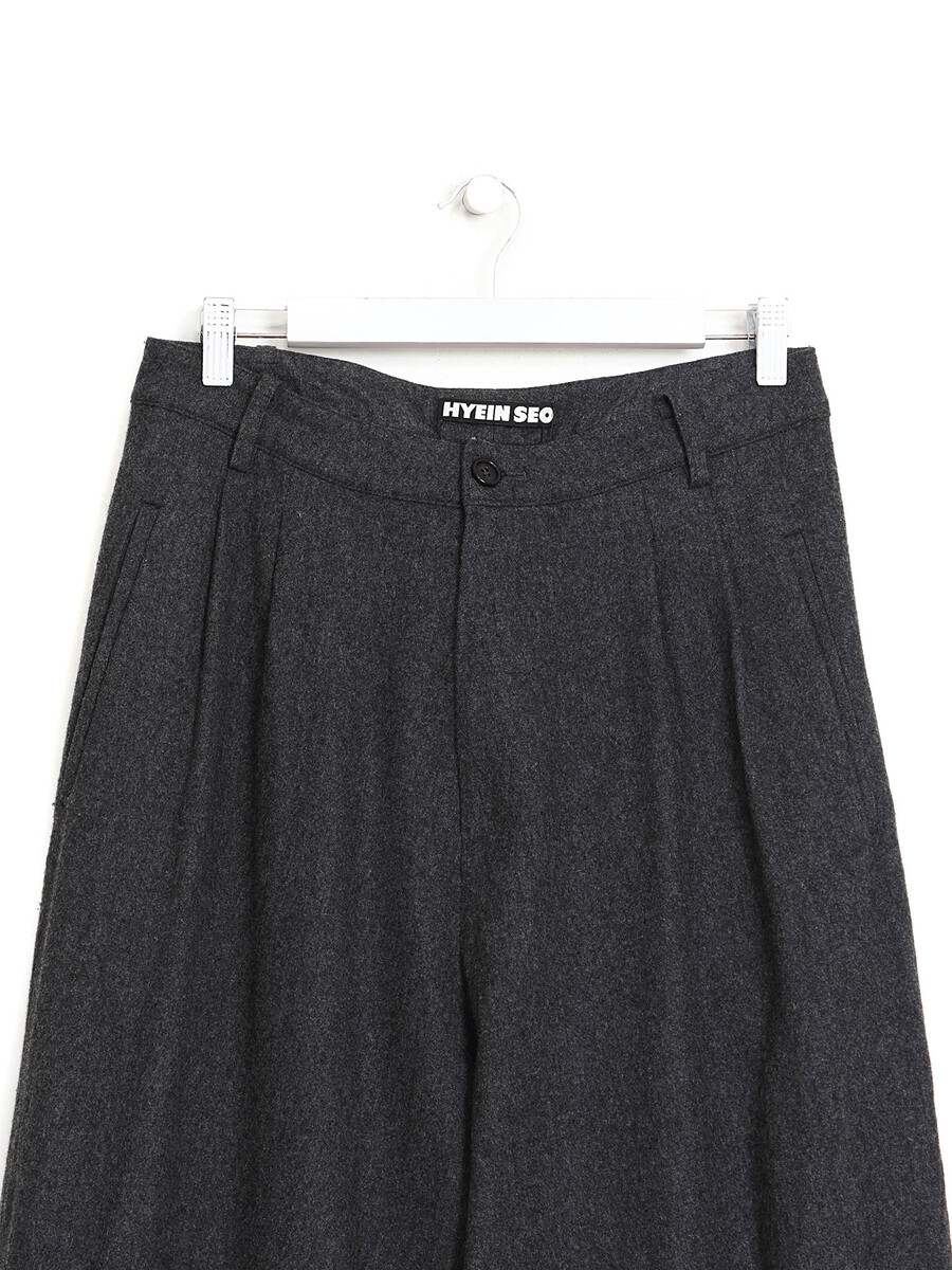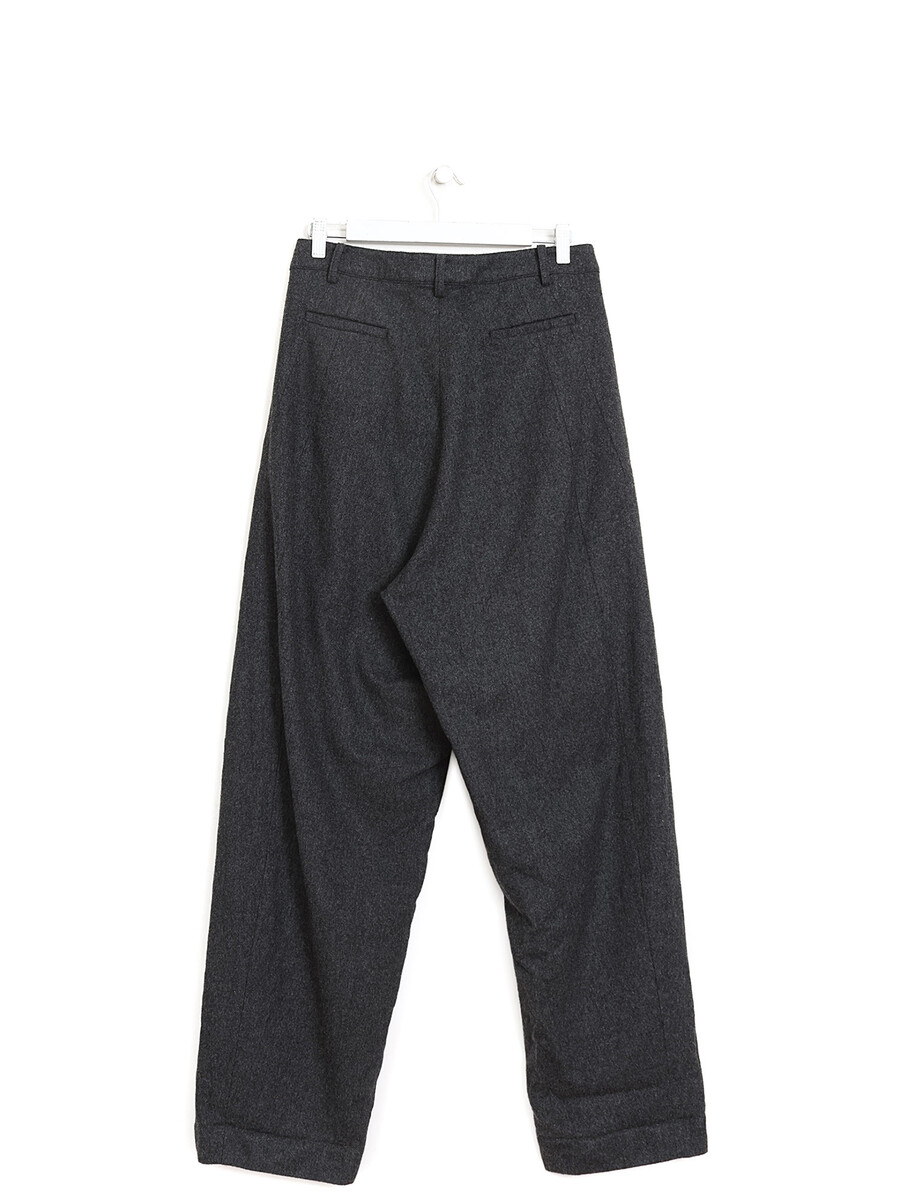 Pantalon à jambes droites en laine grise. Plis à l'avant et passants de ceinture.