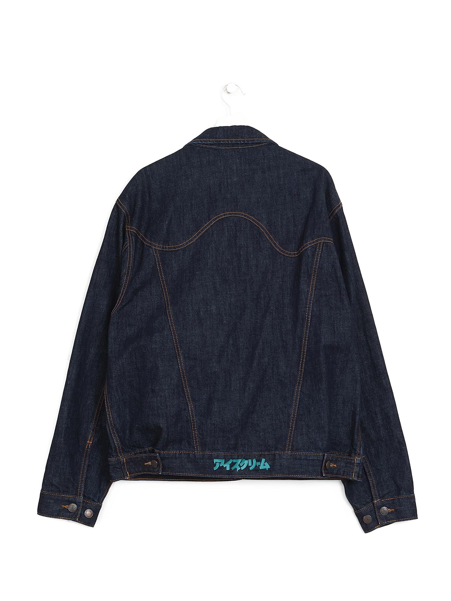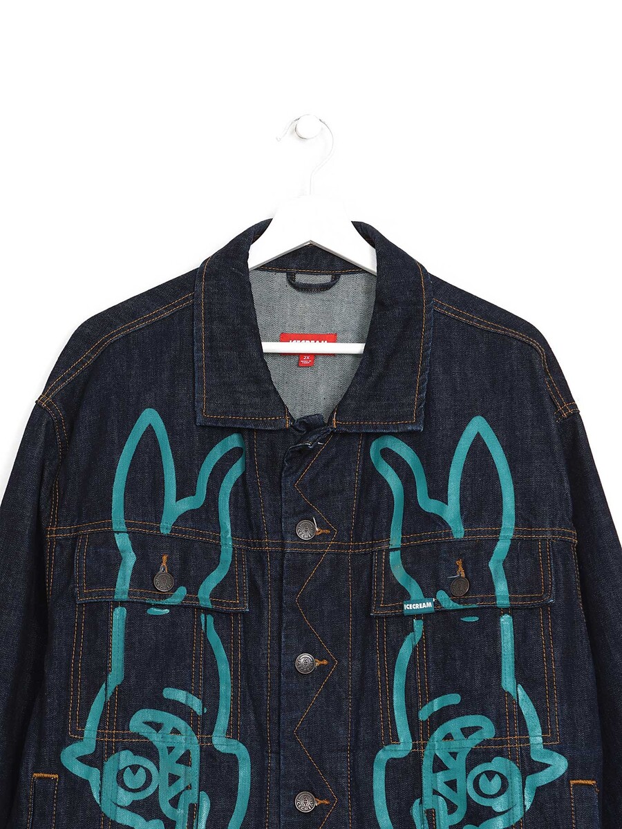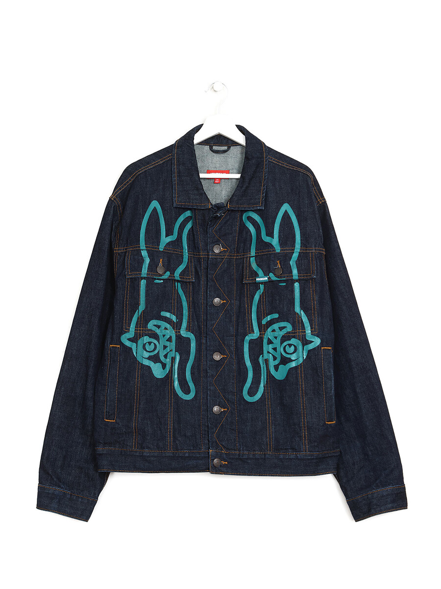 Veste en denim à manches longues avec impression graphique en bleu denim et accents turquoise. Fermeture à boutons sur le devant. Col de chemise. Poches plaquées à rabat sur la poitrine.