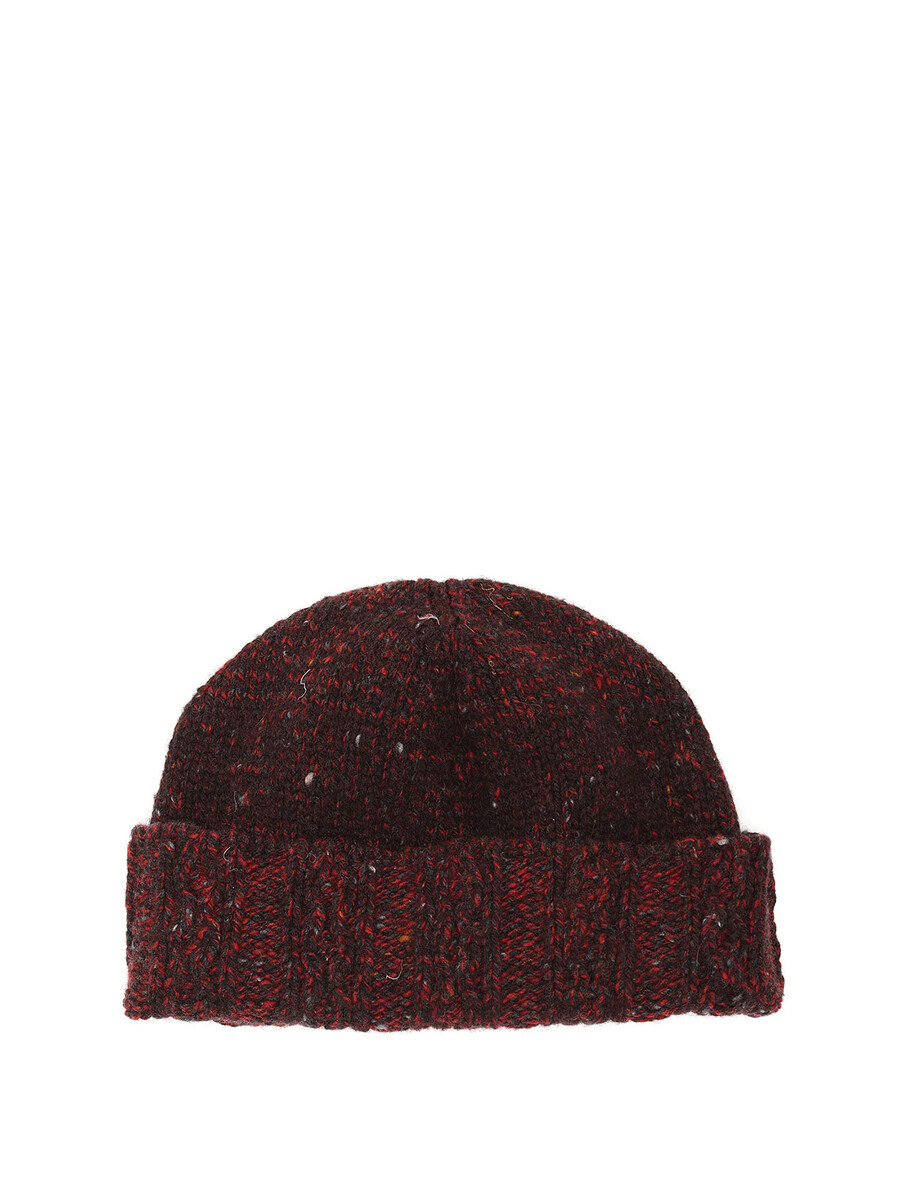 Bonnet tricoté rouge confectionné à partir d'un mélange luxueux de laine mérinos et cachemire.