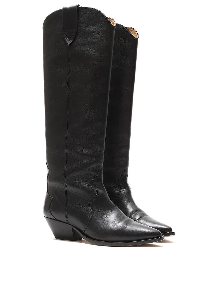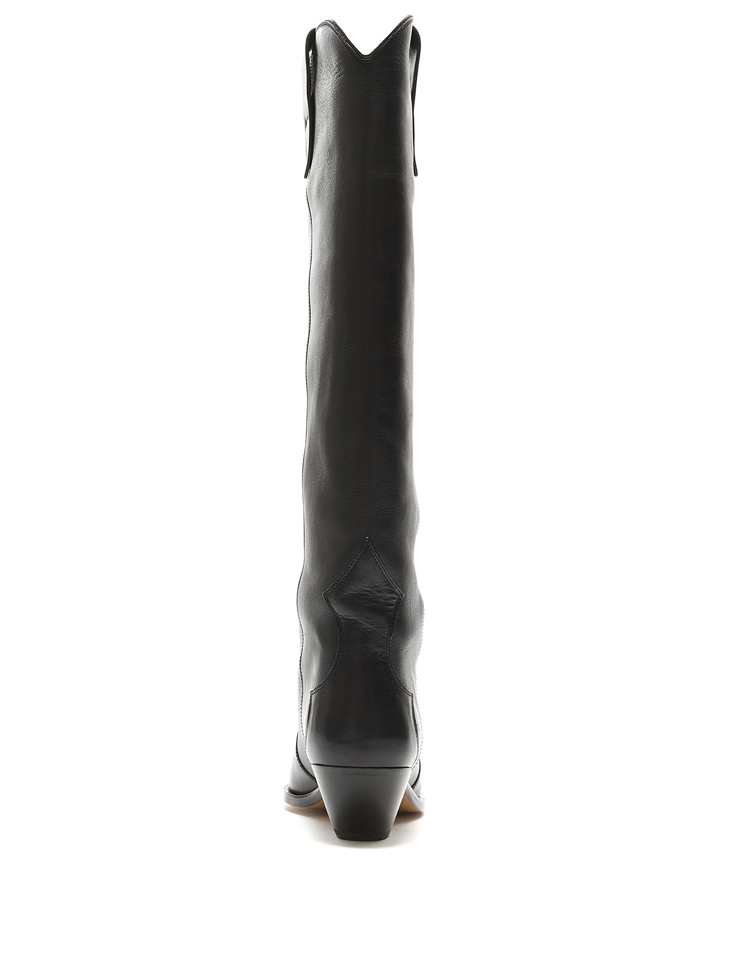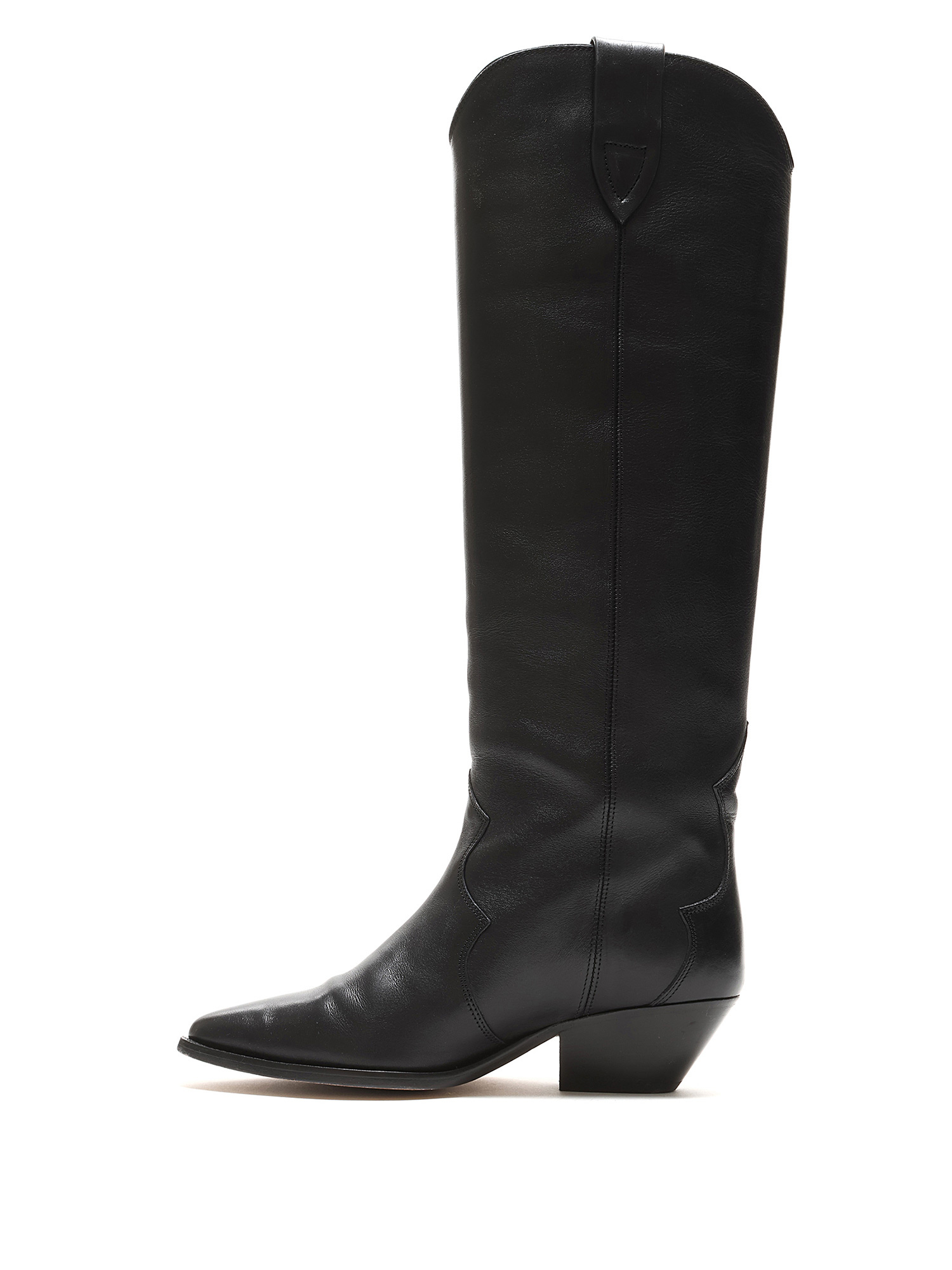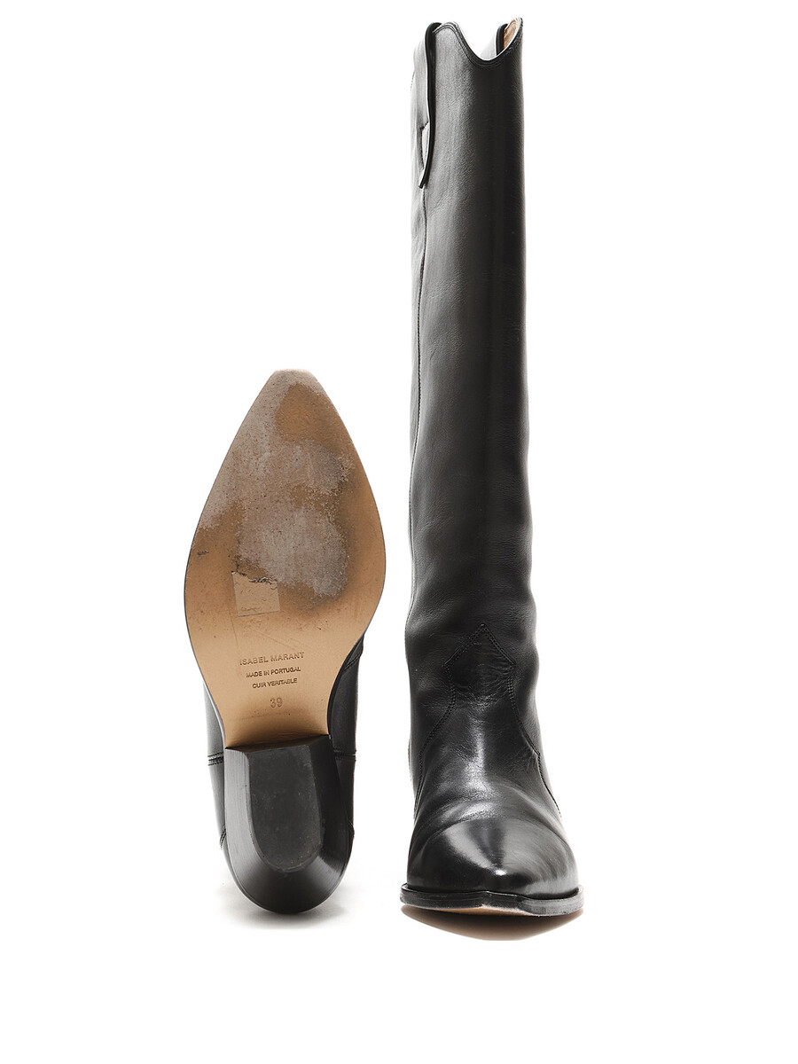 Bottes en cuir à hauteur de genou avec un bout pointu. Style cowboy à enfiler. Semelle en cuir.