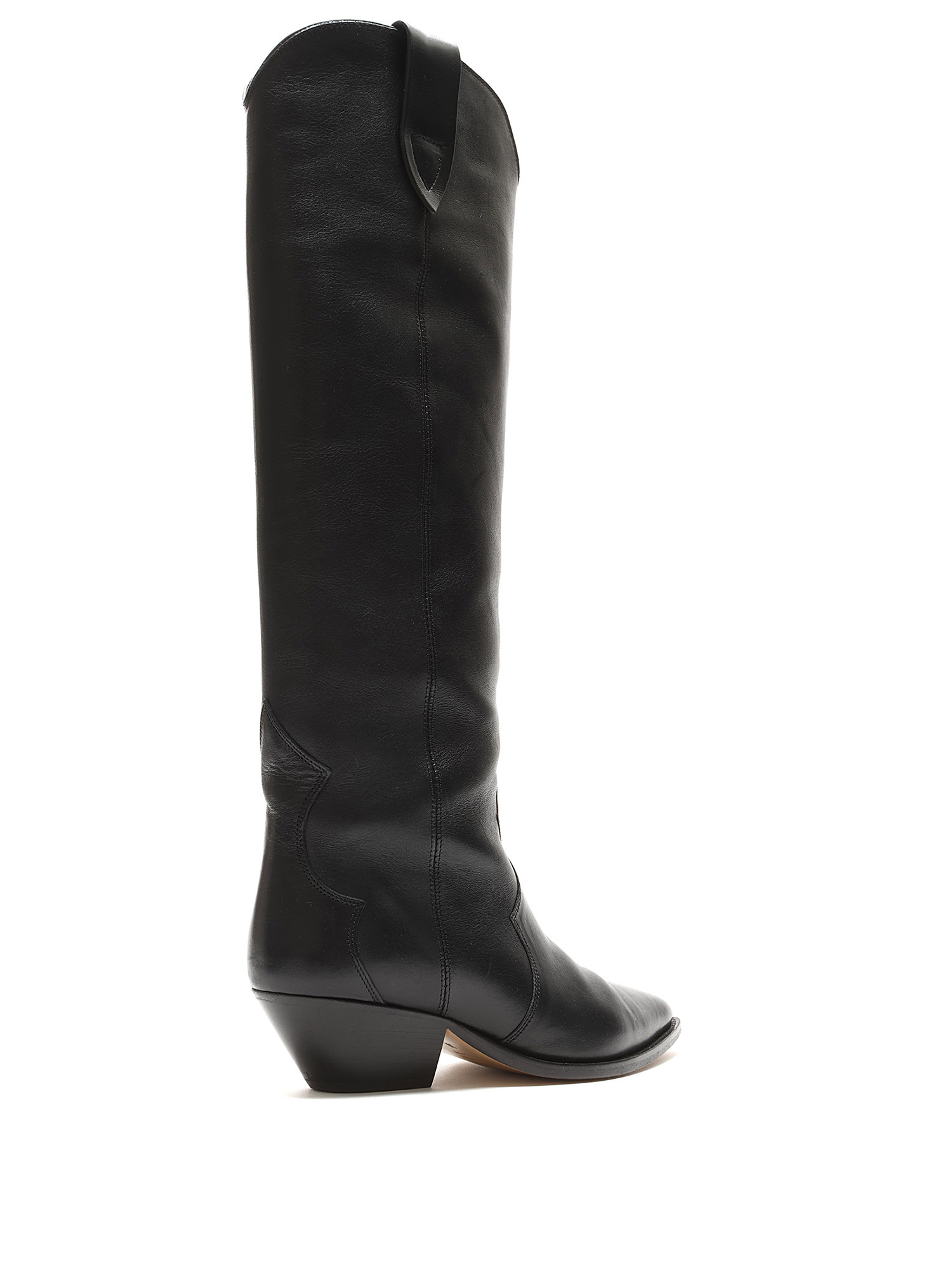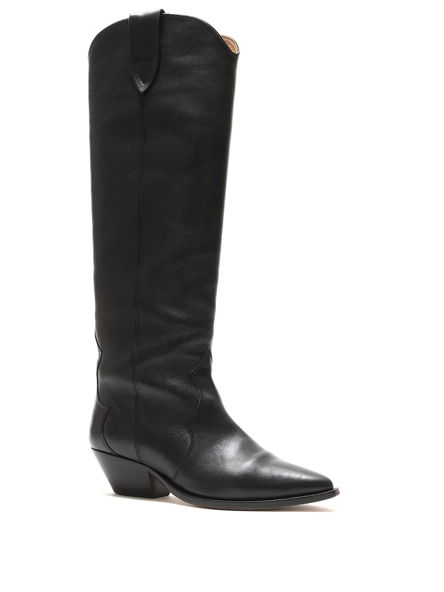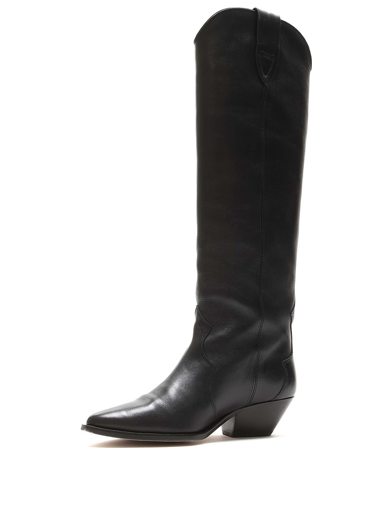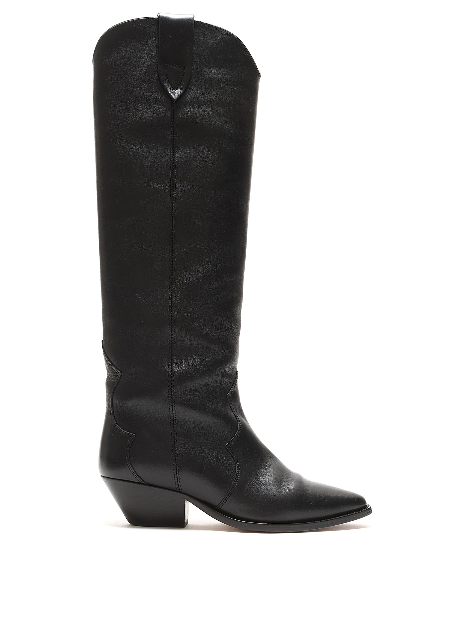 Bottes en cuir à hauteur de genou avec un bout pointu. Style cowboy à enfiler. Semelle en cuir.