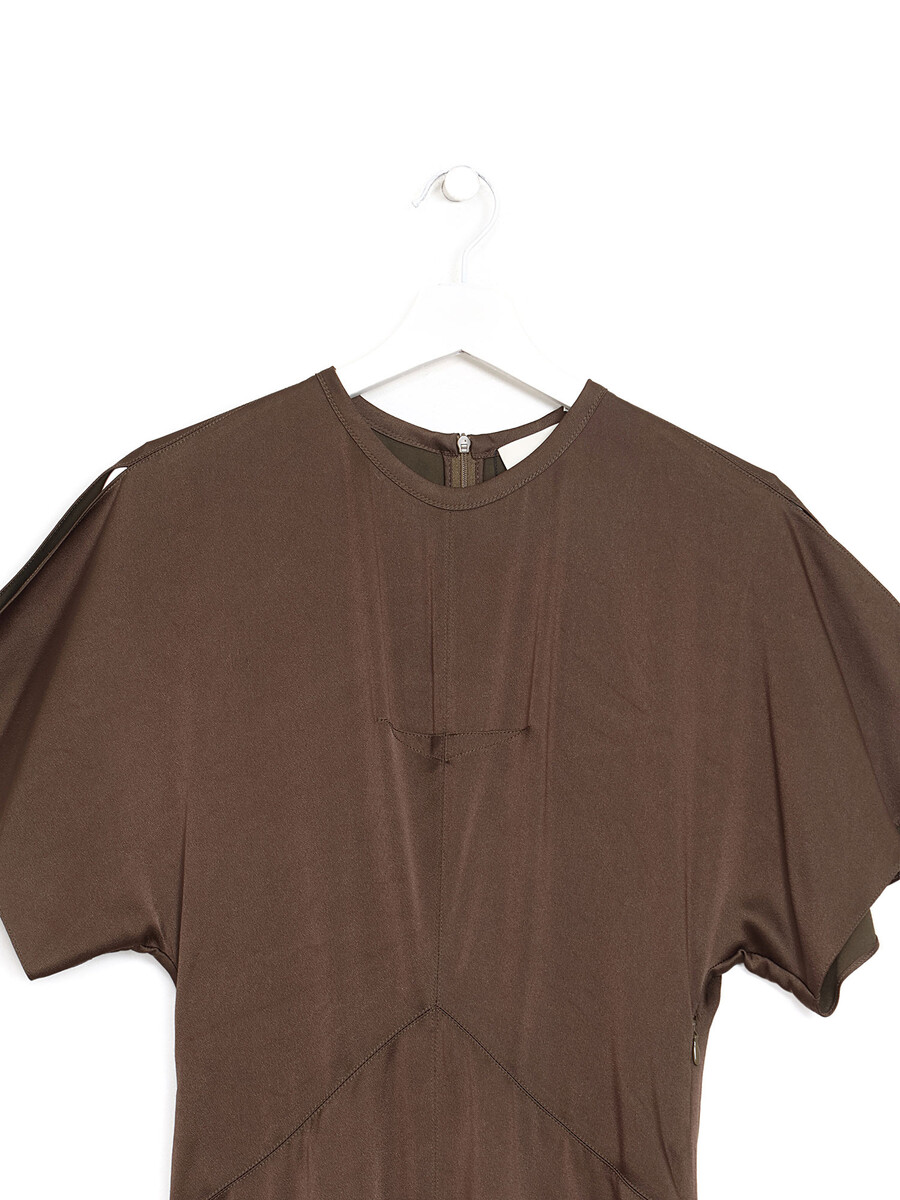 Robe à manches courtes brune. Fermeture éclair centrale au dos. Encolure ronde.