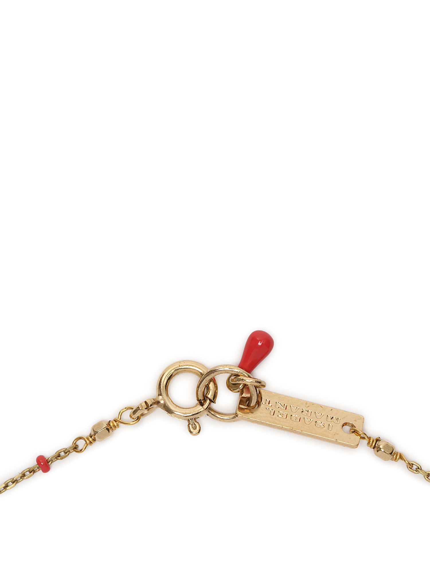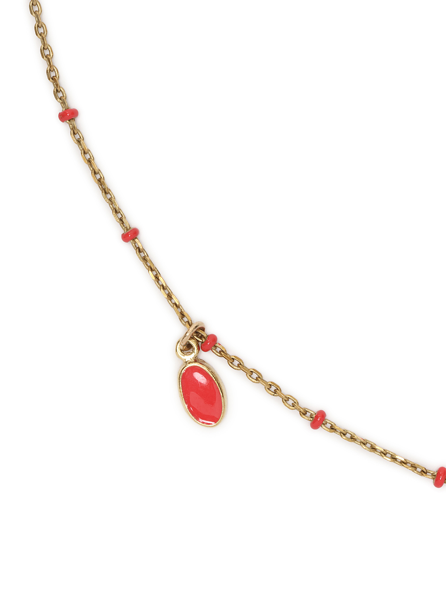 Collier doré avec chaîne délicate ornée d’un charm goutte rouge et de perles. En laiton et résine. Livré avec pochettes.