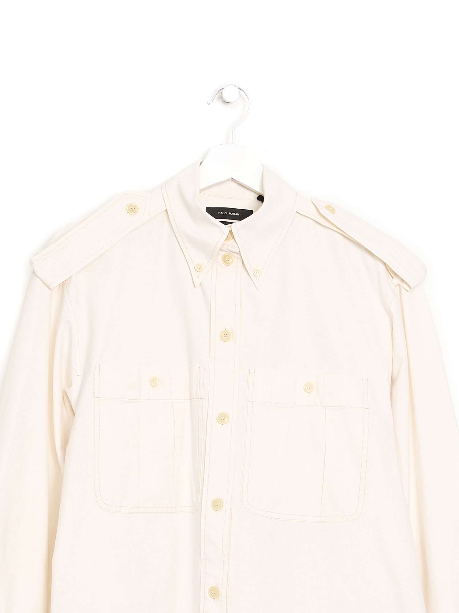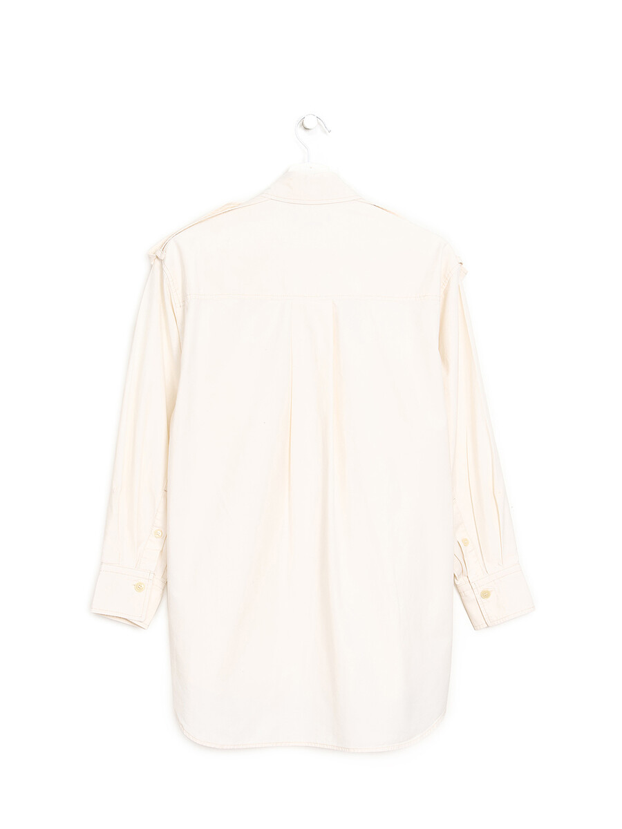 Chemise à manches longues en coton beige avec fermeture à boutons. Col classique de chemise et deux poches poitrine.