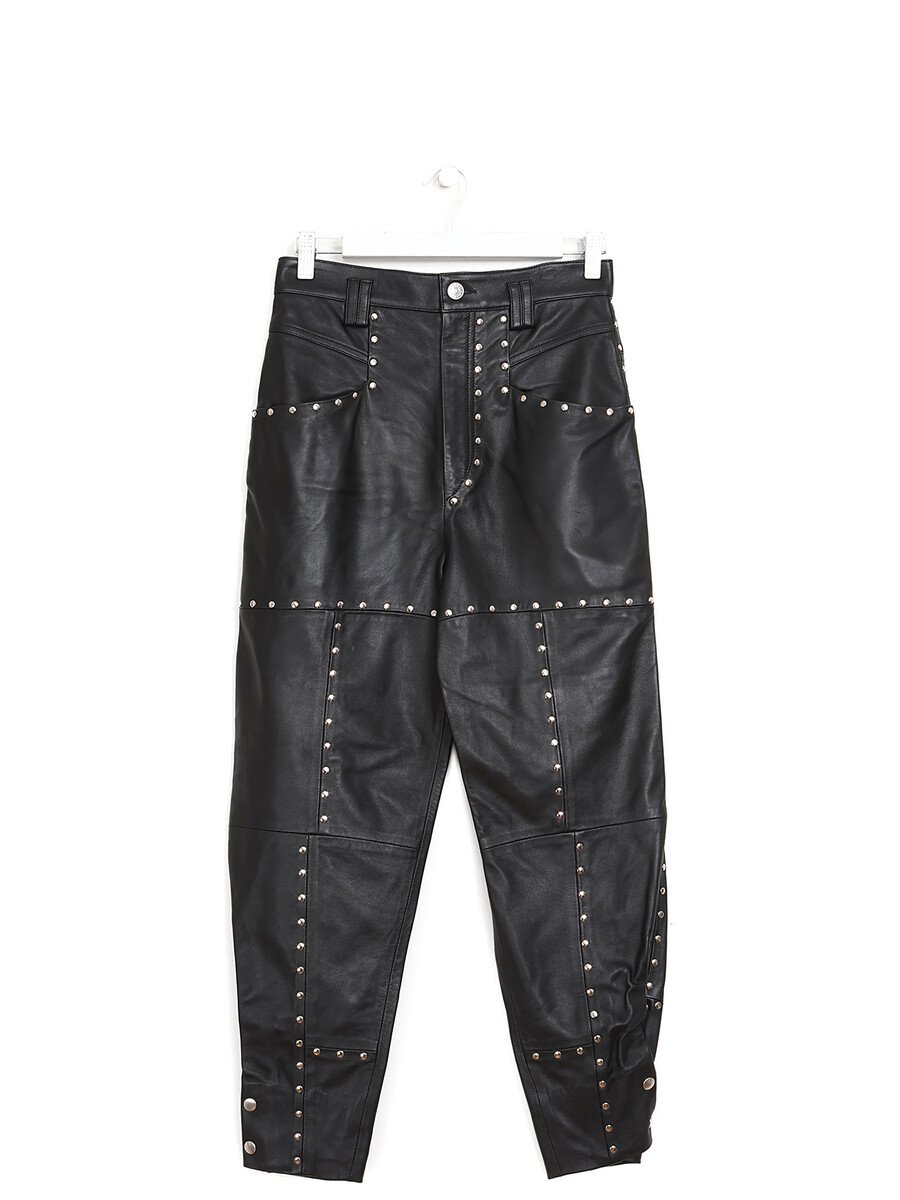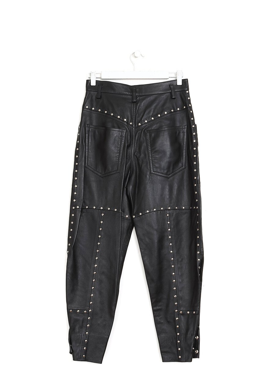 Pantalon en cuir noir clouté. Fermeture boutonnée sur le devant. Taille haute. Poches avant et arrière.