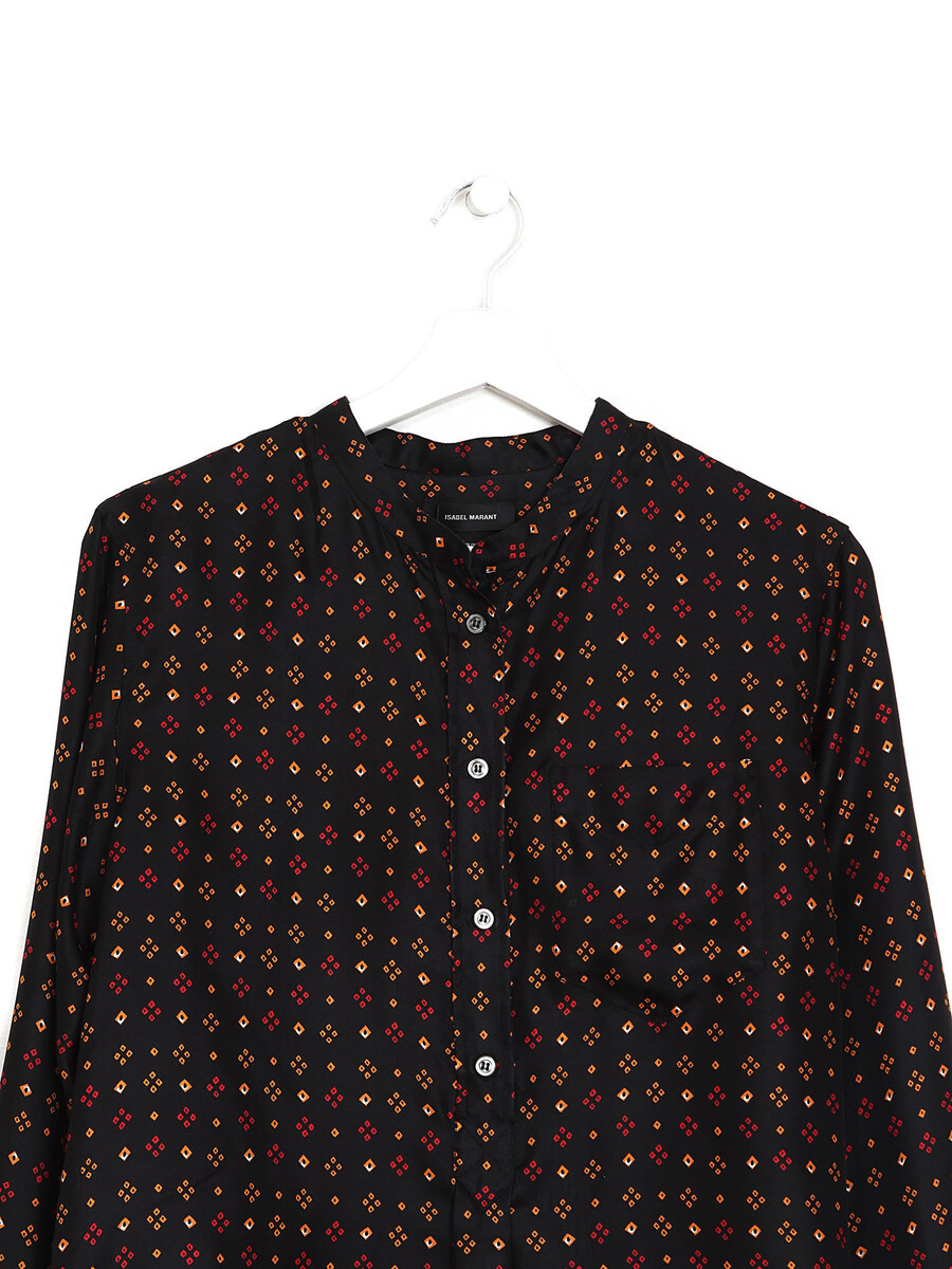 Blouse en soie à manches longues avec motif géométrique en noir, rouge et jaune. Encolure en V. Conception légère et fluide.