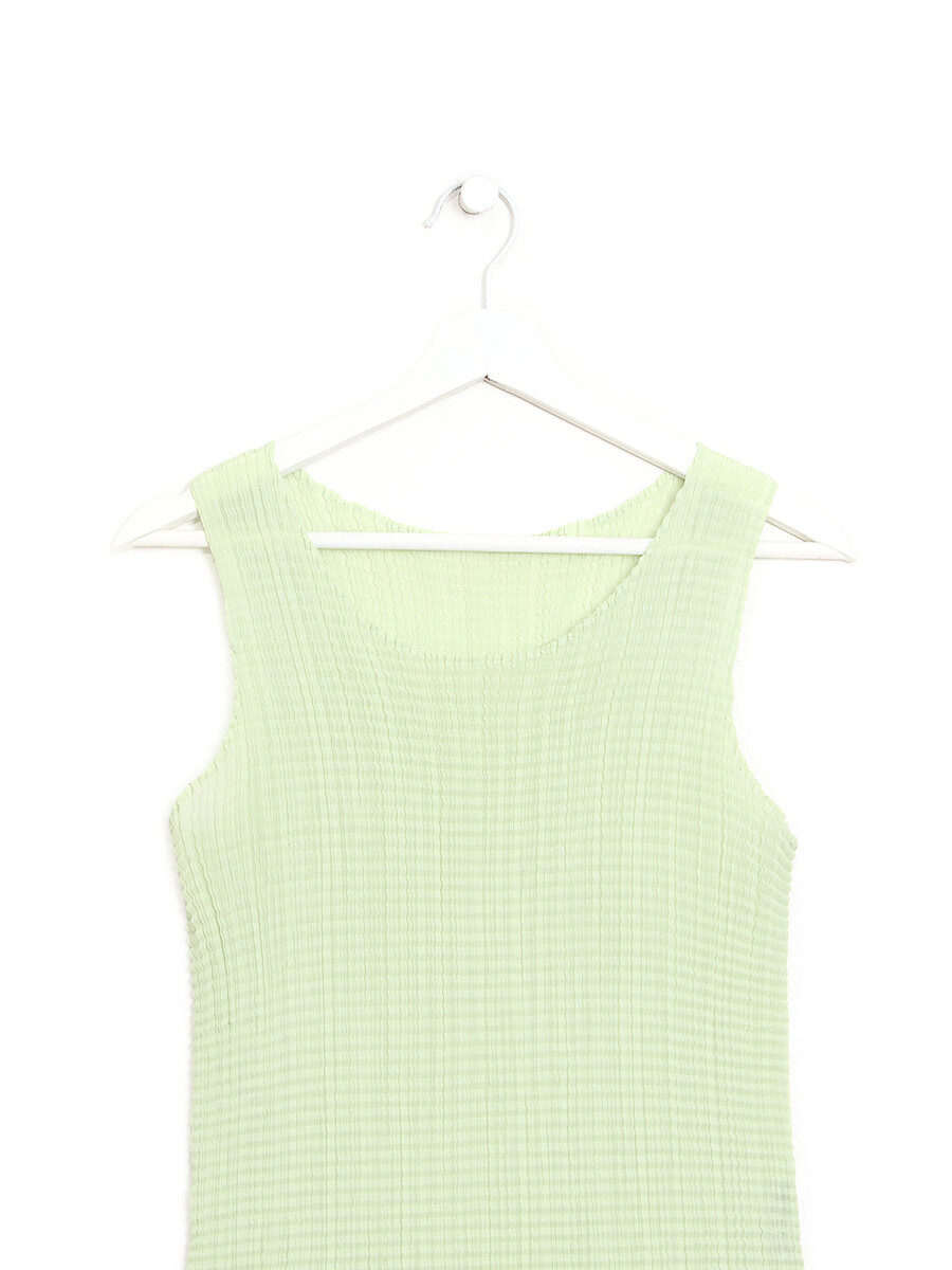 Haut sans manches avec un effet plissé distinctif en vert clair. Silhouette fluide et sculpturale qui rehausse le mouvement et le style.