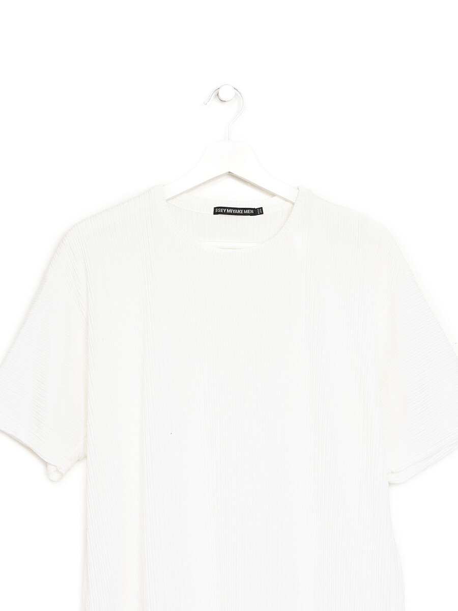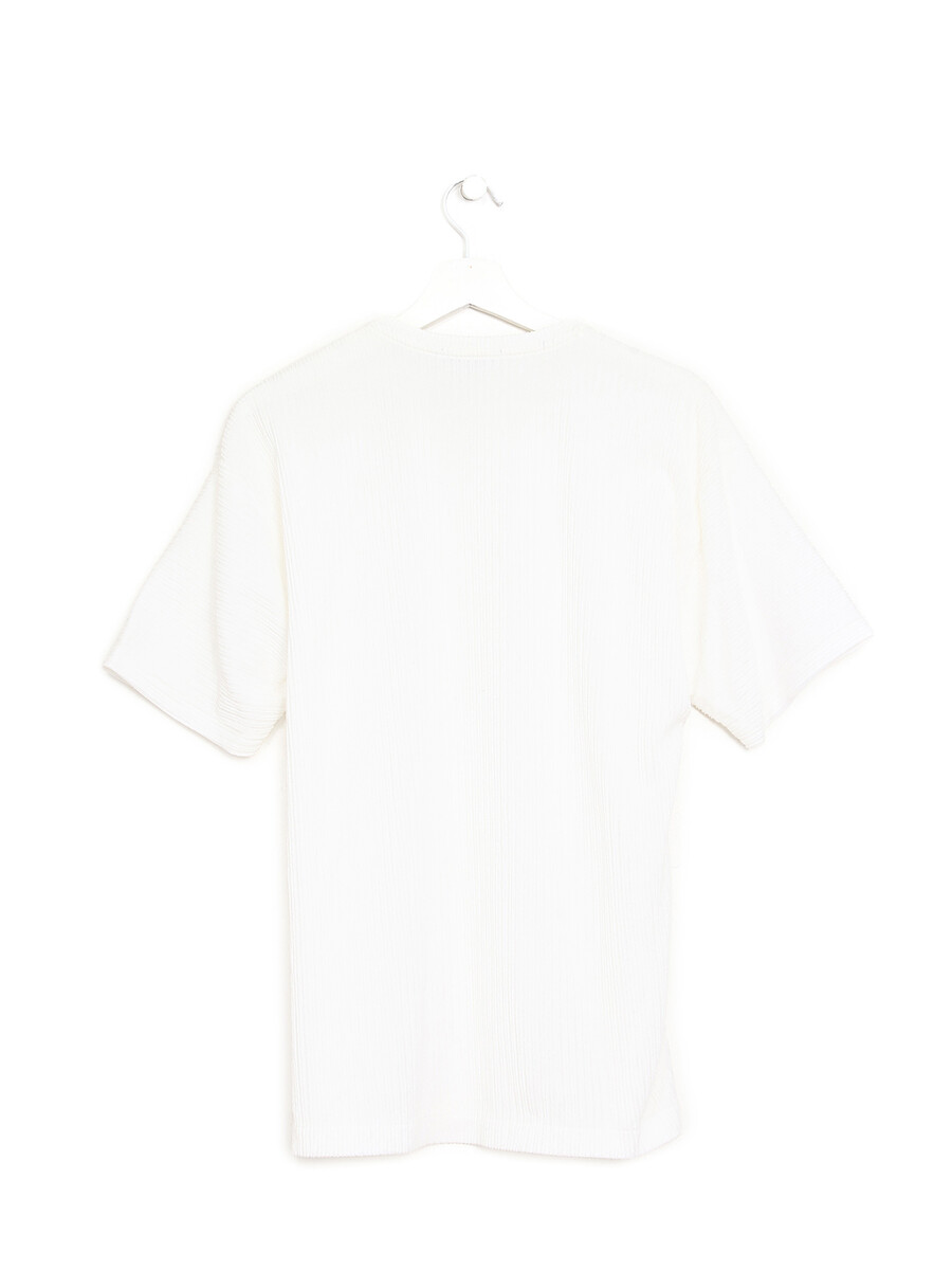 Haut à manches courtes plissé en blanc. Texture plissée unique. Col rond. Coupe décontractée.