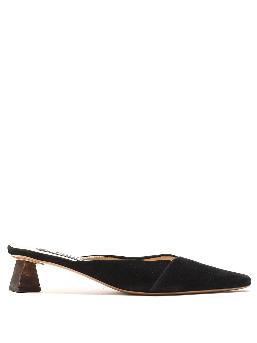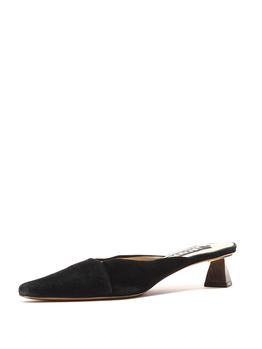 Mules en suède à bout pointu en noir. Semelle en cuir. Conception minimaliste avec une élégance subtile.