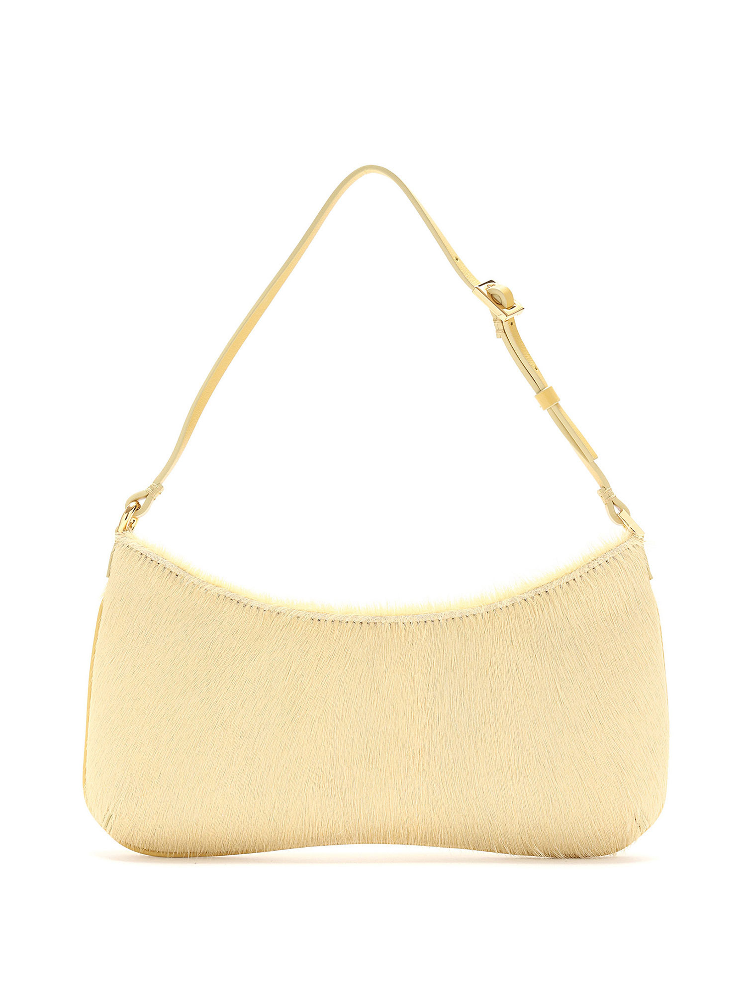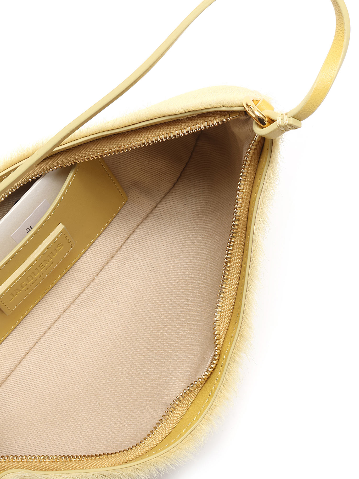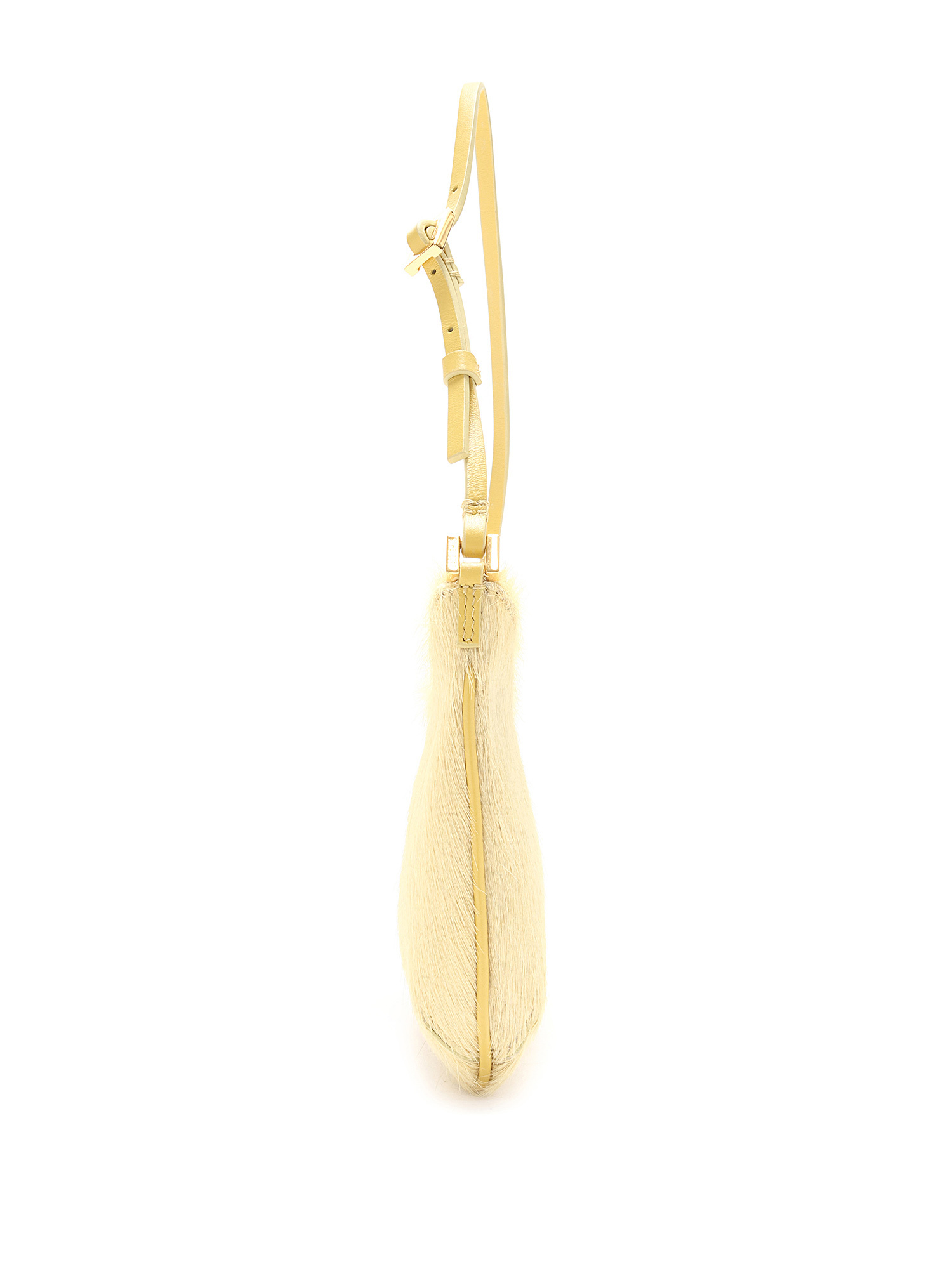 Sac à bandoulière à poil court en jaune clair. Quincaillerie dorée. Bandoulière en cuir ajustable. Fermeture à glissière. Design compact.