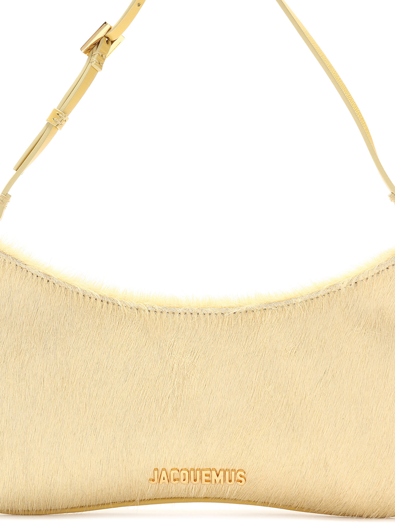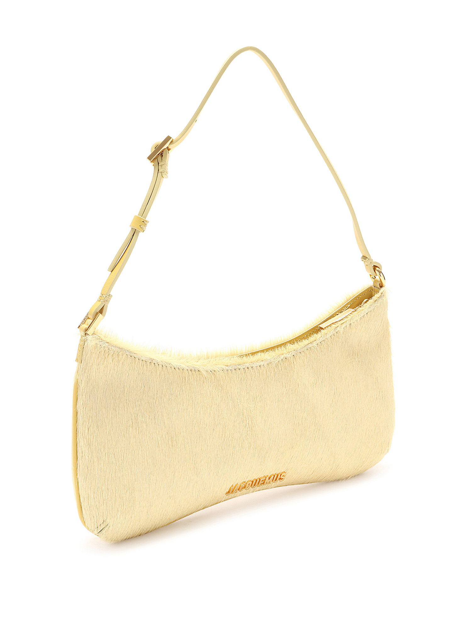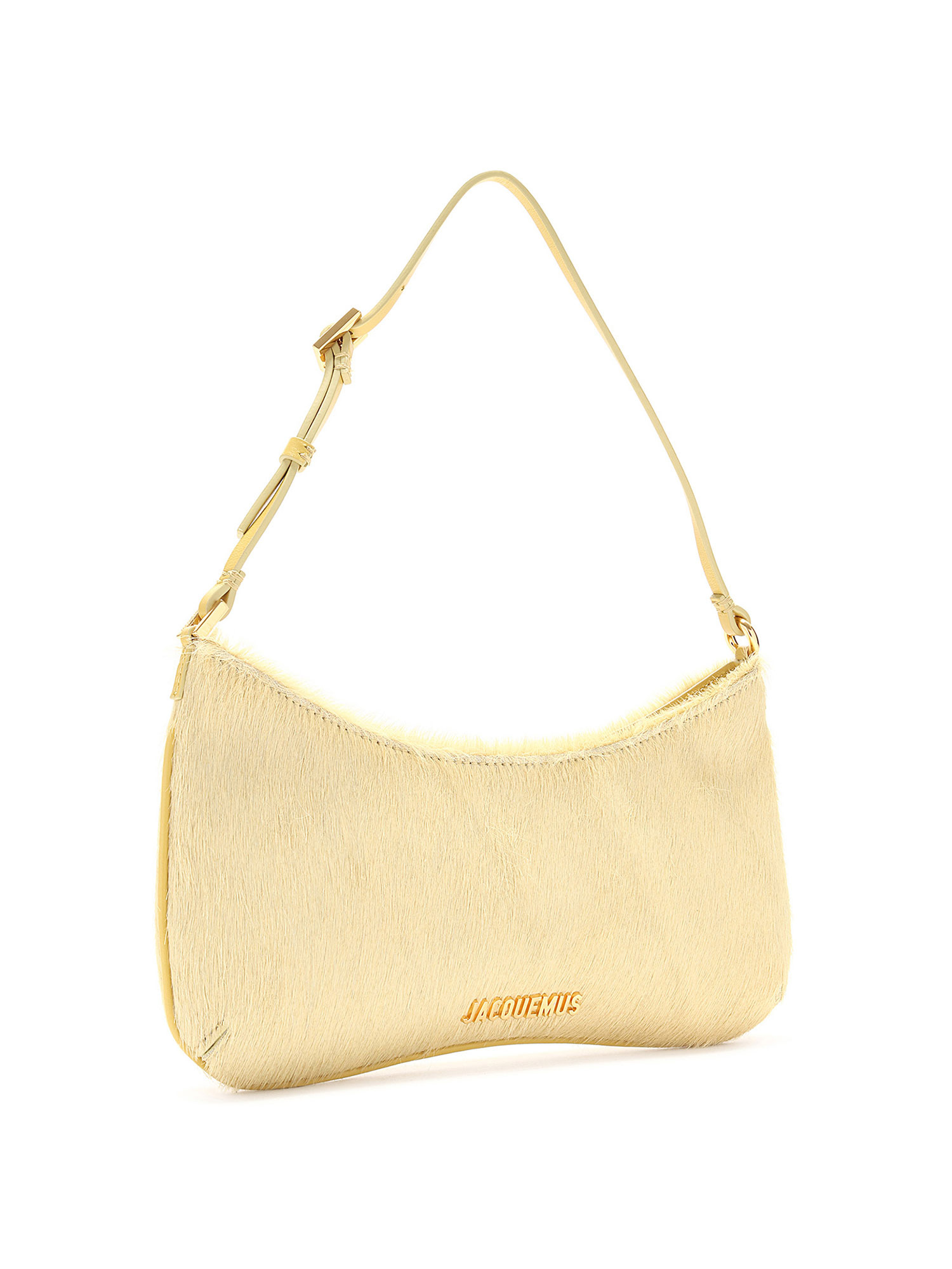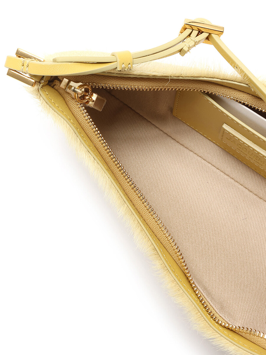 Sac à bandoulière à poil court en jaune clair. Quincaillerie dorée. Bandoulière en cuir ajustable. Fermeture à glissière. Design compact.