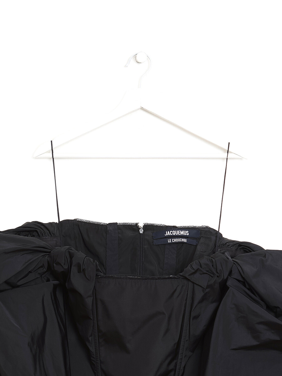 Mini robe noire à manches bouffantes. Silhouette ajustée.
