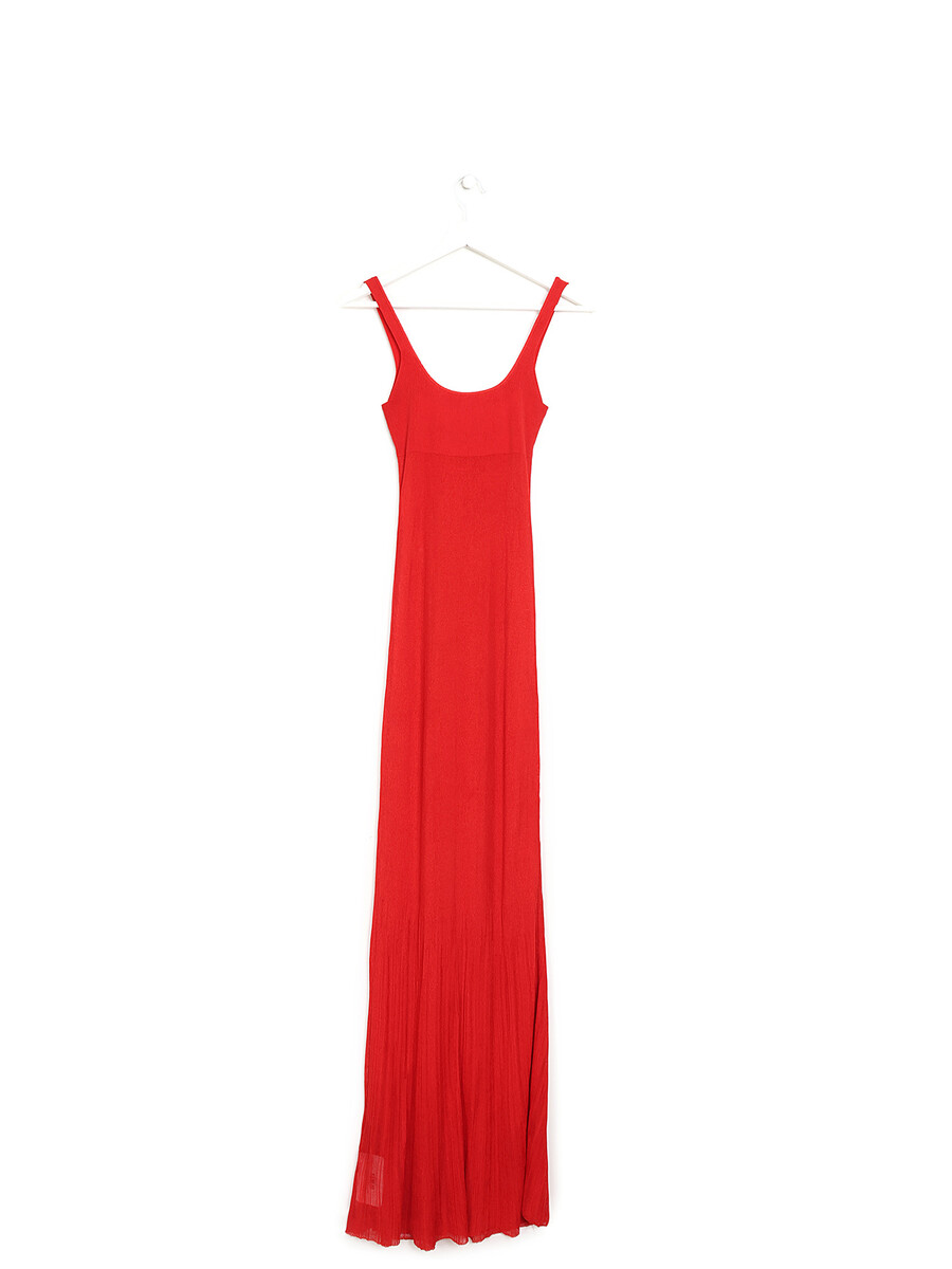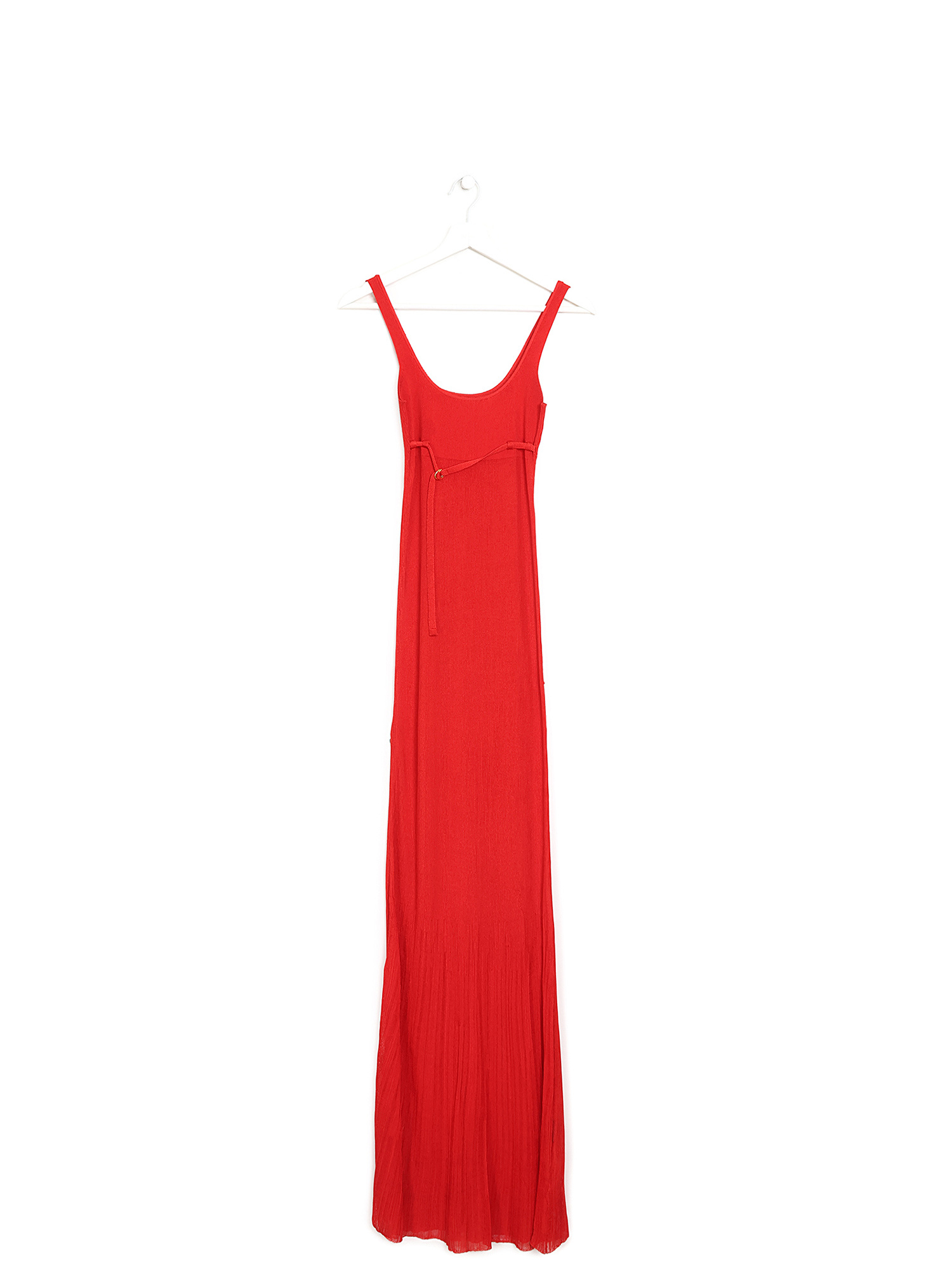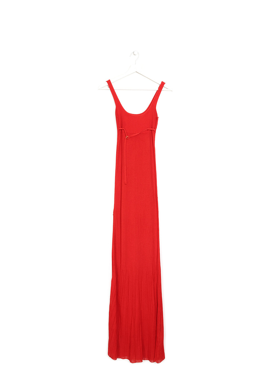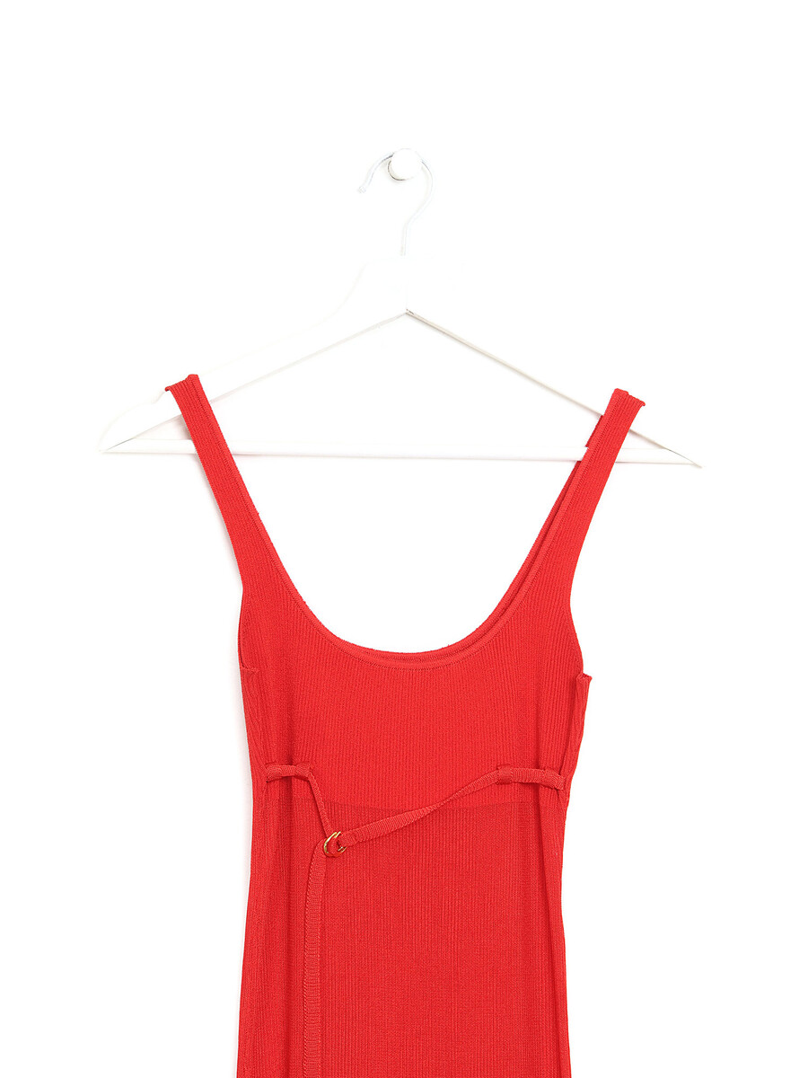 Robe sans manches en tricot extensible rouge. Détail de boucle à ardillon ajustable. Coupe ajustée avec ourlet fluide.